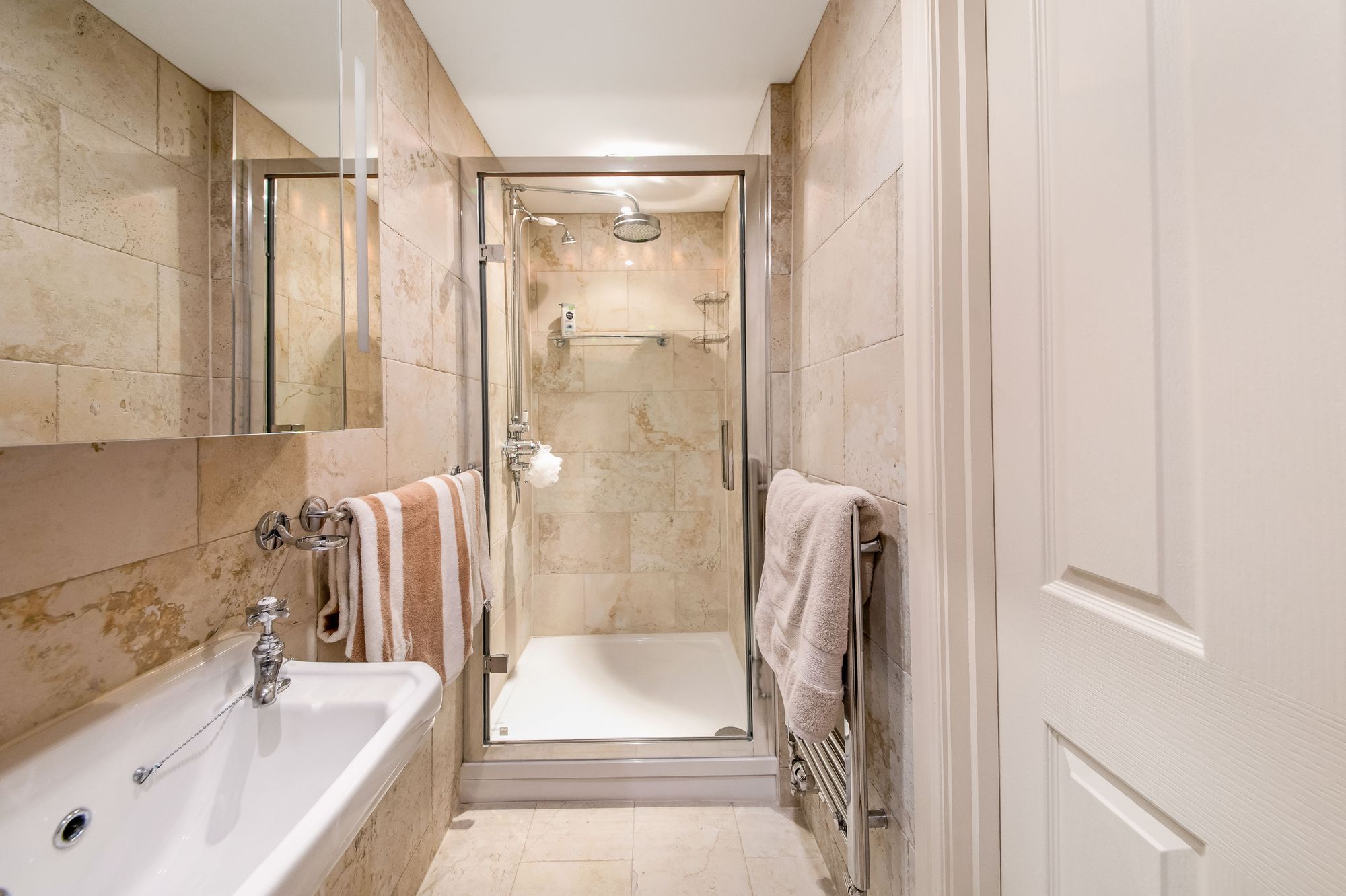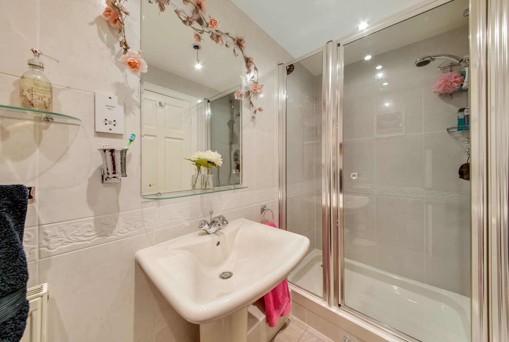 The en-suite shower room features a white traditional style three piece suite comprising of a fixed frame shower cubicle with thermostatic rainfall shower and with separate handheld attachments, a pedestal wash hand basin and a low-level W.C. There is attractive tiled walls and flooring, inset spotlighting to the ceilings, a chrome ladder style radiator and an extractor vent.