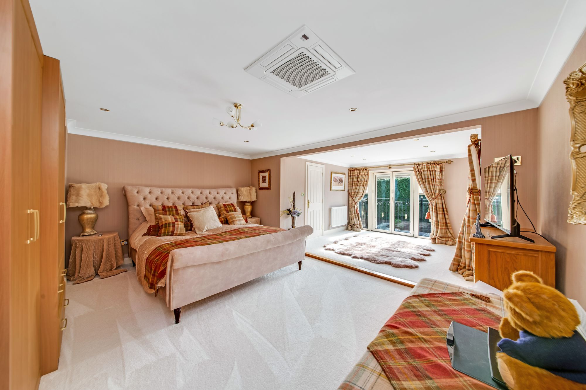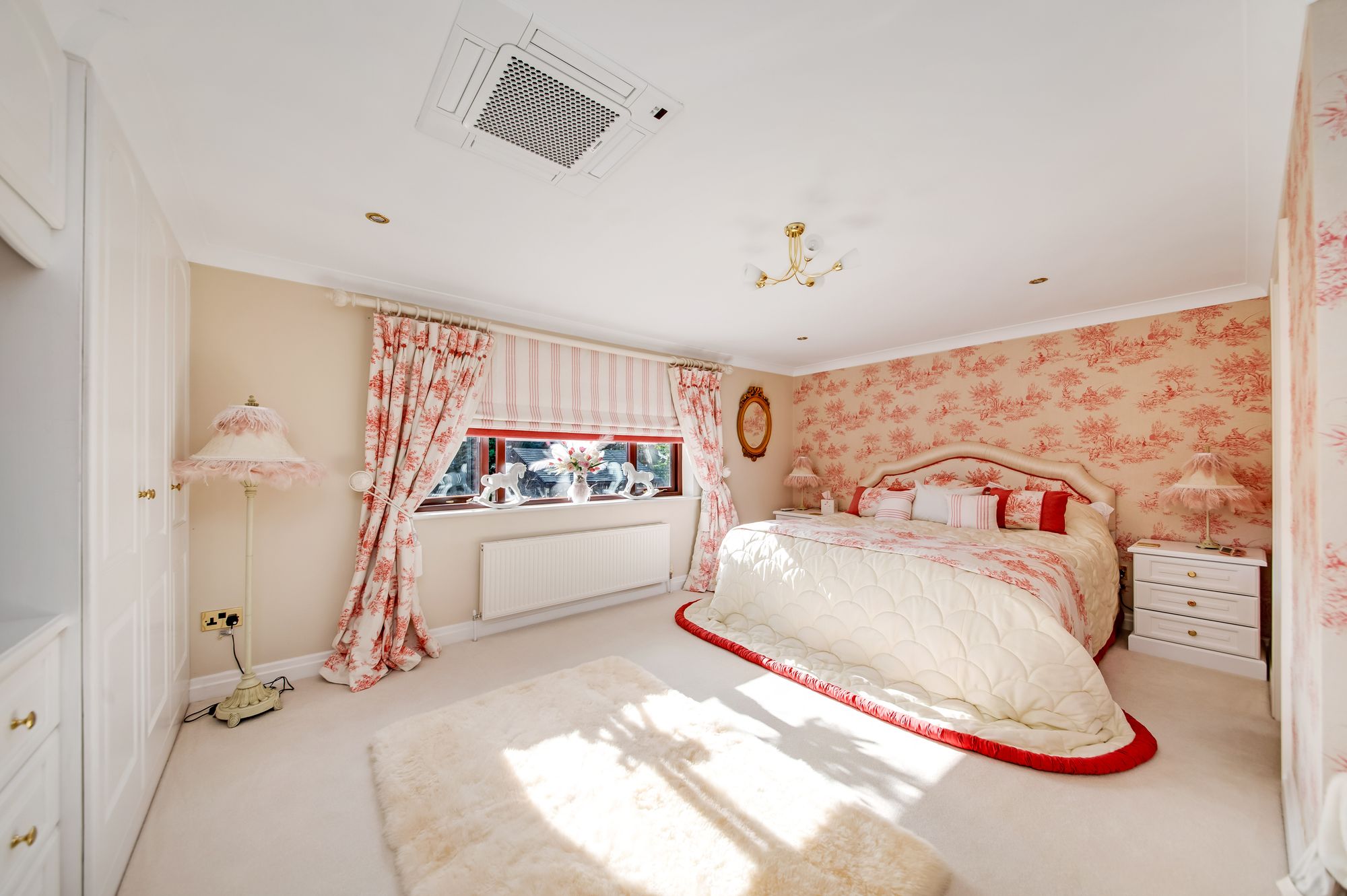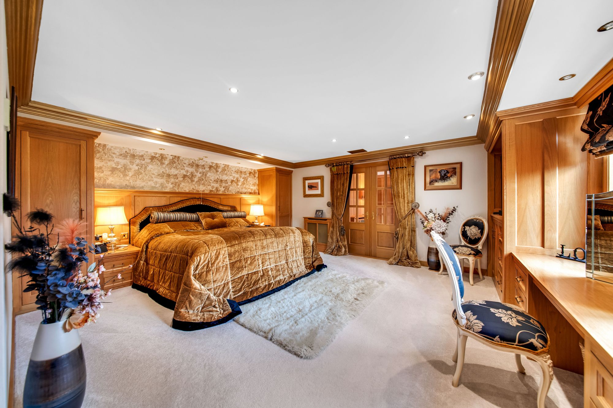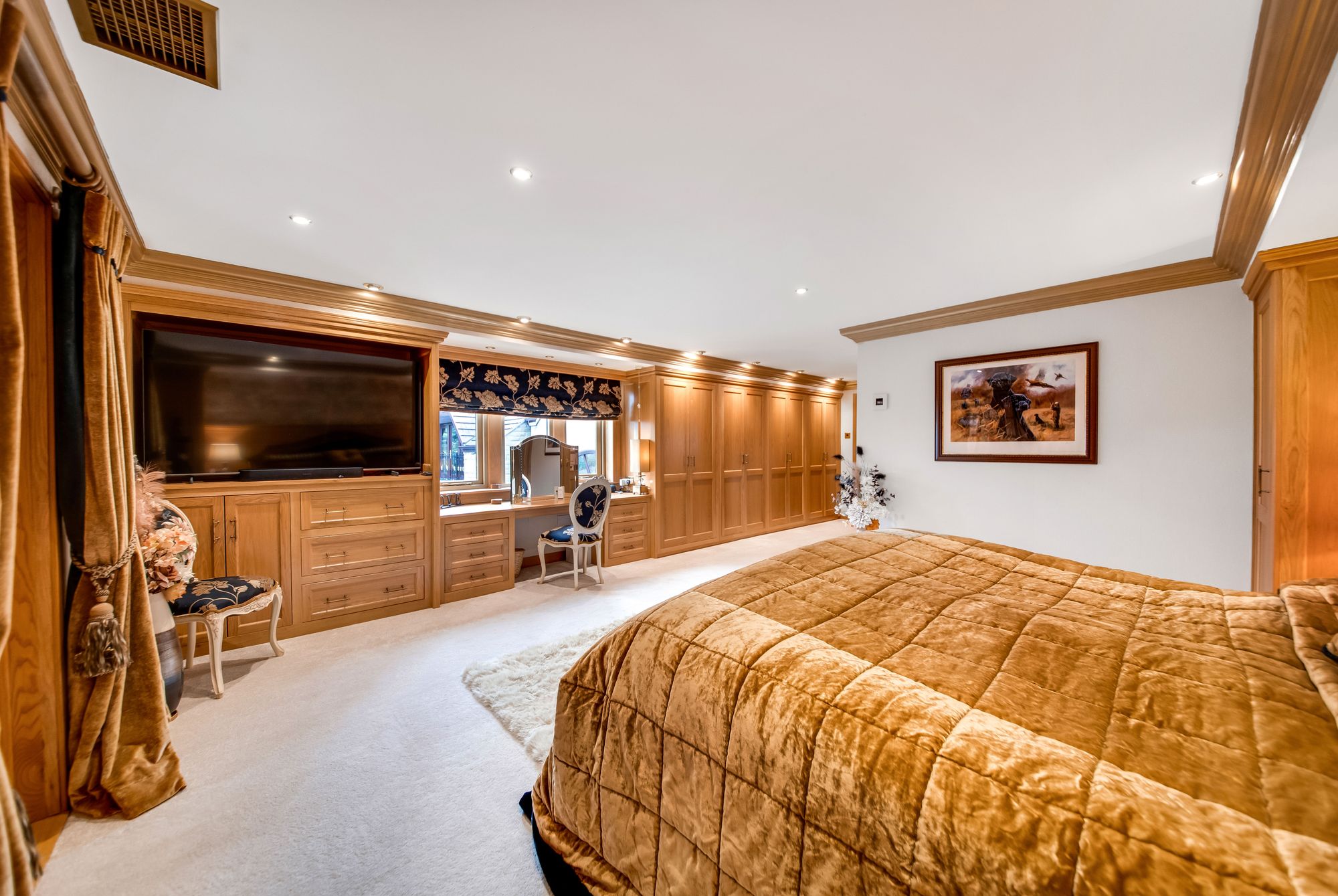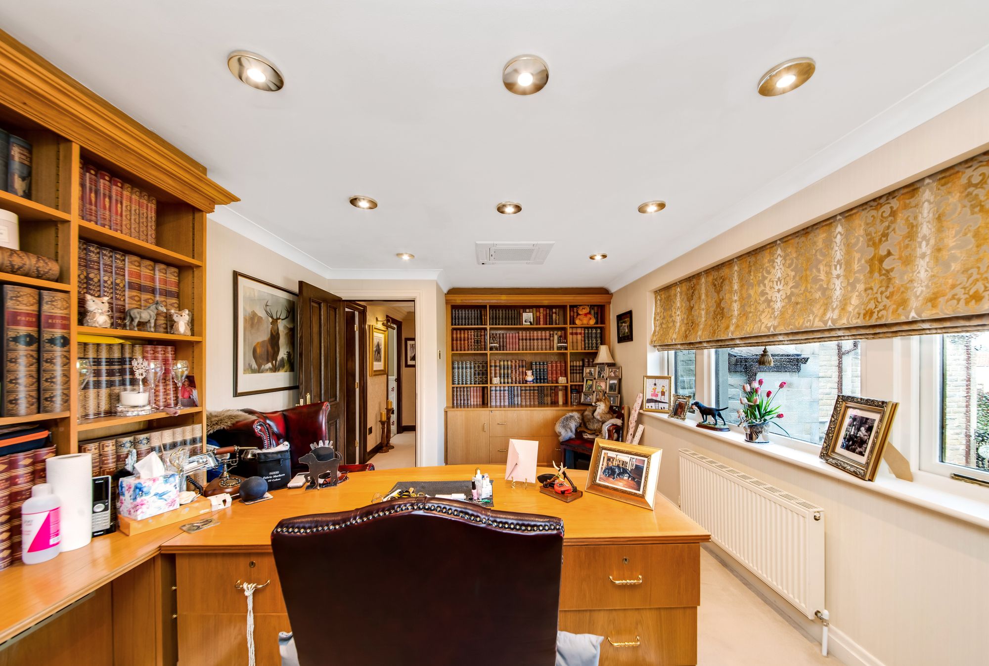 HOME OFFICE/BEDROOM FIVEThe home office connects the east wing to the main portion of the accommodation and is a versatile space which could be utilised as a double bedroom, it is currently utilised as a home office. It features decorative coving to the ceilings, inset spotlighting, a ceiling mounted air-conditioning unit and a radiator. The room features a bank of doubleglazed mullioned windows to the front elevation, bespoke fitted furniture which provides display shelving with cupboards and drawer units for storage and a multipaneled door leads into the cinema room/bedroom six.