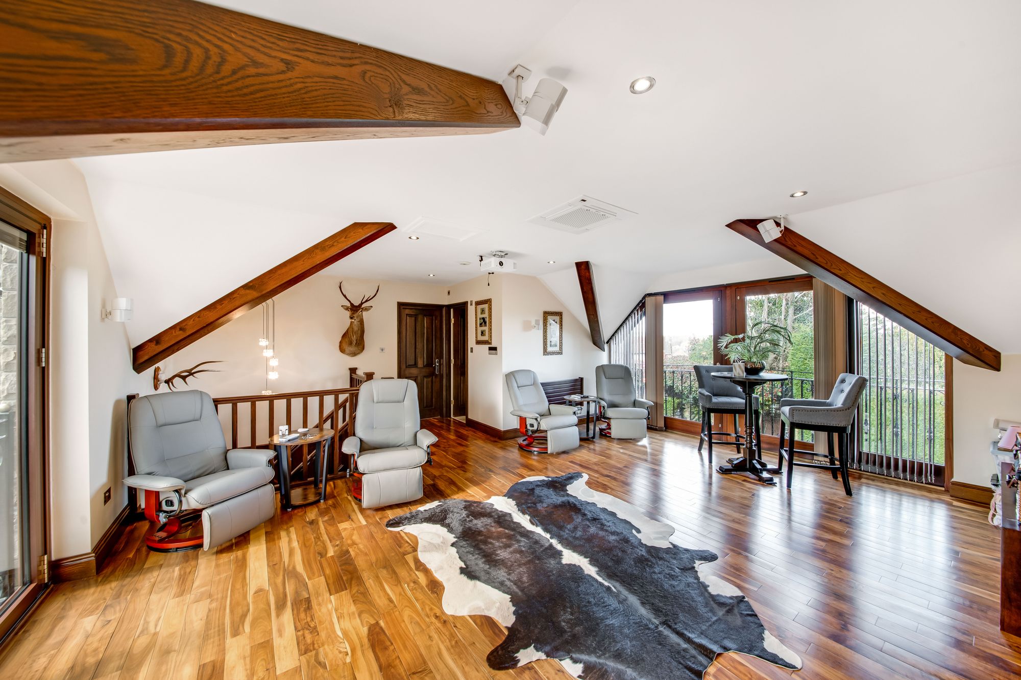 The cinema room can be accessed via the staircase from the games room or the interconnecting door from the home office. It features hardwood flooring and dual aspect windows to both the front and rear elevations with far reaching views across the village over roof tops. There are exposed timber beams to the ceilings, inset spotlighting, a radiator and a horizontal radiator. The bi-folding doors to the rear elevation have integrated blinds and provide access to the terrace. To the front elevation there are twin timber double glazed Juliette balconies with fantastic views onto the courtyard. There are multipaneled doors providing access to the gym and shower room.
