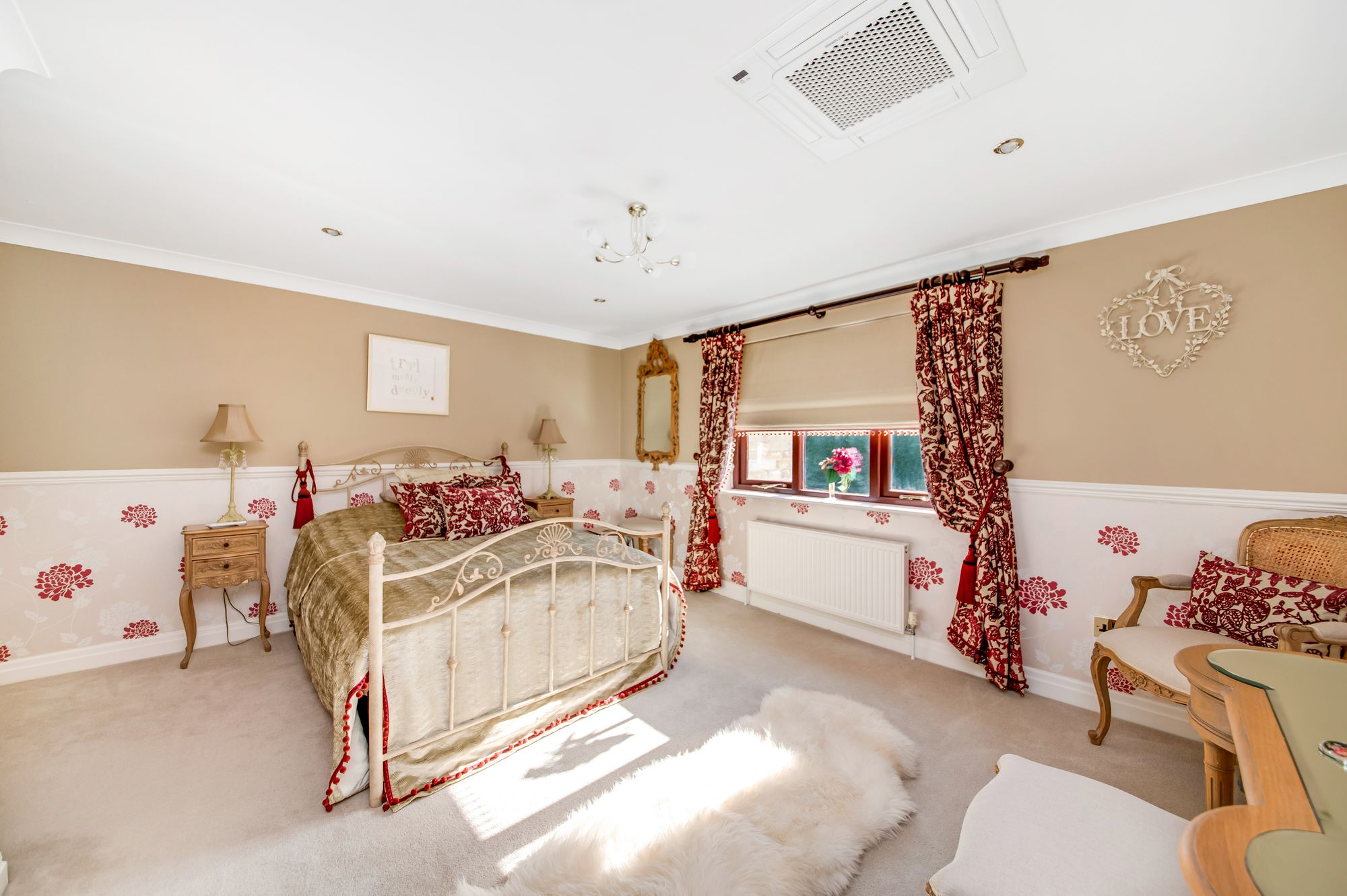 Bedroom three is a double bedroom which has ample space for free standing furniture. There is decorative coving to the ceilings, inset spotlighting, a central ceiling light point, decorative dado rail and a radiator. Additionally, there is a bank of double-glazed windows to the rear elevation with pleasant views across the property’s gardens, a ceiling mounted air-conditioning unit and the room benefits from an en-suite shower room.