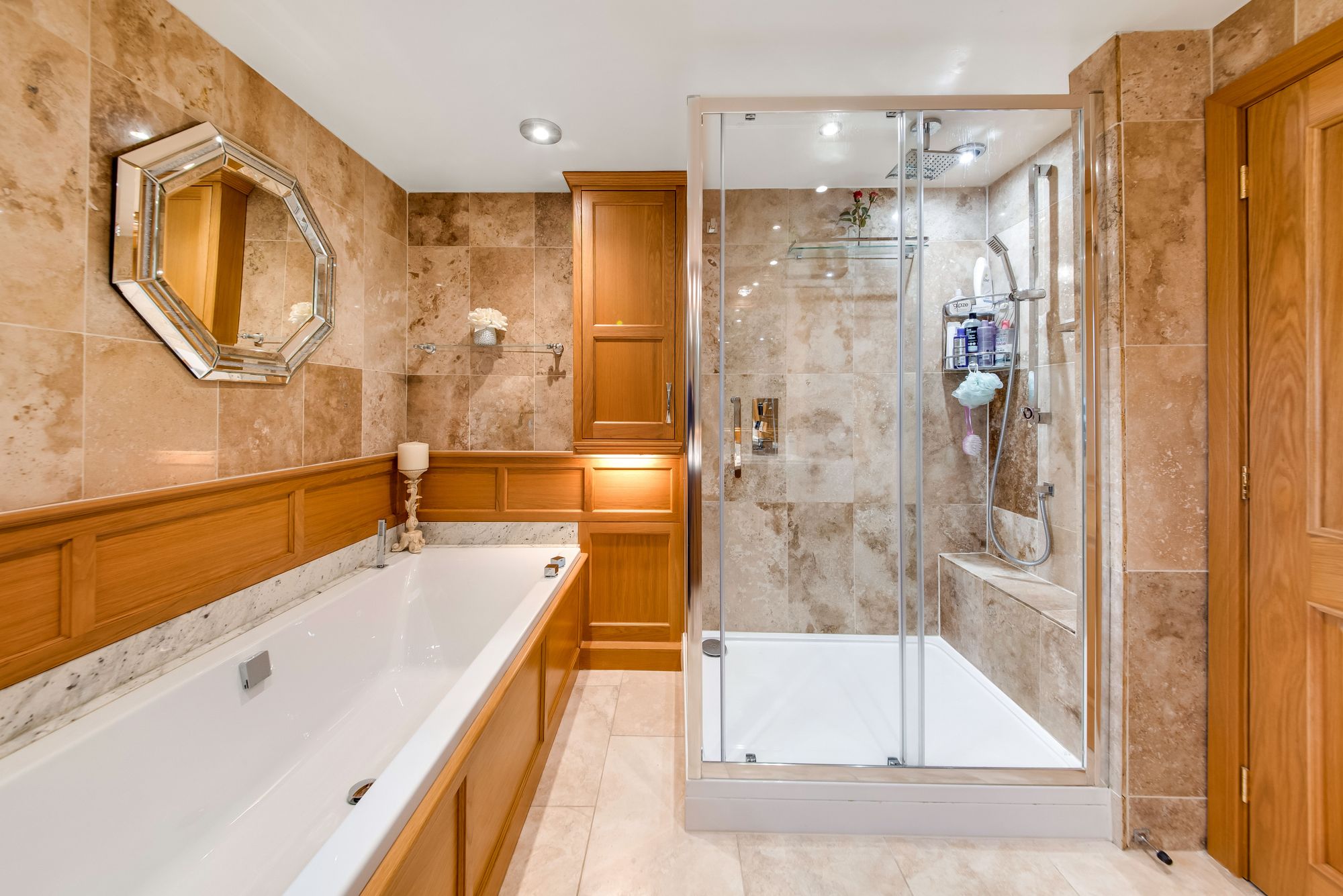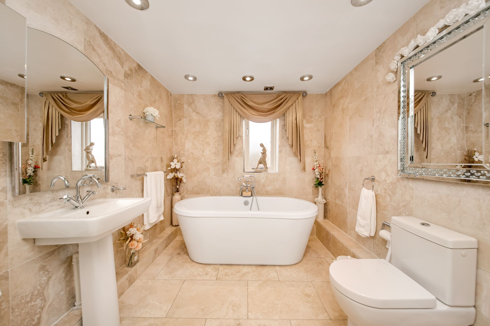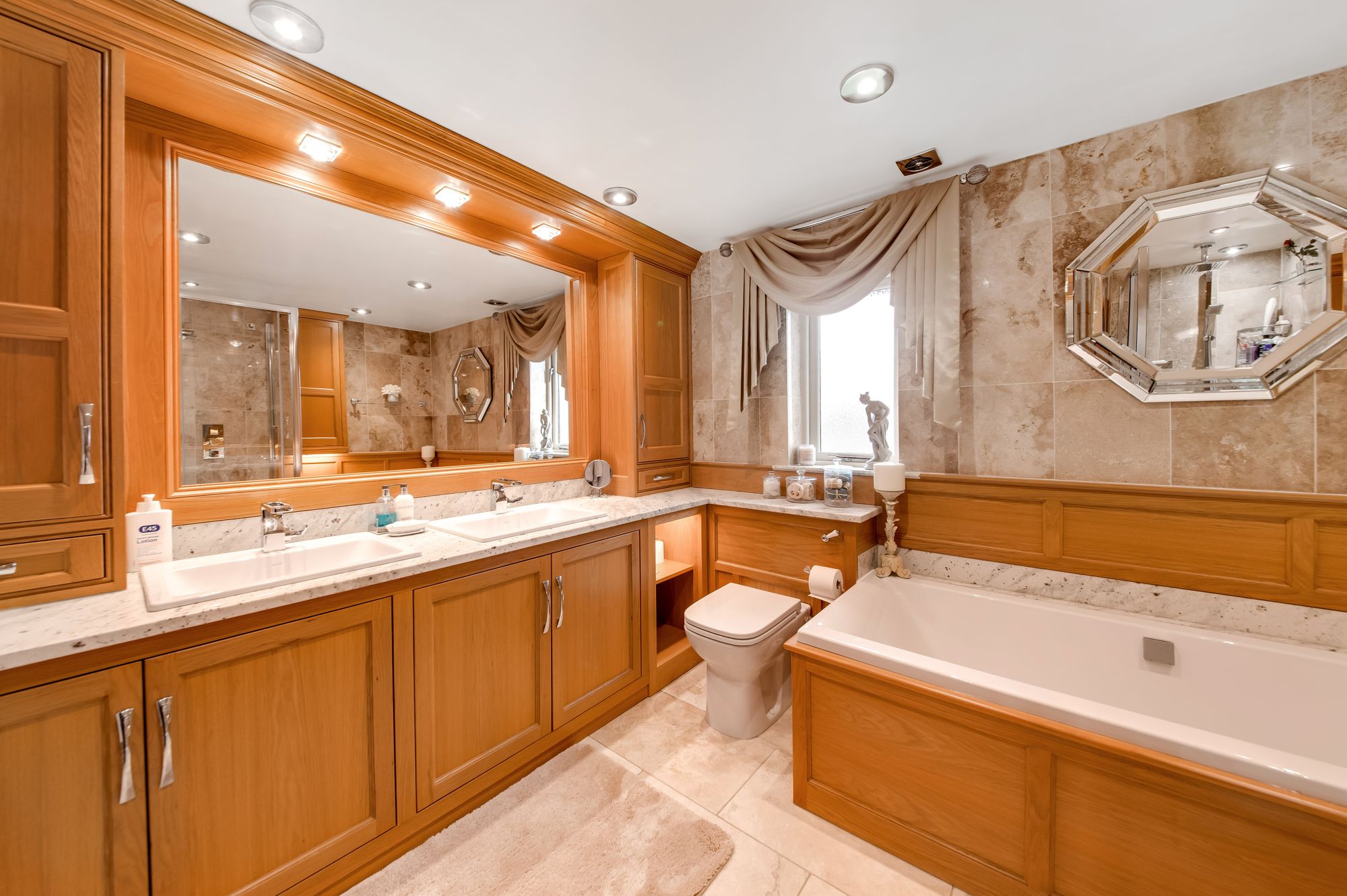 The luxury en-suite bathroom features a high quality five-piece suite which comprises of twin wash hand basins set upon a vanity unit with granite work surfaces, matching upstand and a vanity mirror with pelmet lighting above. The bathroom also features a double ended inset bath with bath end filler cap and separate handheld attachments, a low-level W.C with concealed cistern and a fixed frame shower cubicle with thermostatic rainfall shower and a separate handheld attachment. There is attractive tiled flooring and tiled walls, inset spotlighting to the ceilings, a chrome ladder style radiator and an extractor fan. Additionally, there is a double-glazed window with obscured glass to the side elevation and the lighting is on a remote sensor.