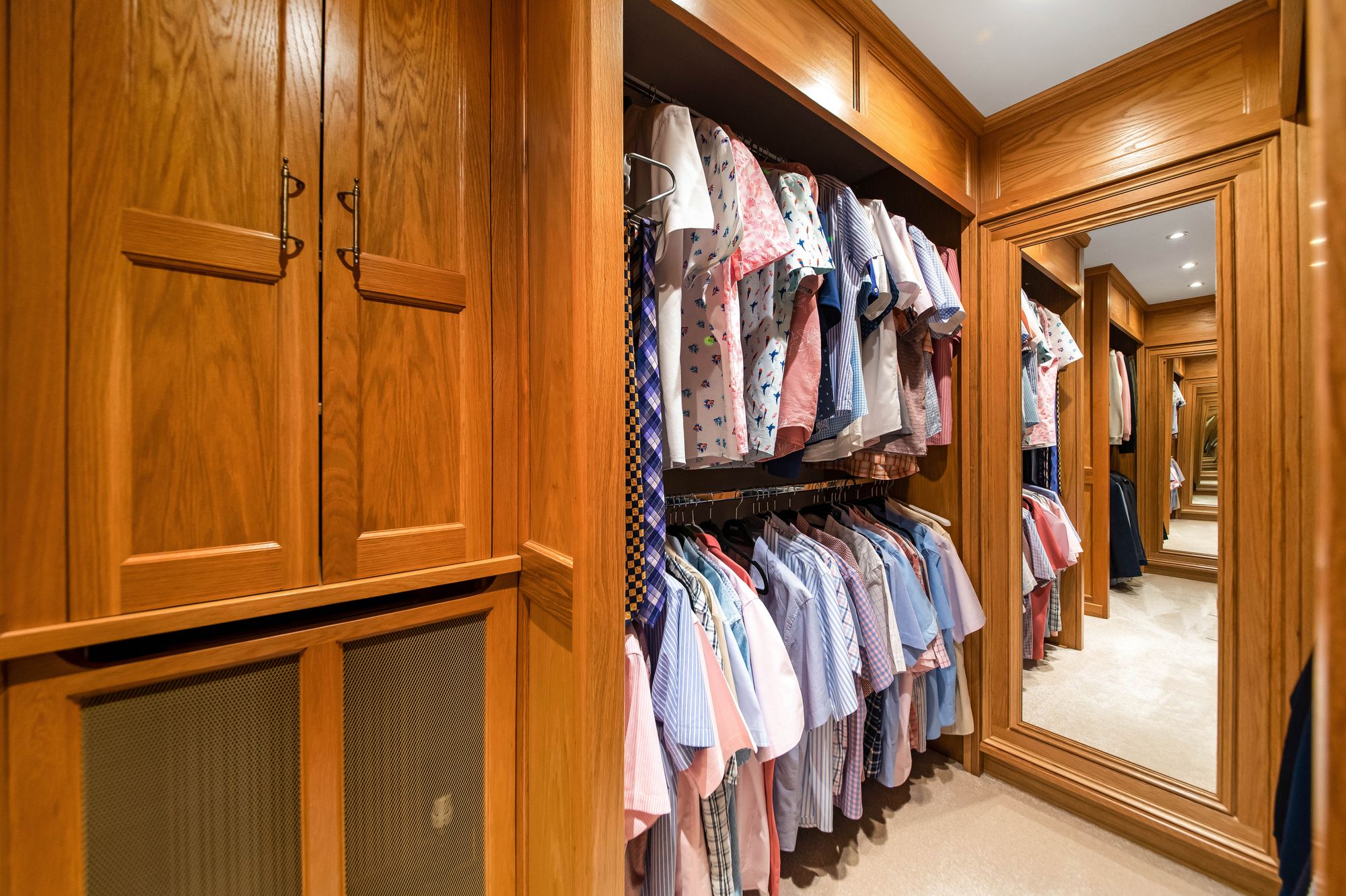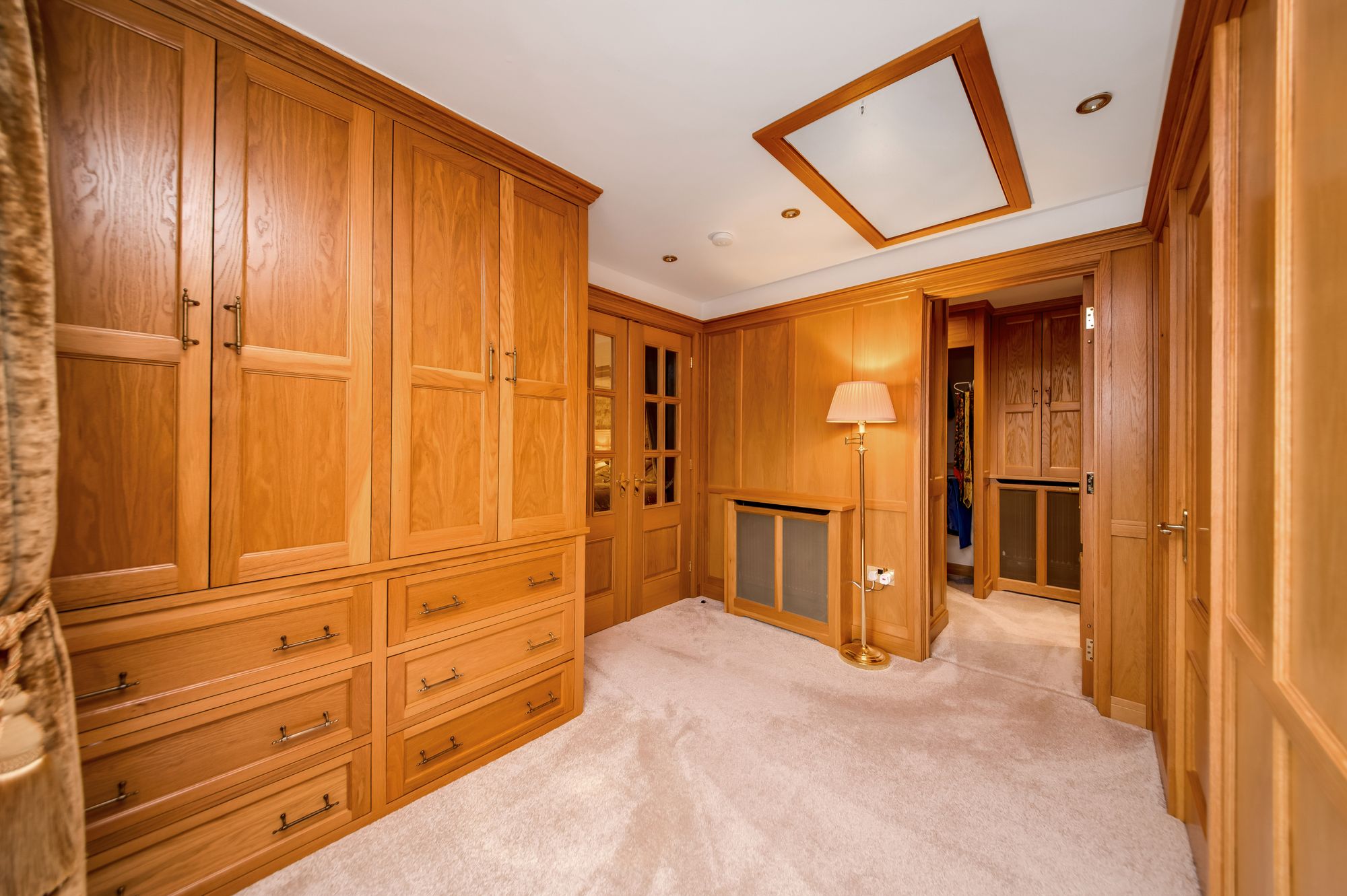 THE DRESSING ROOMThe dressing room enjoys a great deal of natural light with a double-glazed Juliet balcony with adjoining windows to the side elevation which has pleasant views across the property’s courtyard and the driveway that approaches. There is inset spotlighting to the ceilings on a remote sensor, decorative wall panelling and a radiator. There are beautiful, fitted wardrobes with drawer units beneath, a walk-in wardrobe and a walk-in principal closet which has hanging rails and shelving in situ.