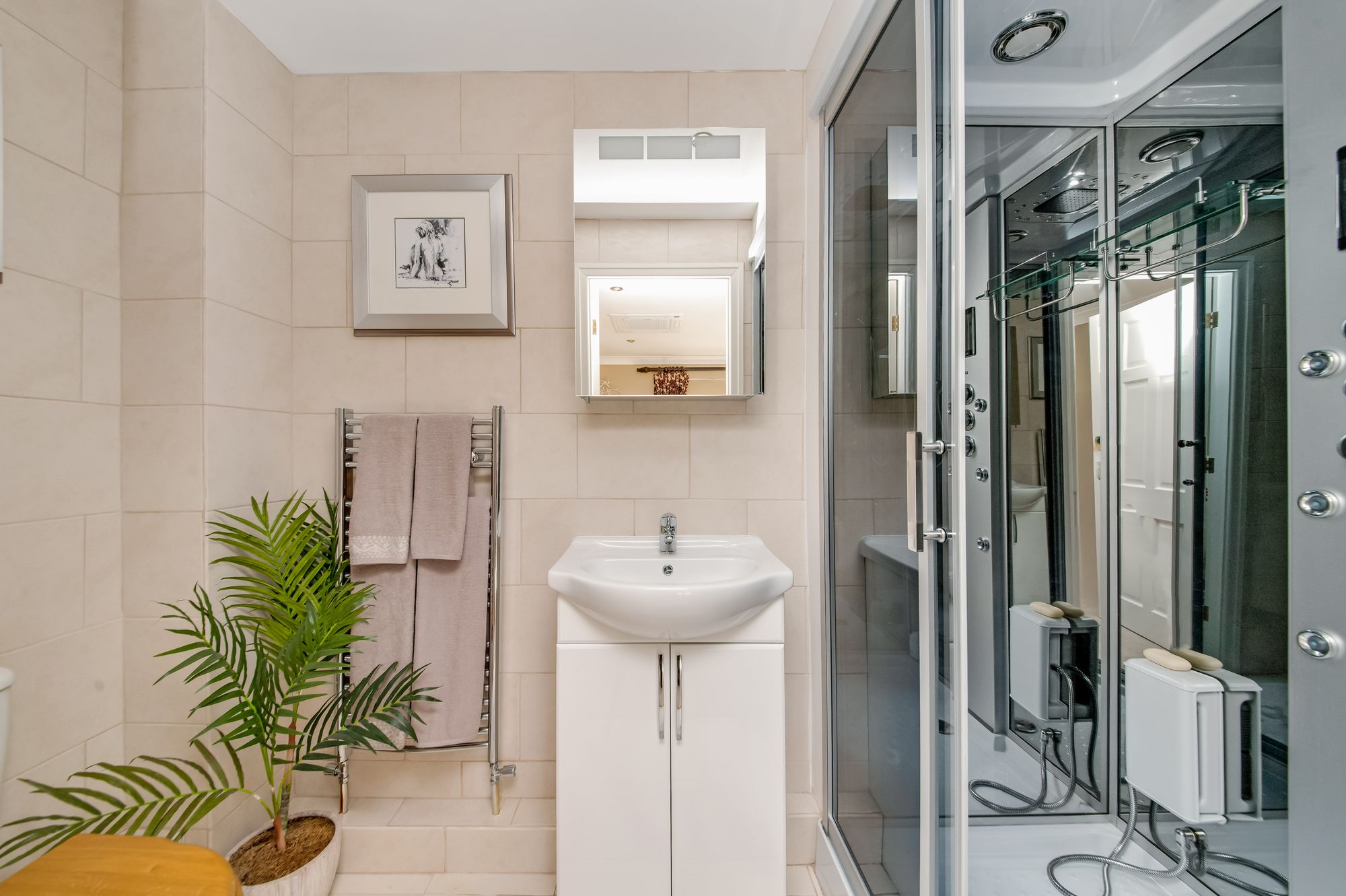 and shoes. The utility has inset spotlighting to the ceilings, a horizontal ladder style radiator,