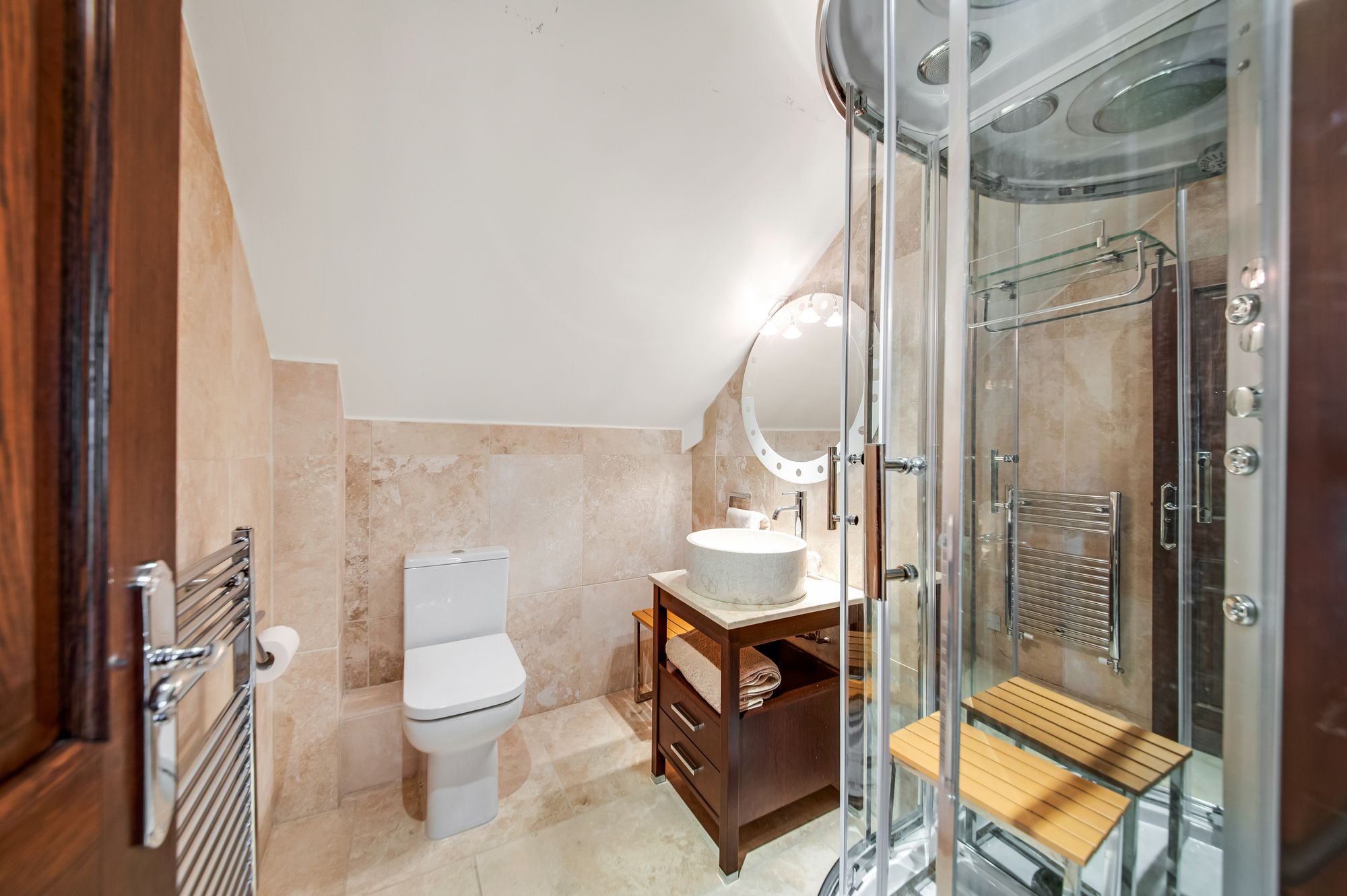 The shower room features a modern white three-piece suite which comprises of a stone sink with a chrome monobloc mixer tap set upon a bespoke vanity unit with drawer units beneath, a low-level W.C. with push button flush and a quadrant style multi jet rainfall shower, an integrated speaker system and Bluetooth connectivity. There are tiled walls and tiled flooring, inset spotlighting to the ceilings, a chrome ladder style radiator and an extractor fan.