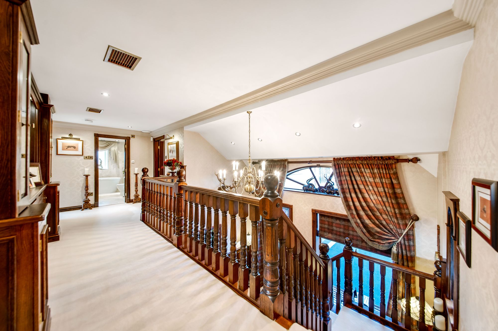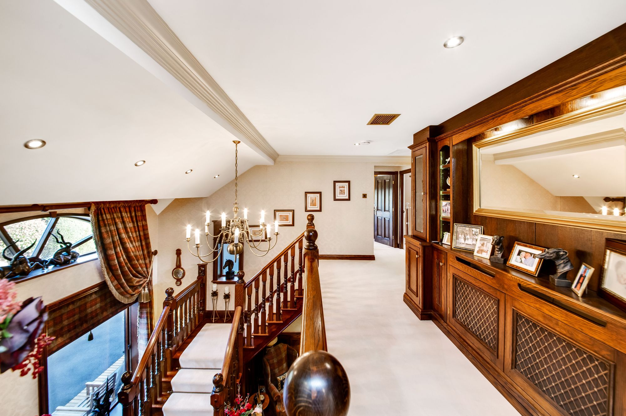 Taking the kite winding staircase from the entrance hall you reach the galleried landing which features a beautiful handrail with spindle balustrade and traditional newel posts. There is decorative cornice into the ceilings, inset spotlighting, three wall light points and a chandelier point. There are multipaneled doors providing access to the bedroom and bathroom accommodation.