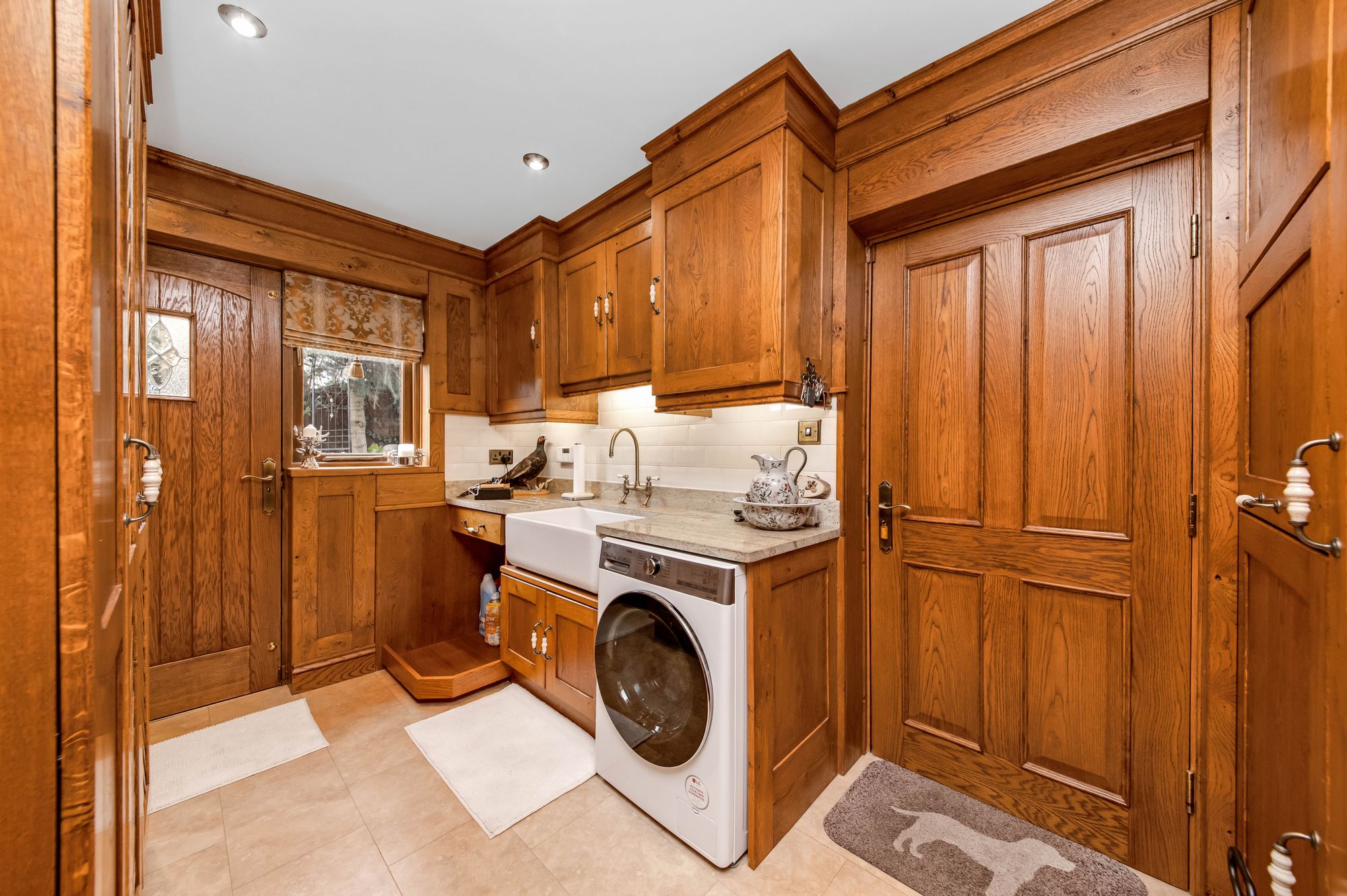 the utility room. The utility features a wide range of fitted wall and base units with oak shaker