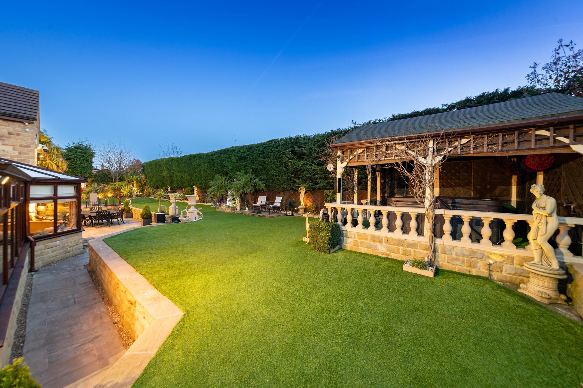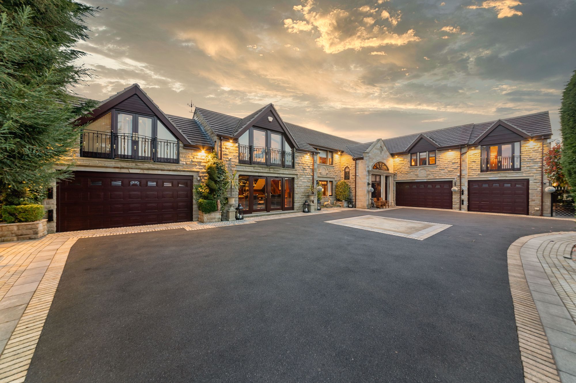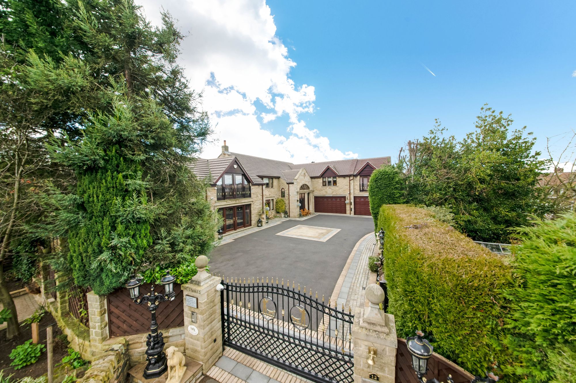 The property briefly comprises of reception hall, downstairs WC, lounge, formal dining room, breakfast kitchen, garden room, utility room, games room and two double garages and a spacious single garage to the ground floor. To the first floor there is a galleried landing, principal bedroom suite with ensuite bathroom, dressing room and walk-in wardrobe. As the floorplan suggests there are four/five versatile bedrooms with four ensuite facilities and a family bathroom. There is a gym and sun terrace, and the west wing of the property could be separated to create annex accommodation. Externally there is a private, gated courtyard providing off street parking for multiple vehicles and with various up lighting and well stocked flower and shrub beds, to the rear is a beautiful enclosed and private garden with artificial lawn with Indian stone flagged patio areas ideal for alfresco dining and BBQ'ing, gazebo, hot tub and garden kitchen. There is an externally accessed gardeners WC and particularly private grounds with mature trees and hedges.