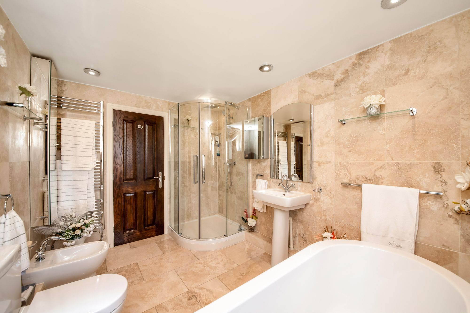 HOUSE BATHROOMThe house bathroom features a modern contemporary five-piece suite which comprises of a freestanding, double ended bathtub with shower head mixer tap, a low-level W.C. with push button flush, a pedestal wash hand basin, bidet and a fixed frame, quadrant style shower cubicle with thermostatic shower. There are attractive tiled walls and flooring, inset spotlighting to the ceilings, a double-glazed window with obscure glass and a chrome, ladder style radiator.