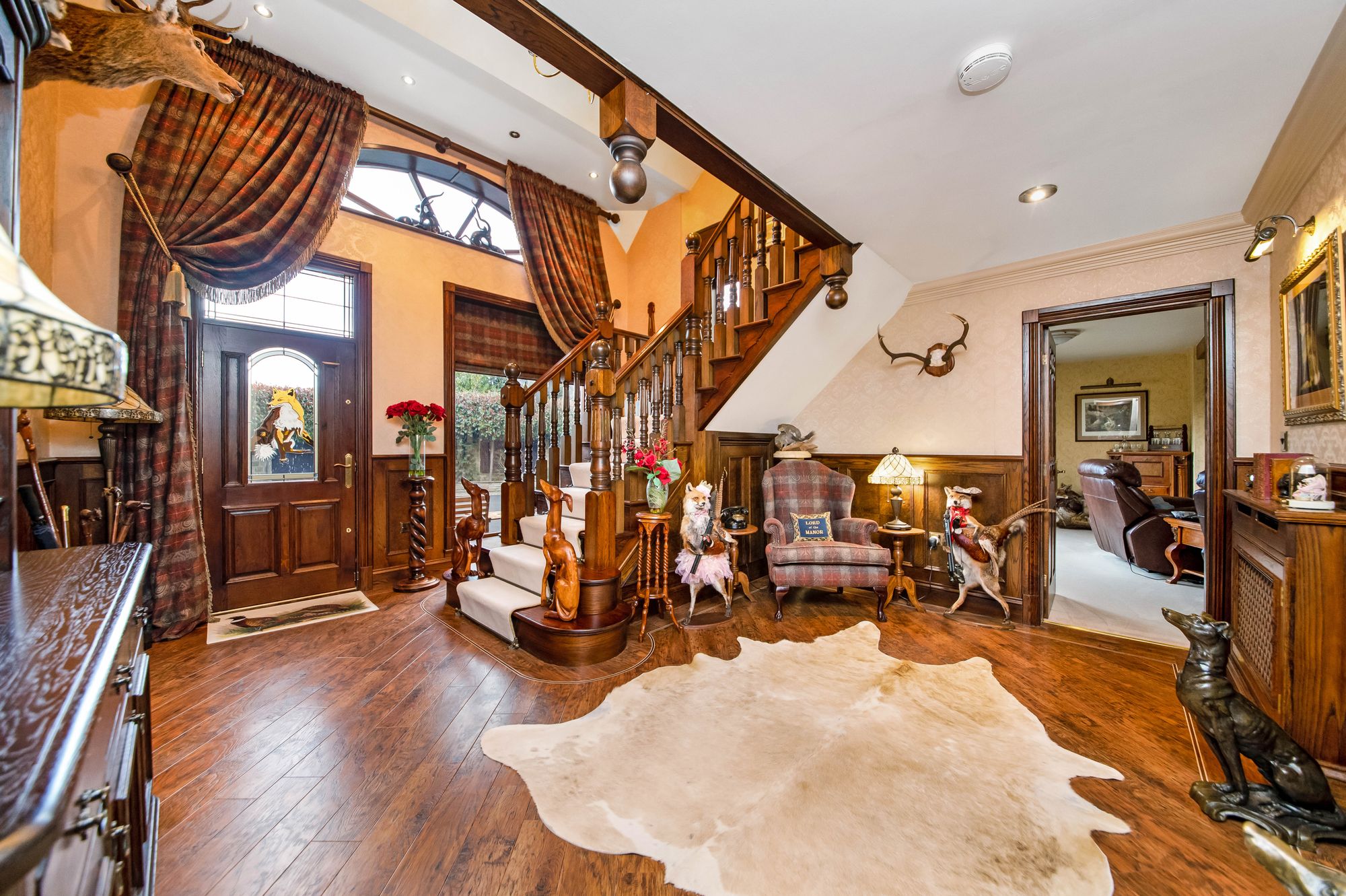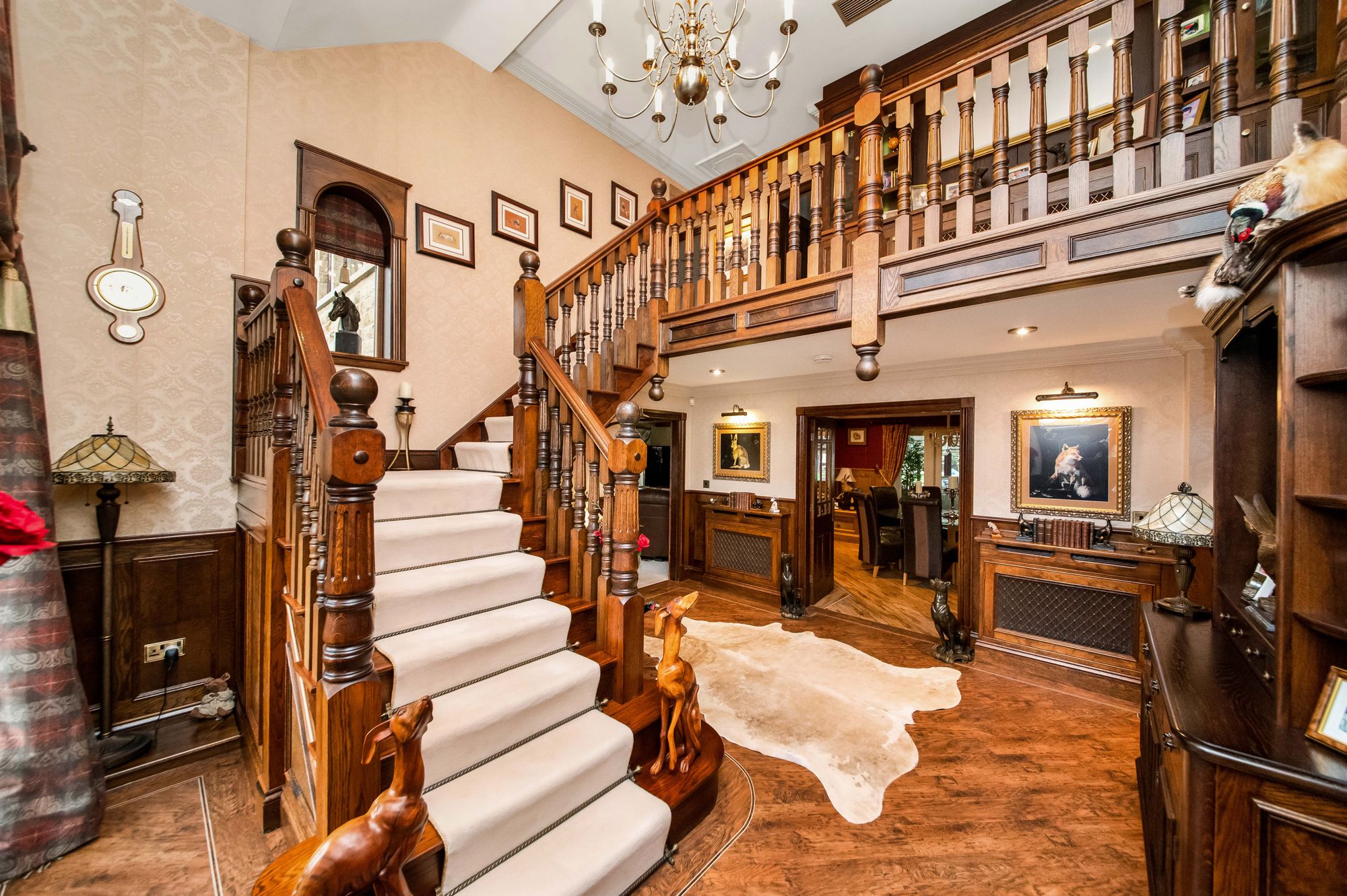 Enter the property through a fabulous timber and double-glazed front door with stained glass inserts and leaded detailing into the entrance hall. The entrance hall has a beautiful kite winding staircase with central carpet runners that leads to a galleried landing. There is inset spotlighting to the ceilings, a chandelier point and high quality Amtico flooring. There are doors providing access to the downstairs W.C., the open plan dining kitchen, double multipaneled timber and glazed doors proceed to the formal dining room and a door proceeds through to the lounge. There is a decorative dado rail with wall panelling beneath, and there are dual aspect windows with a picture window and an arched window to the front elevation and a further window to the side. The staircase features beautiful newel posts, wooden handrails and spindle balustrade. There are two radiators, decorative cornice into the ceilings and two wall light points.