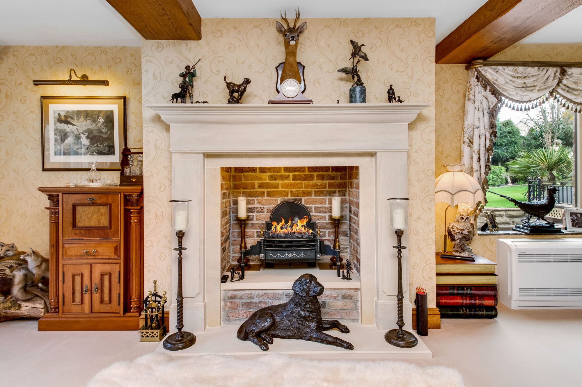 fireplace with a beautiful limestone surround and a living flame effect gas fire with natural