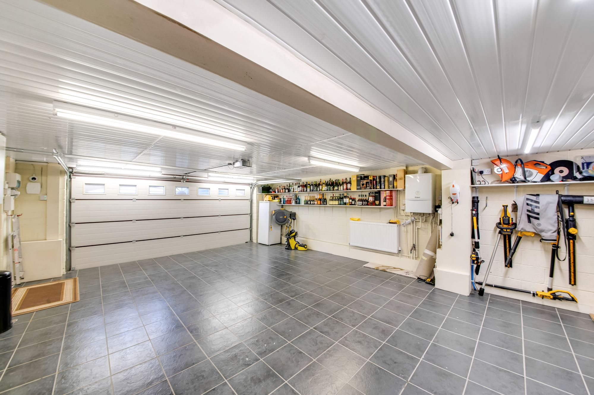 The main garage is accessed via two sectional remote controlled up and over doors and are separated into a double and a single area, both of which with radiators, lighting and power in situ. There are various wall units with shelving, tiled flooring and a pedestrian access door to the rear elevation. The garage houses the property boiler and hot water