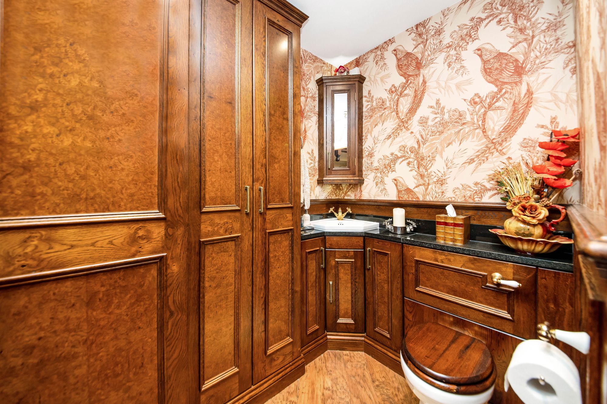 Returning to the entrance hall, the high-quality flooring continues through into the downstairs W.C. which features remote sensor inset spotlighting to the ceilings, a decorative dado rail with wall panelling beneath, a radiator and an extractor fan. The downstairs W.C. features a two-piece Burlington suite which comprises of a low-level W.C. with concealed cistern and a wash hand basin with vanity cupboards beneath. There are matching cloaks cupboards for additional storage and a granite top with matching granite upstand to the vanity unit.