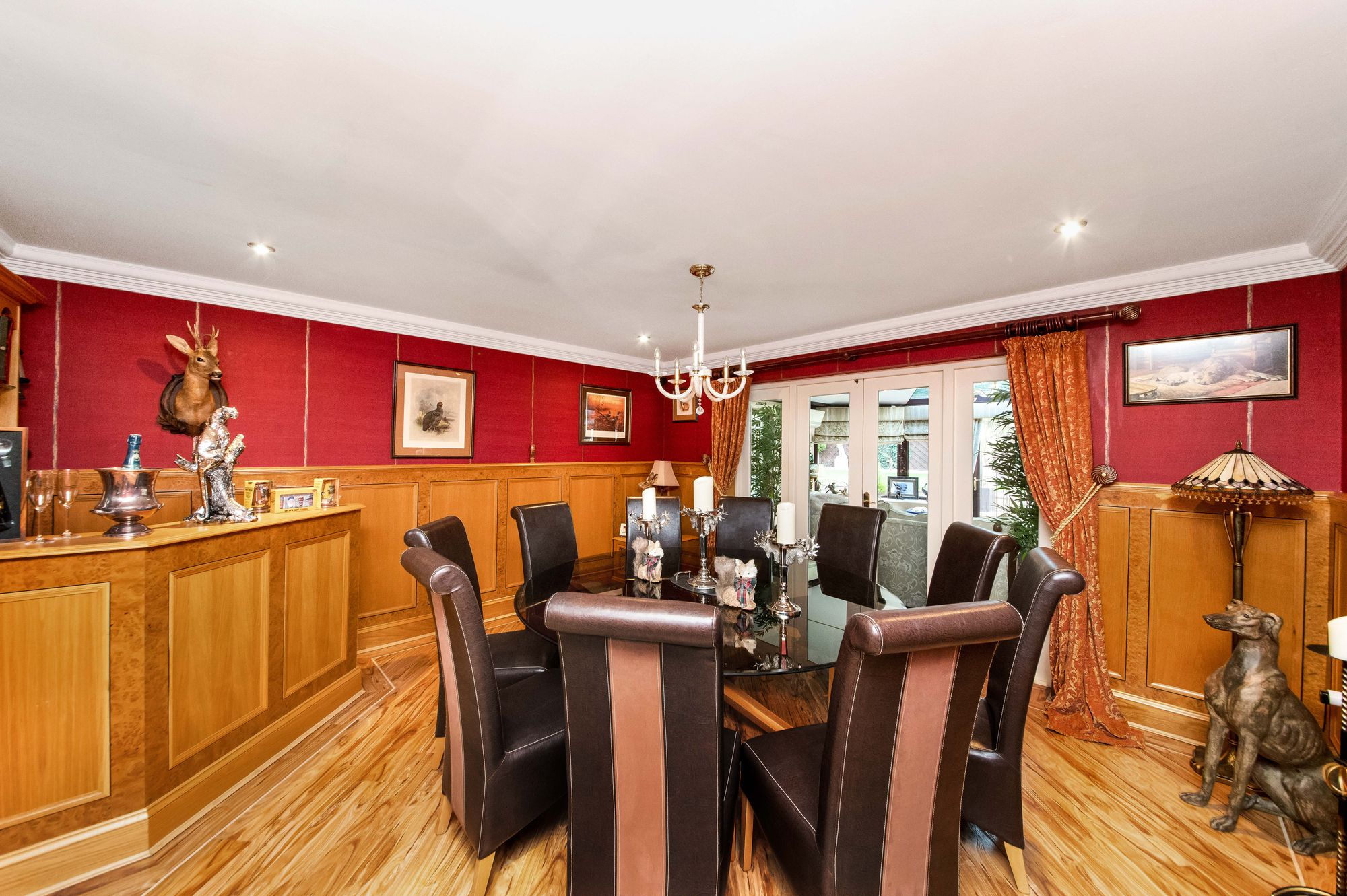 Leading from the entrance hall you enter the formal dining room which features high