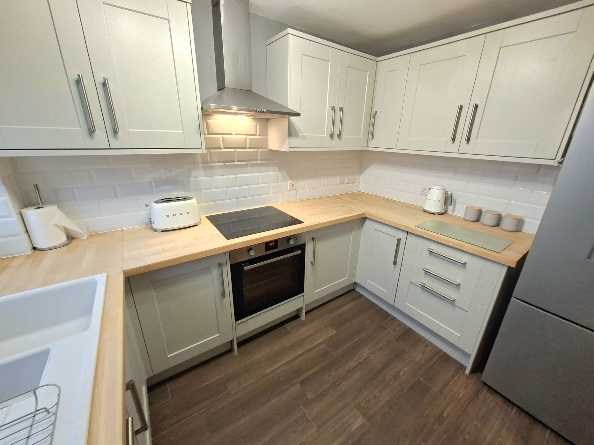 KITCHENThis is a stylish modern kitchen with solid wood worktops, built-in oven and induction hob, extraction system and has great views to the rear of the property.