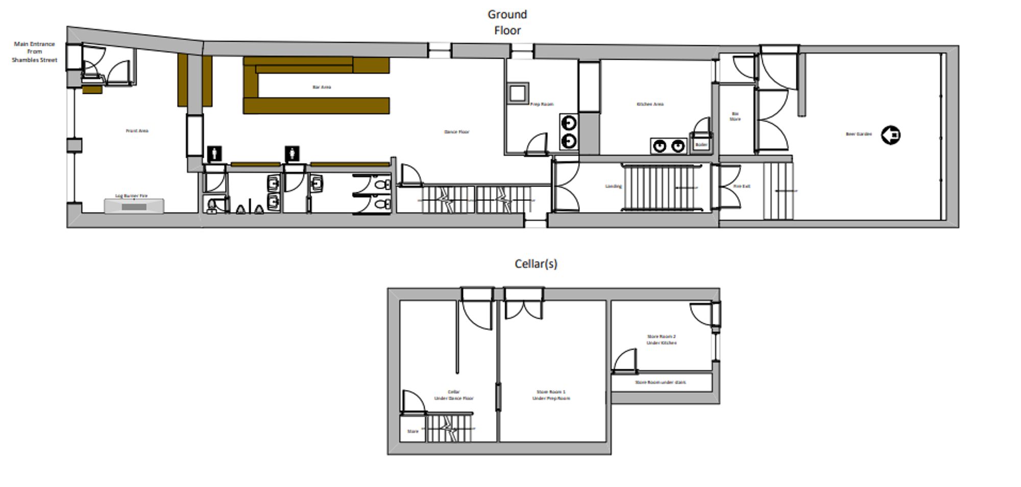 PROPERTY32 Shambles Street is a detached three storey building that has previously been used as a bar and restaurant. Accessed at ground level from Shambles Street, a welcoming large open plan room with a mix of stone flag, tiled and wooden flooring and feature fireplace great you before heading through in to the bar area. Offering good space and further seating area, there are two sets of toilets accessed from here as well as access to two of the cellars. There is a large commercial kitchen to the rear with large stainless steel extractor hood and prep area. Stairs lead down to a door at the rear which could provide a separate access if required to the first floor.