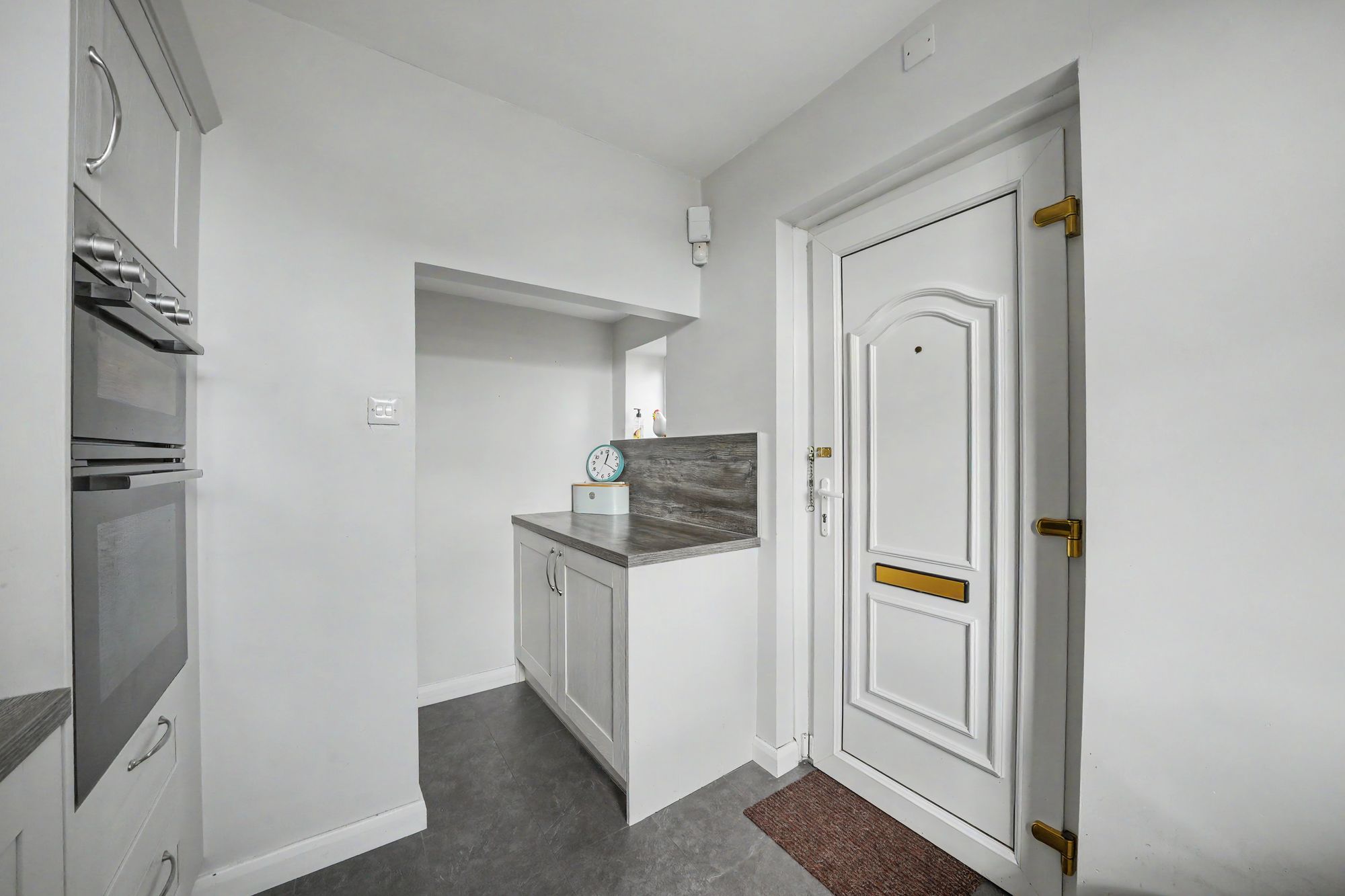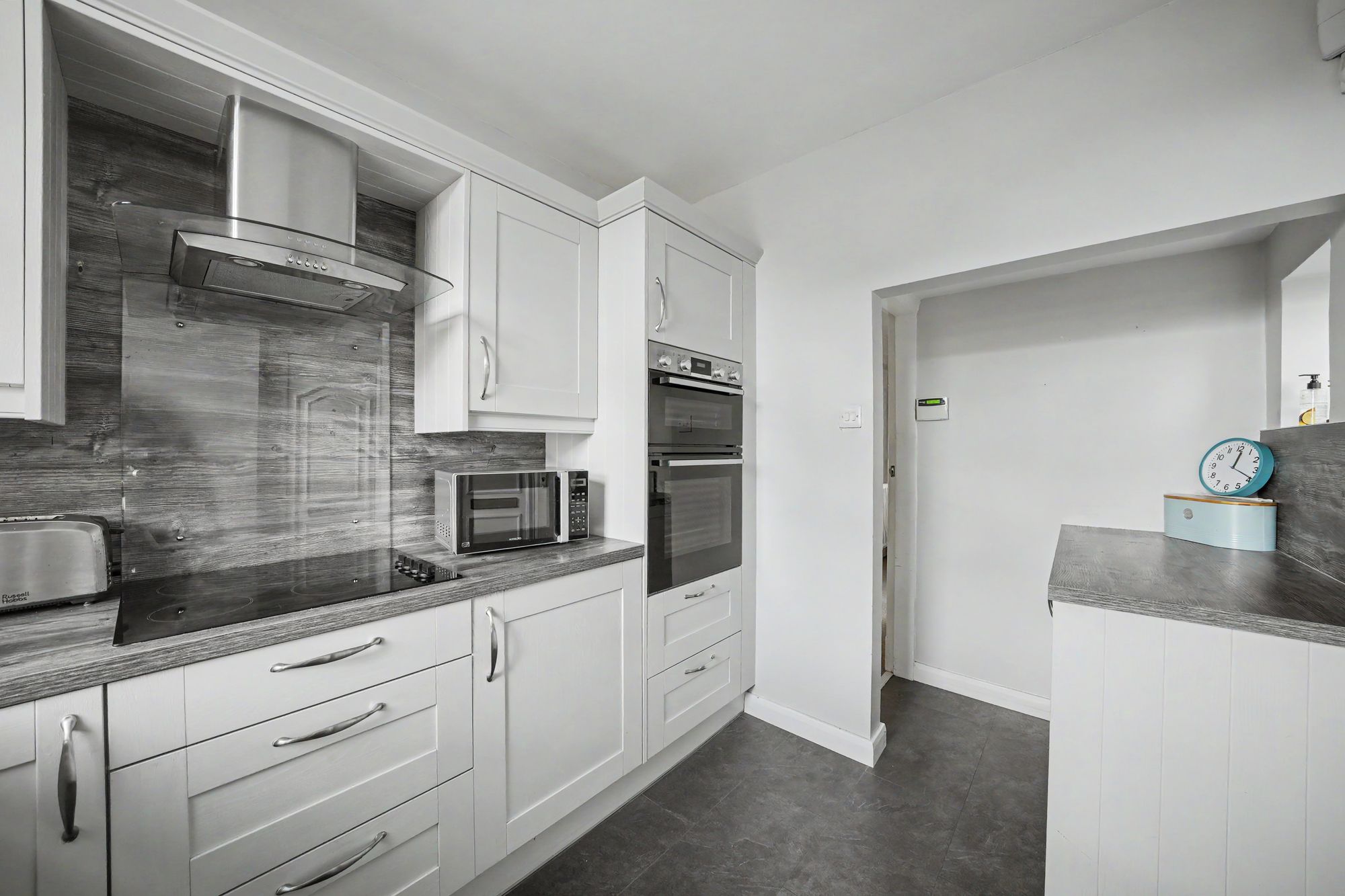 This is situated adjacent to the dining room and has a uPVC double glazed window looking out over the rear garden together with a frosted uPVC double glazed window to one side and uPVC door giving access to the driveway. There is a ceiling light point, tile effect laminate flooring and fitted with a range of stylish modern matt grey shaker style base and wall cupboards, drawers, pan drawers, pull out spice rack, inset single drainer stainless steel sink with chrome mixer tap, Bosch four ring halogen hob with stainless steel and curved glass extractor hood over, electric double oven, integrated washing machine, integrated fridge and integrated freezer.