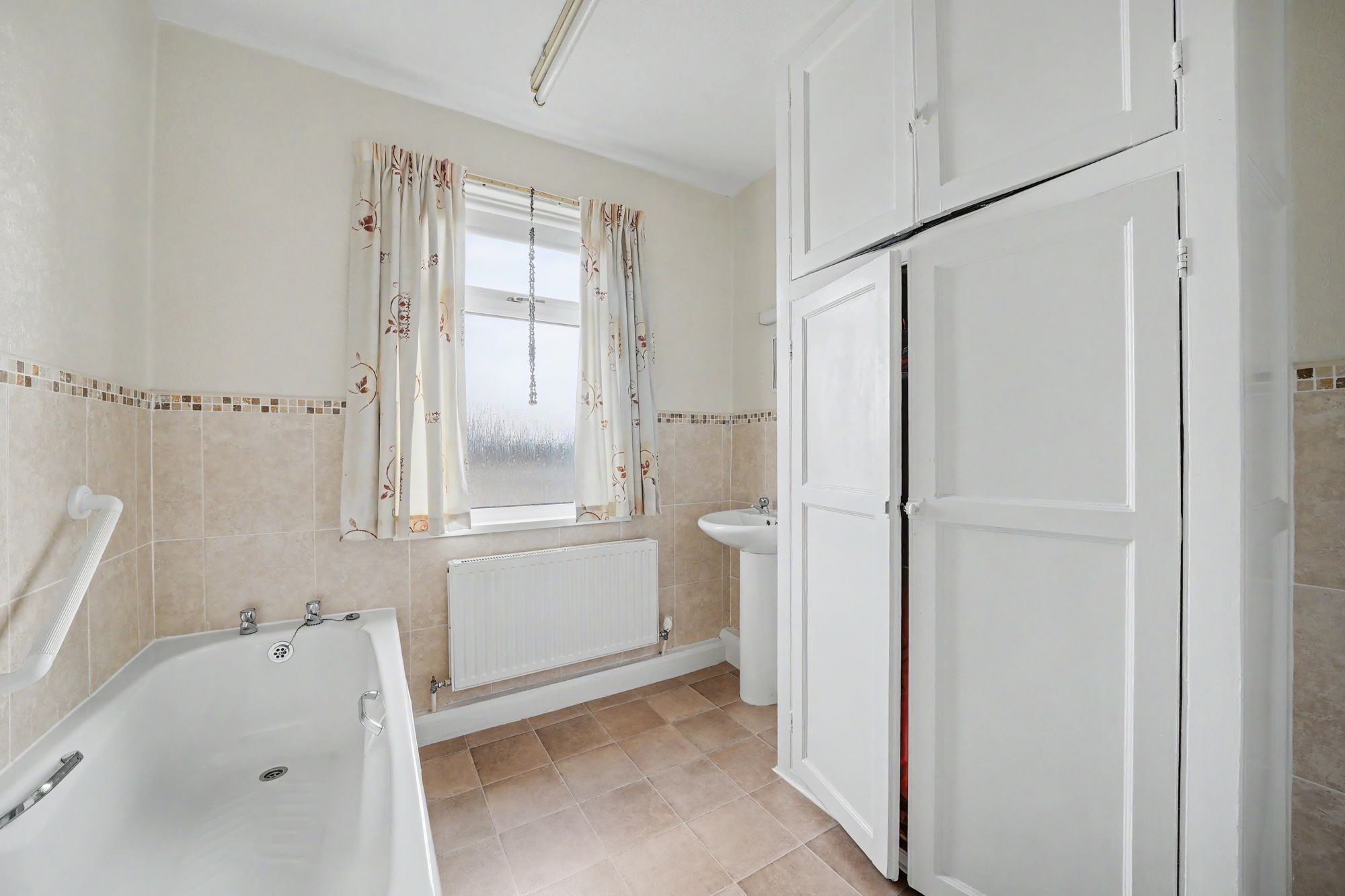 With a frosted uPVC double glazed window, ceiling light point, linen cupboard, tile effect flooring, part tiled walls and fitted with a suite comprising bath with tiled side panel, pedestal wash basin and low flush w.c.