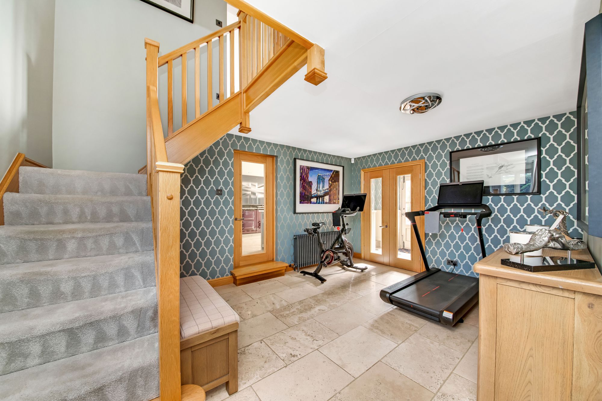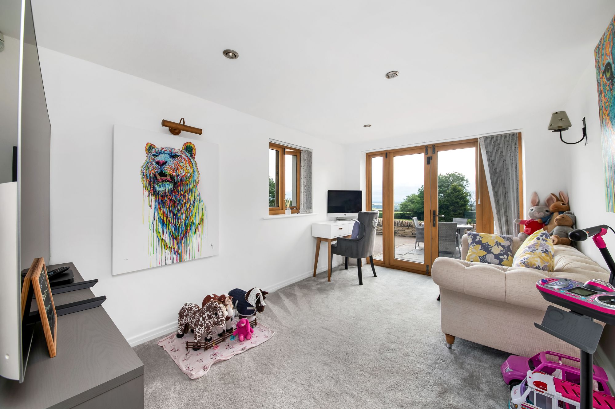 This delightful versatile room with twin glazed doors set within a glazed screen gives a stunning view out over the property's garden areas, paddock and fields beyond. The room has inset spotlighting to the ceiling, two wall light points and a picture light point. This room is currently used as a home office/TV room.