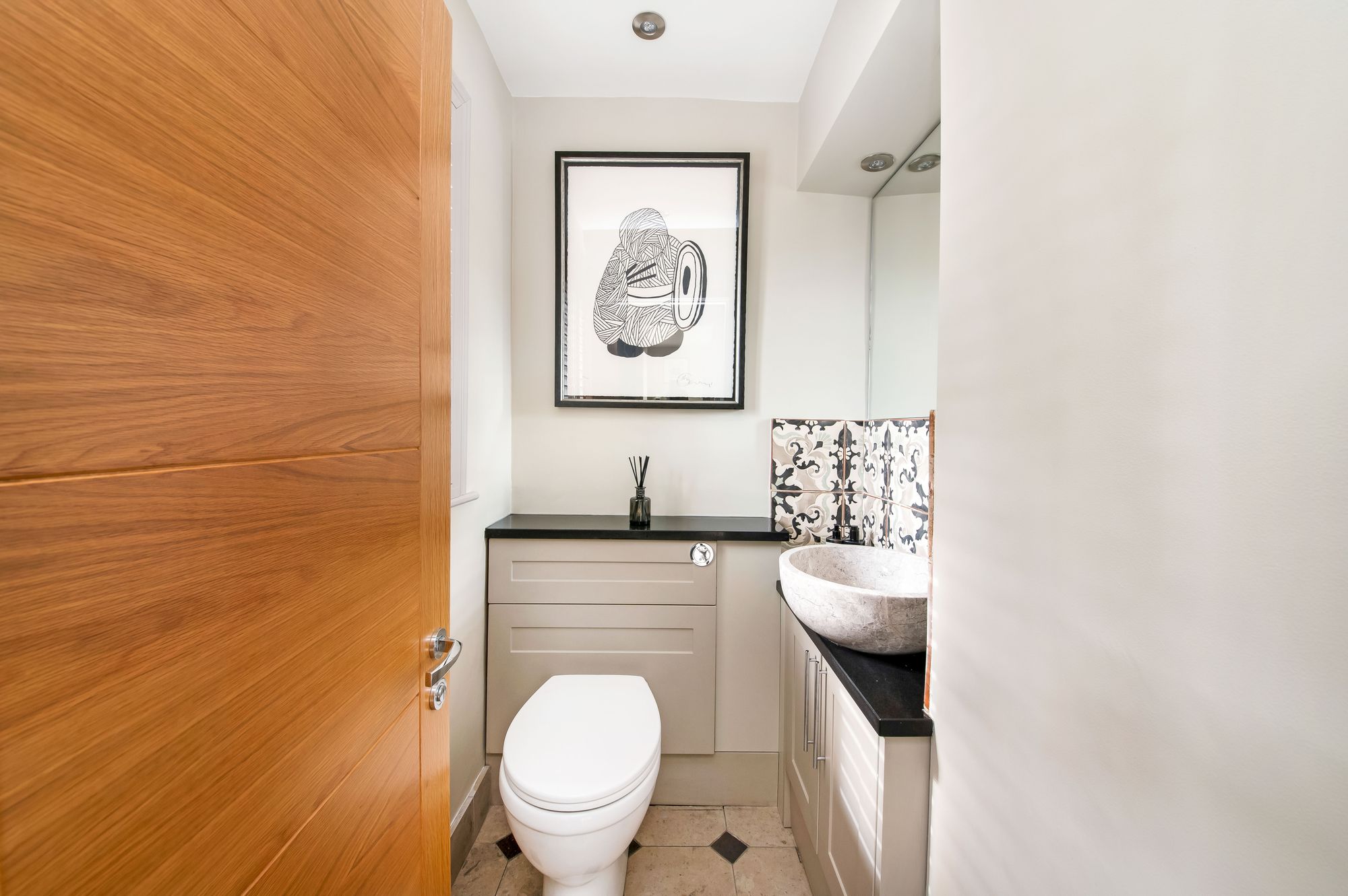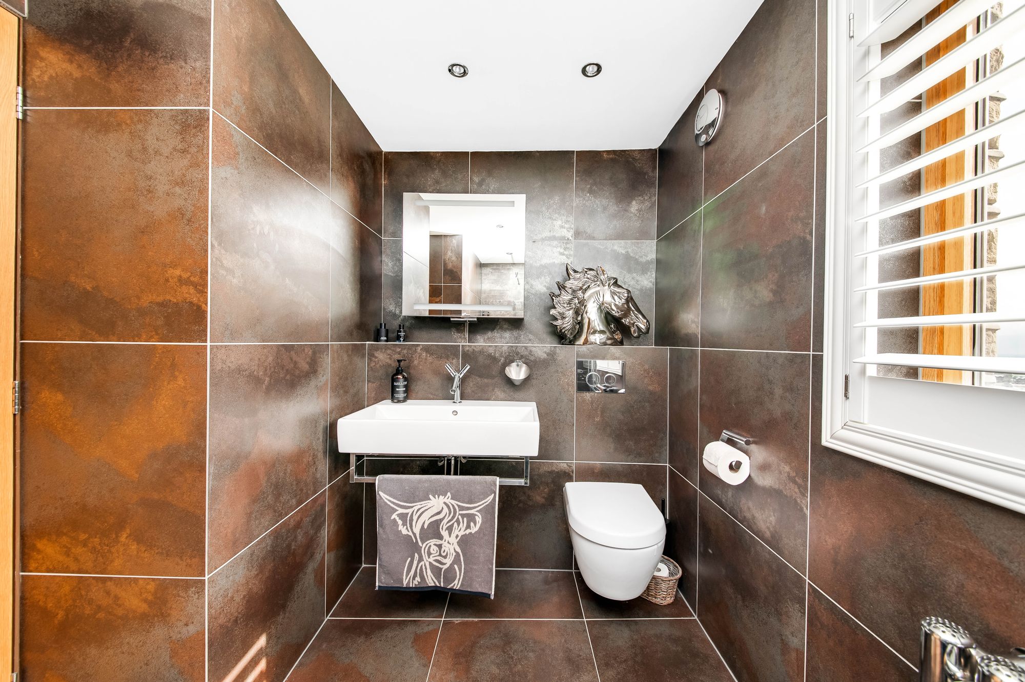 DOWNSTAIRS WCThe WC features a continuation of the ceramic tiled flooring, a concealed system w.c, a circular polished stone wash hand basin with stylish mixer tap over and decorative tile splashback. There is inset spotlighting over with mirrored backcloth and there is a window giving a pleasant outlook over the property's gardens and beyond.