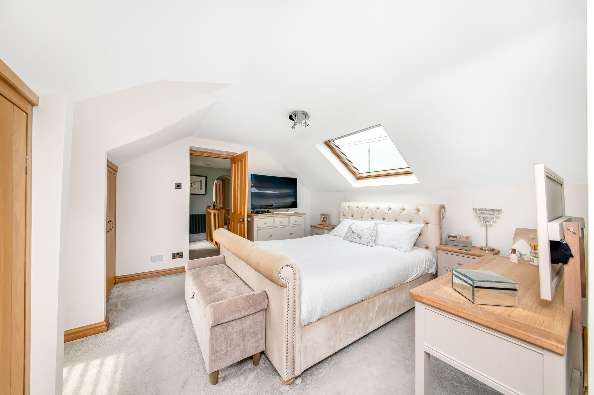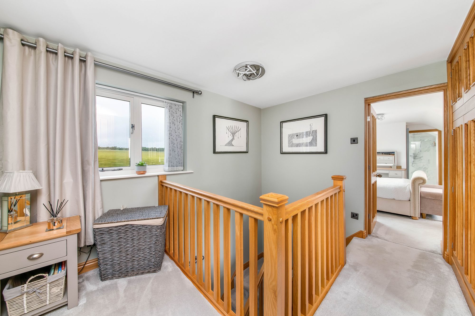 A high quality staircase turns and rises up to the first floor landing. This first floor landing has a chandelier point, two windows giving a stunning view out over neighbouring farmland, a period style central heating radiator and very useful storage cupboards, once again beautifully finished.