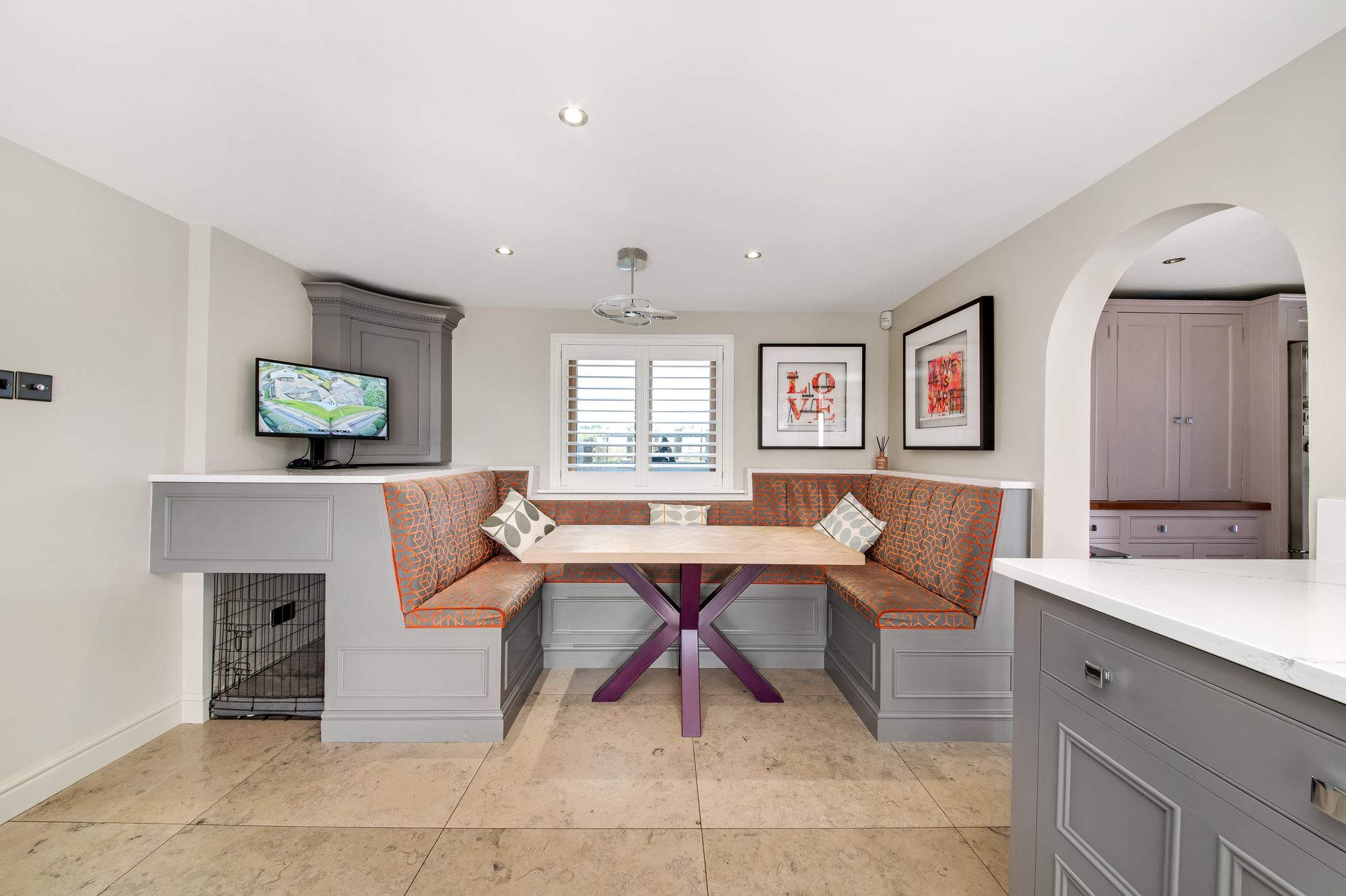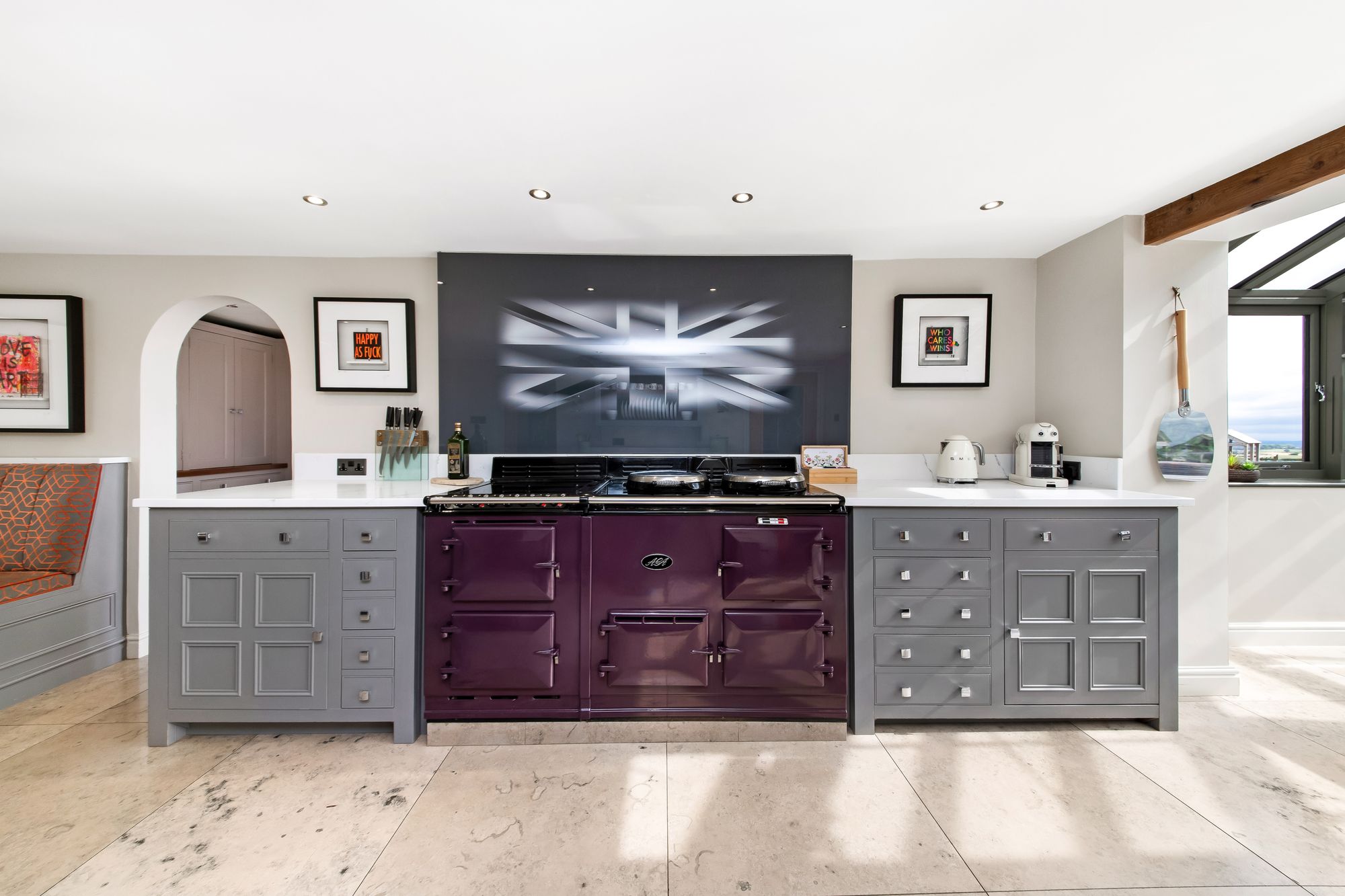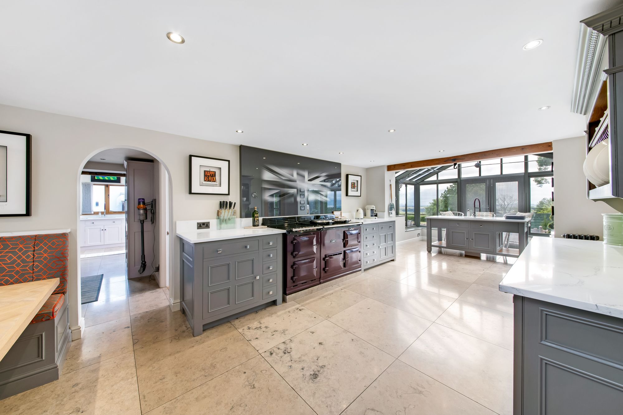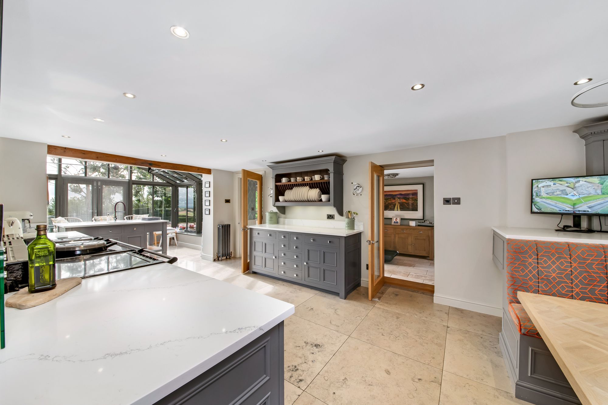 The bespoke dining area, which matches the delightful kitchen units, features bench seating and a window giving a pleasant view over neighbouring fields and beyond, while the centrally located kitchen area and Amdega orangery create a stunning light and airy space with equally delightful views. The range of fitted Chalon units are principally at the low level, have beautiful working surfaces, include a fabulous aubergine Aga of a four oven design with the usual chrome hot plates and an electric four-ring halogen hob. The island unit is beautifully finished and has breakfast seating, cupboards and display shelving. There is also an inset sink unit with stylish mixer tap over, an integrated pull out larder fridge, an integrated freezer, an integrated Siemens dishwasher, inset spotlighting, beautiful Lapicida tiled flooring found throughout, a chandelier point over the breakfast/dining area, period style central heating radiators and delightful window shutters to the lane side.