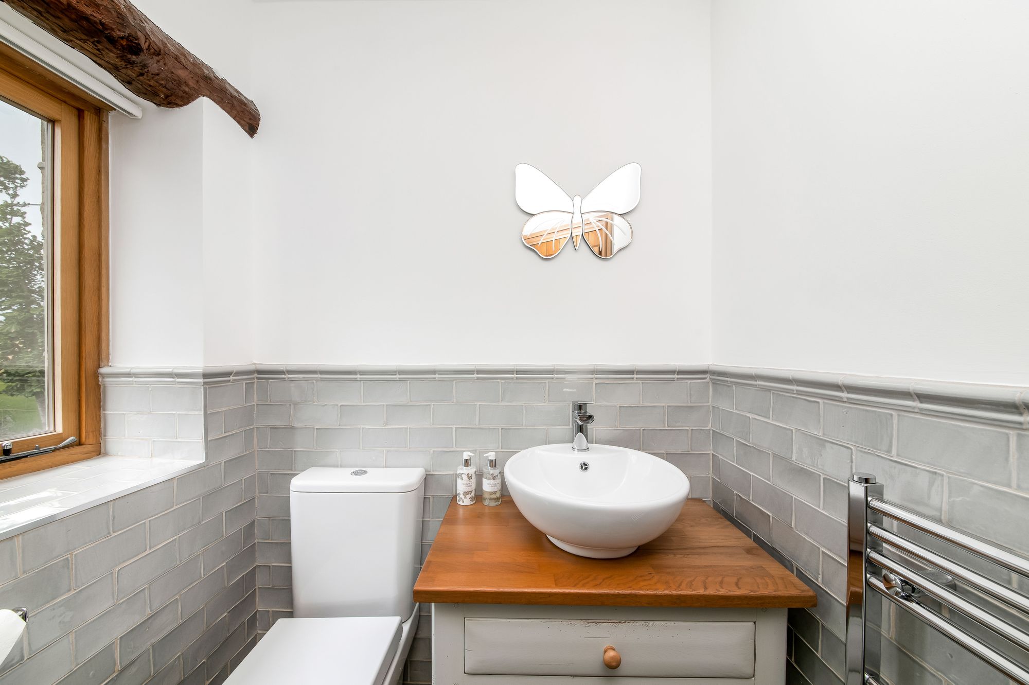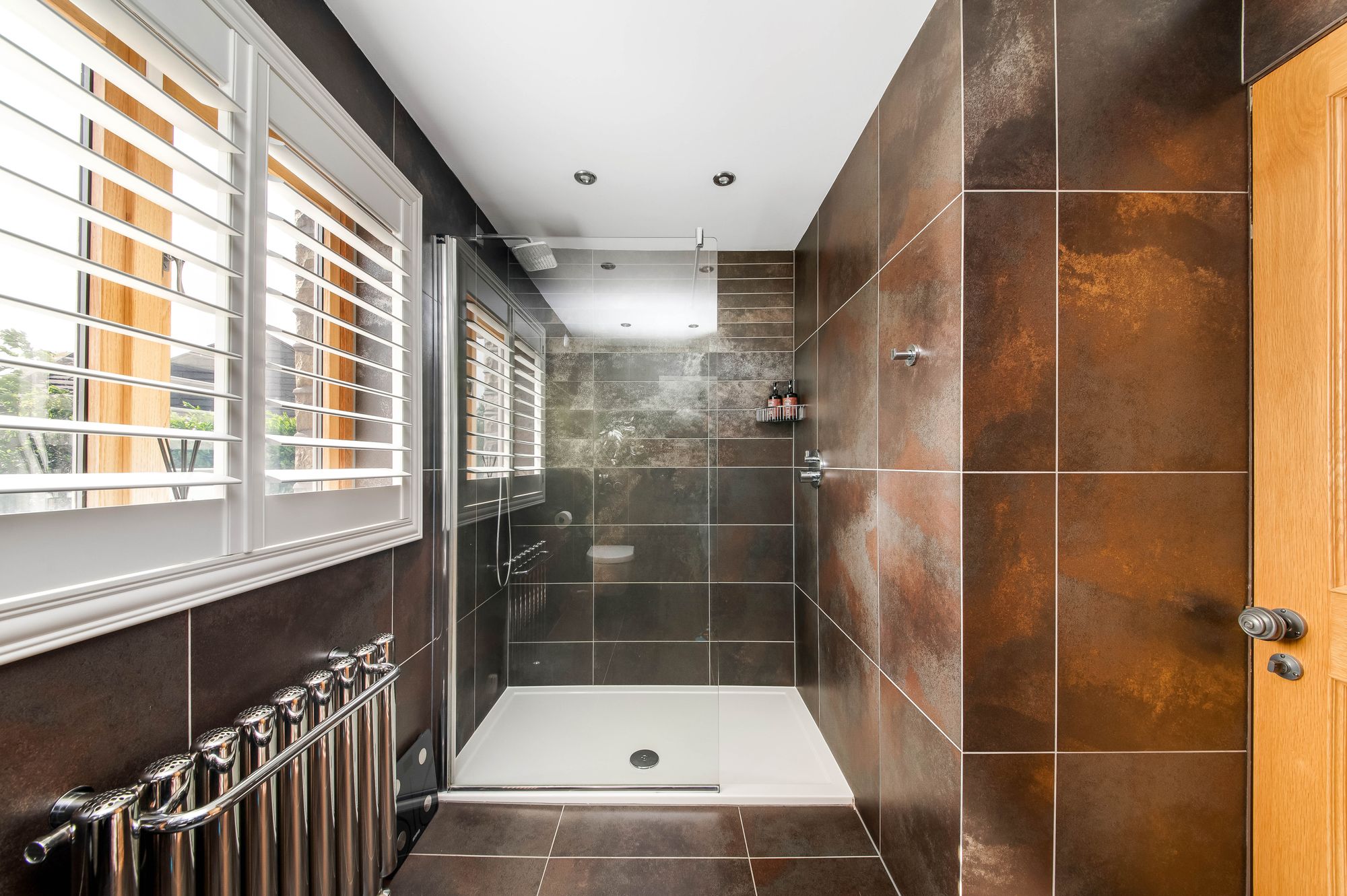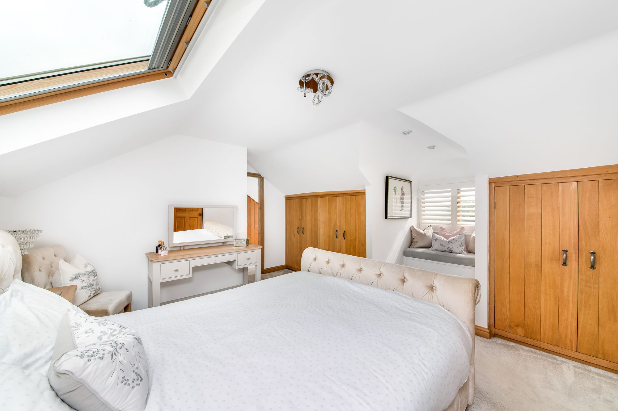 As demonstrated by the photographs, the principal bedroom is a delightful, good sized,light and airy room. To one side is a large Velux window and to the other is a window seat and twin windows with window shutters that give an astonishing view out over the neighbouring countryside well over towards Selby and beyond. There is a central chandelier point, beautiful built-in oak wardrobes, a stylish vertical central heating radiator, and an oak door leading through to the en-suite.