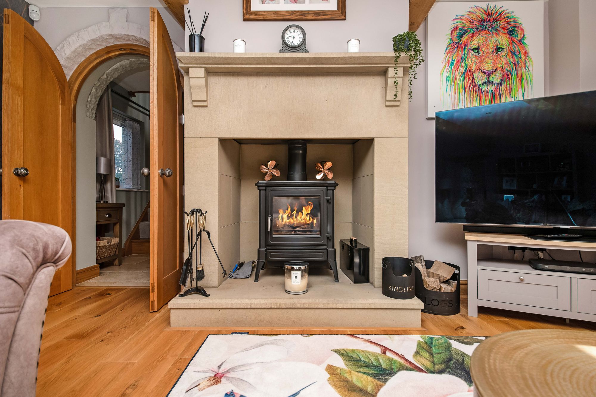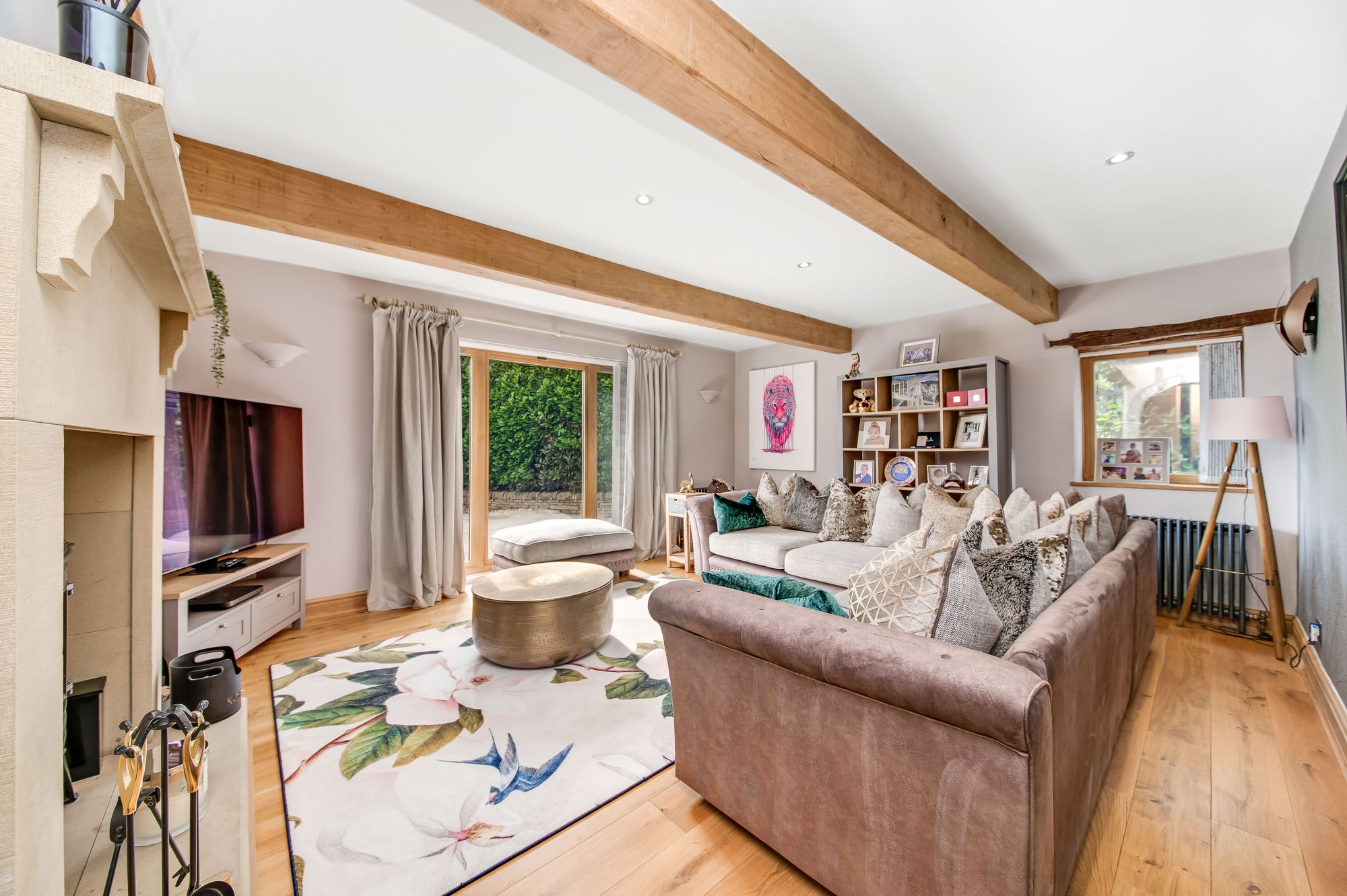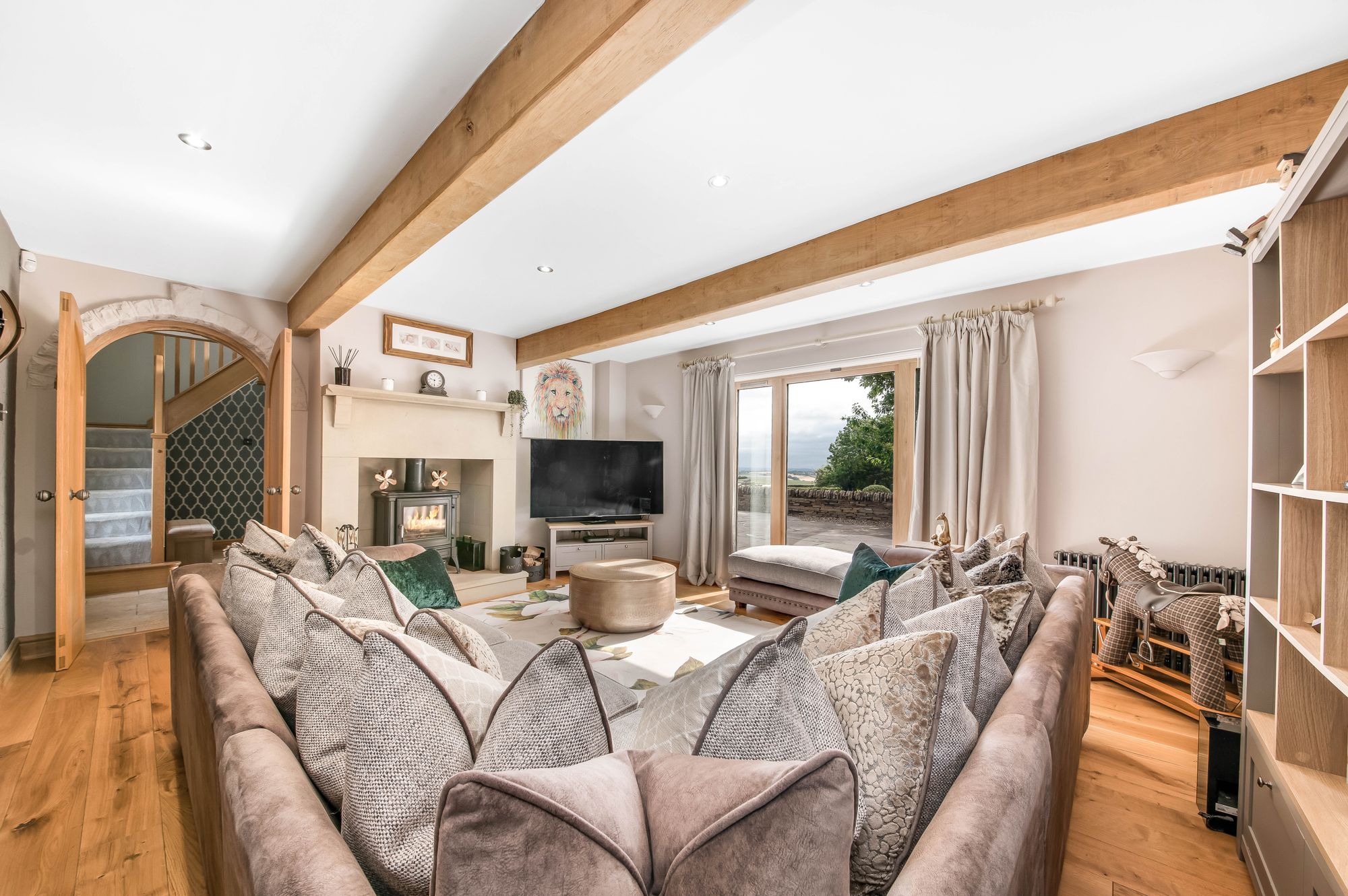 Twin polished timber, arch top doors lead through to the sitting room. This is a good sized room, beautifully presented with a side window overlooking the property's side garden areas and a broad bank of glazing giving a huge amount of natural light and a fabulous view out over the property's stone flagged terrace, paddock and long distance views beyond. There are beautiful oak beams to the ceiling and a delightful period style stone fireplace, this with a raised stone flagged hearth and stone surround The fireplace is home for a multi-fuel burning cast-iron stove with large glazed door, and incorporates a stone mantle and is a fabulous feature to the room. There are four wall light points, two period style central heating radiators and inset spotlights to the ceiling which are operated by a dimmer switch.