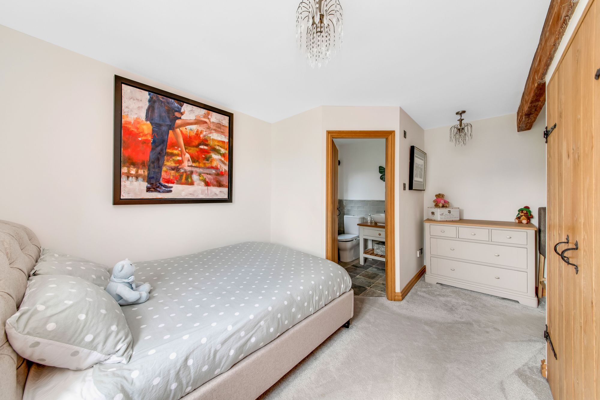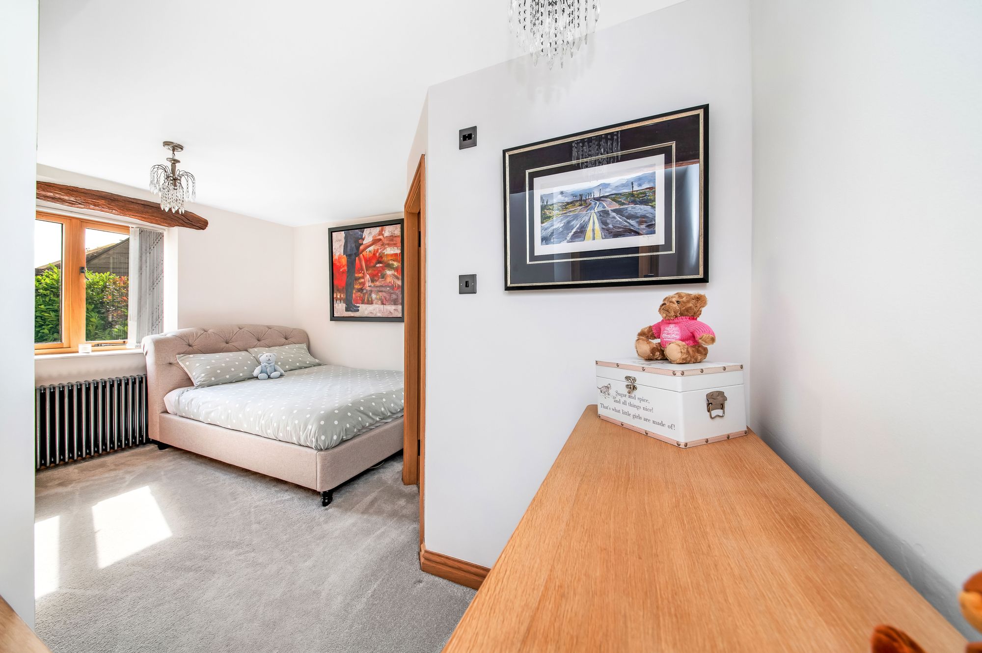 Bedroom two is another delightful, double, en-suited bedroom with a beam on display, delightful built-in wardrobes, a window giving a tremendous long distance view, a period-style central heating radiator and two chandelier points.