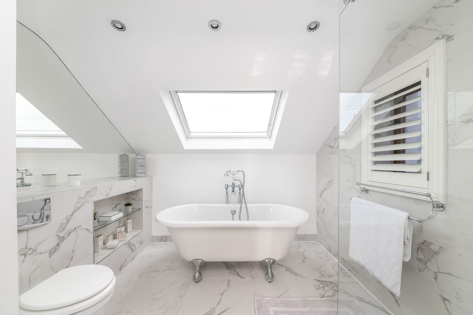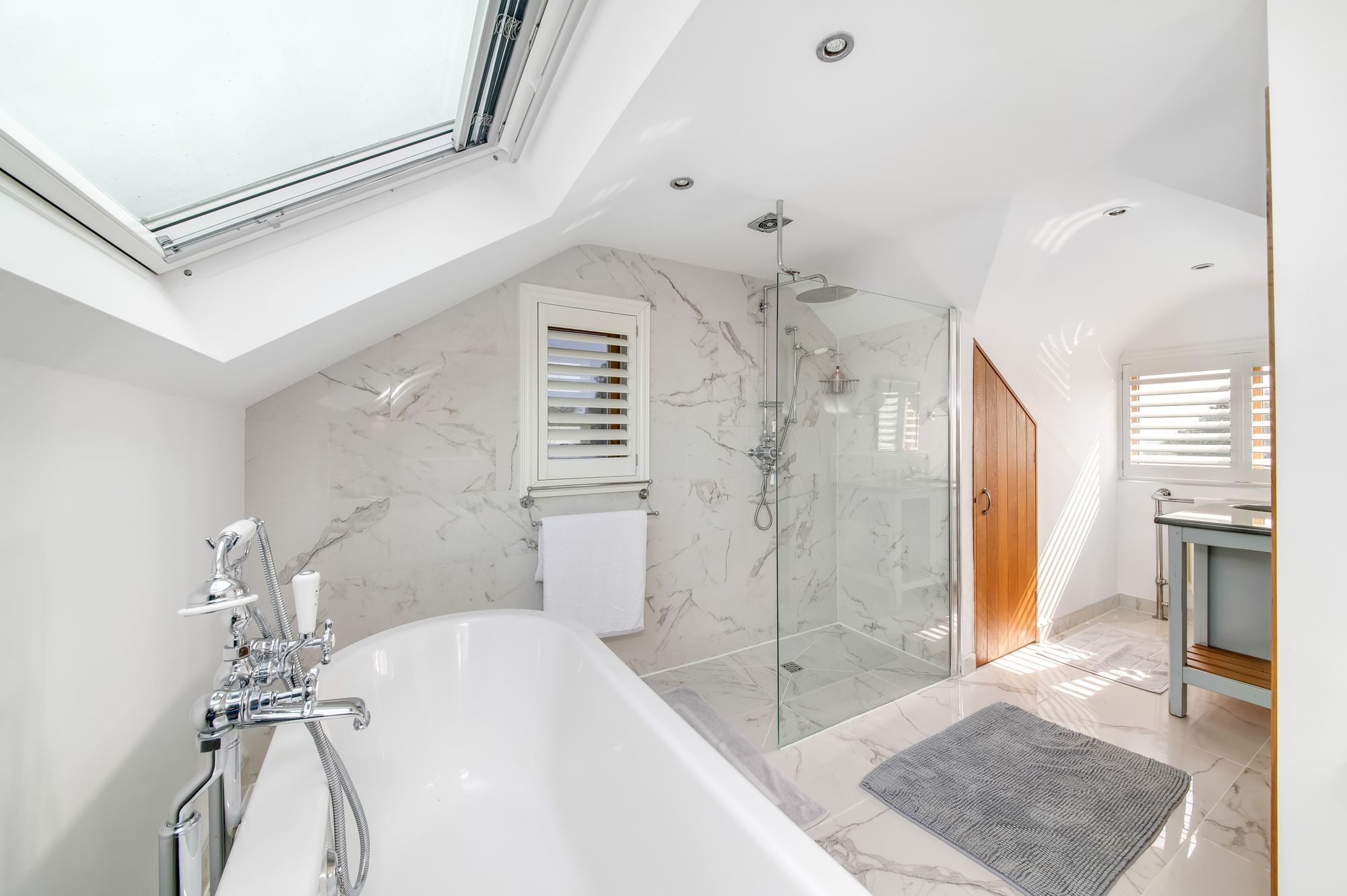 Benefitting from underfloor heating, the en-suite is beautifully presented and comprises a large Fired Earth vanity unit/wash hand basin with cupboards beneath, a concealed cistern WC, a fixed glazed screen shower with chrome shower and additional handheld showerhead, and a delightful double-ended ball and clawfoot bath with Victorian handheld mixer tap. There is a Velux window, further windows with timber shutters, a period style central heating radiator/towel rail, attractive flooring, a mirrored half-wall with display shelving, and inset spotlighting to the ceiling.