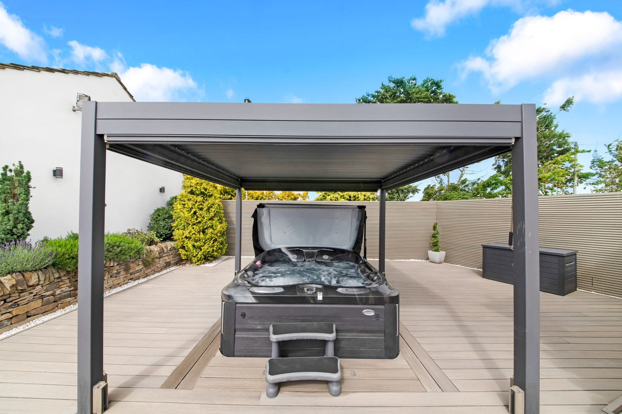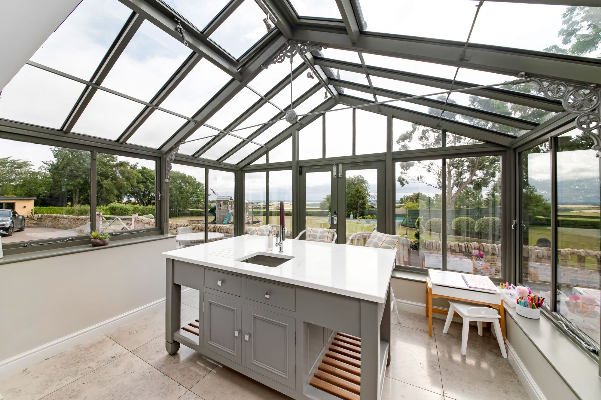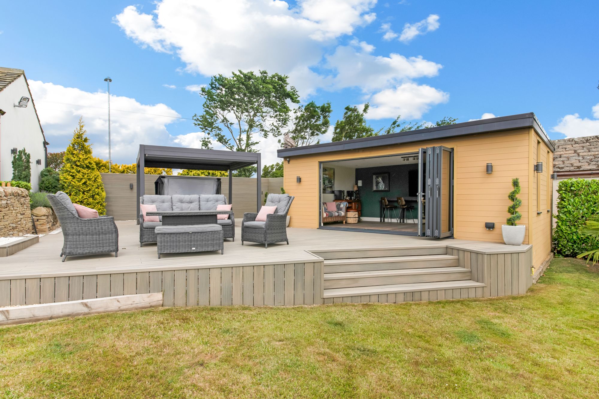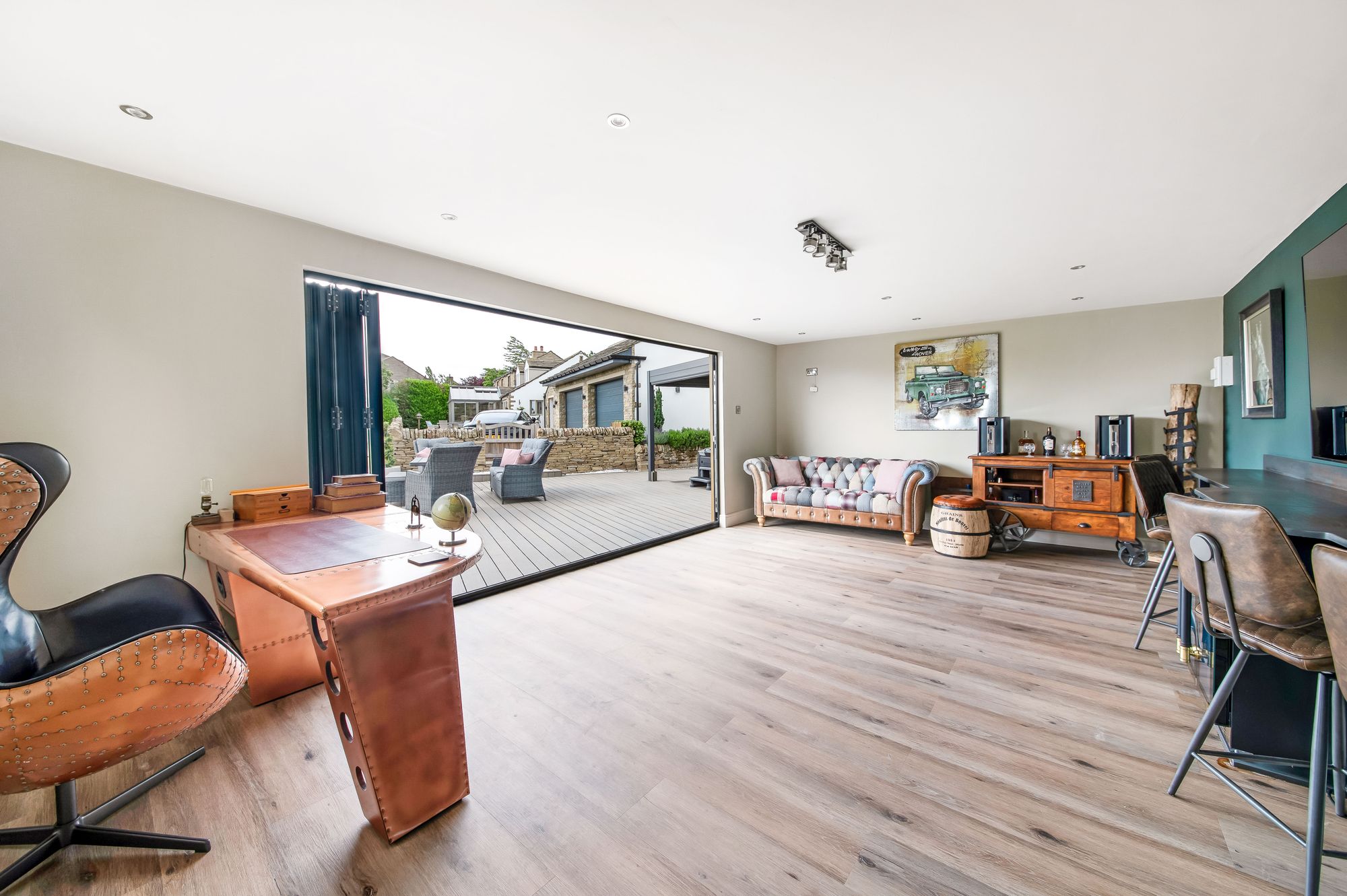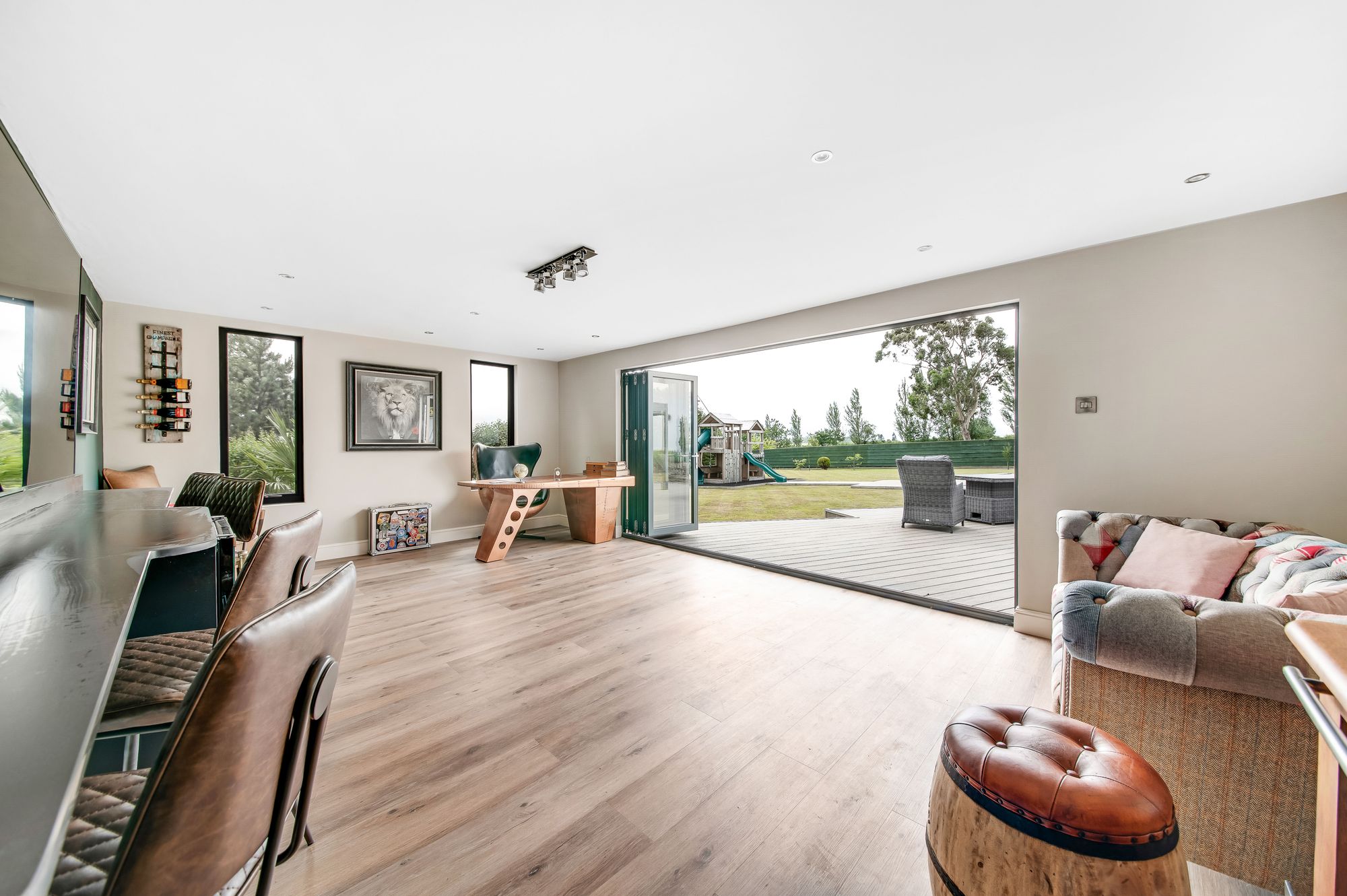 The summerhouse / studio features five glazed bi-fold doors, twin windows, inset spotlighting to the ceiling, and provisions for a wall-mounted television. There are fabulous integrated fittings including a bar/seating area with a high-quality, integrated fridge. The summerhouse is a fabulous addition to the home, provides a large amount of space, and offers a stunning view over the property's gardens, ground, paddock and beyond.