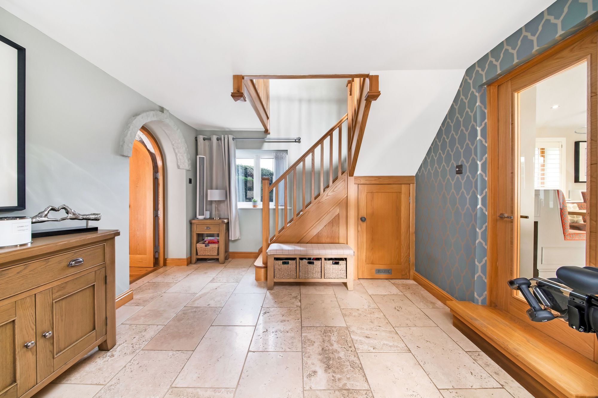 Attractive timber and glazed door gives access through to the entrance hall. This entrance hall has a beautiful ceramic tiled flooring and a chandelier point to the ceiling. It is decorated with timber panelling to dado height and has a four panel timber door leading to the downstairs w.c.