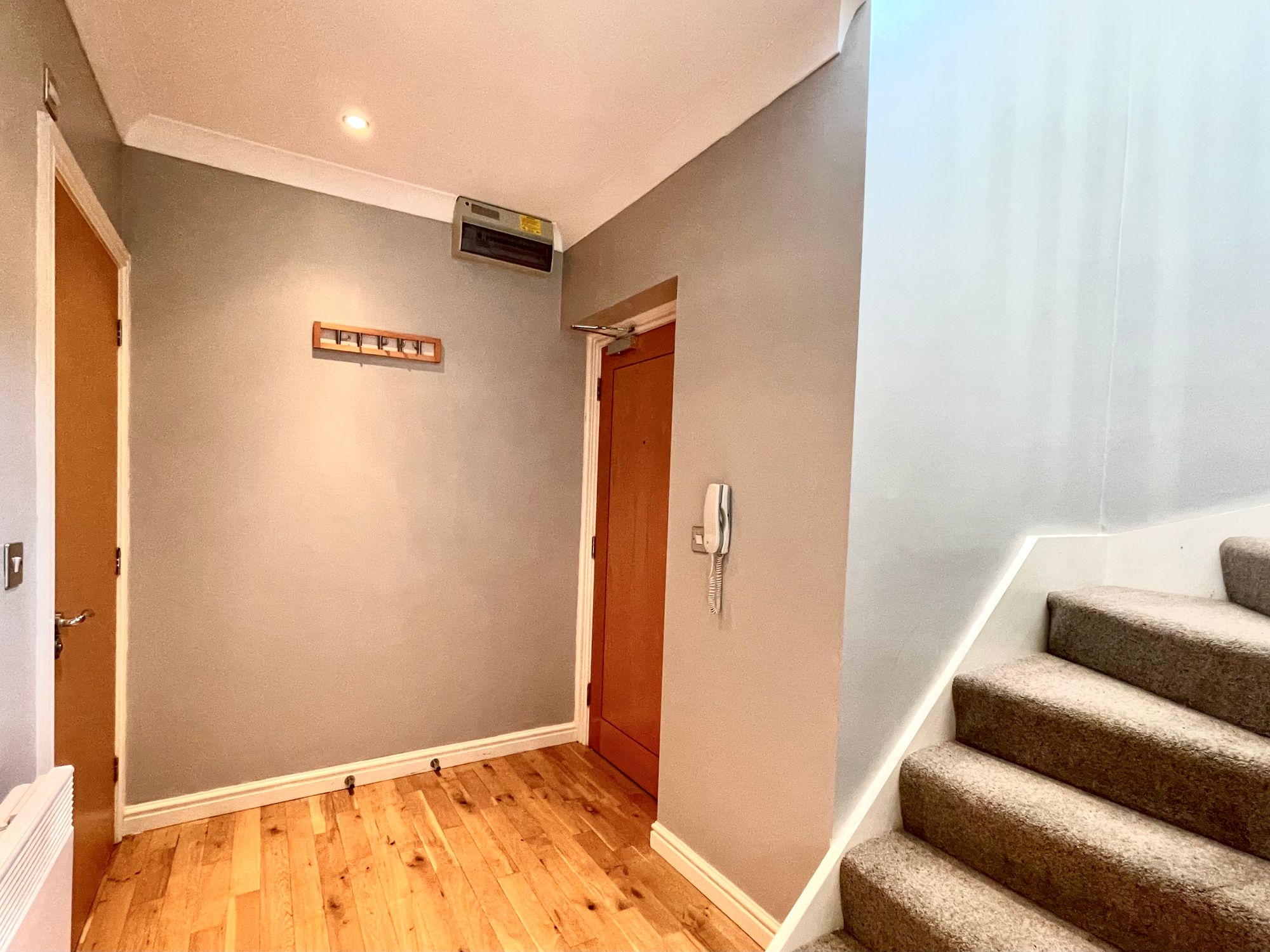 Communal Entrance gives access to stairs rising to the first floor and leading to entrance hall with oak flooring, inset ceiling downlighters, ceiling coving, electric wall heater and to one side a return staircase rises to the first floor. From the hallway access can be gained to the following: -