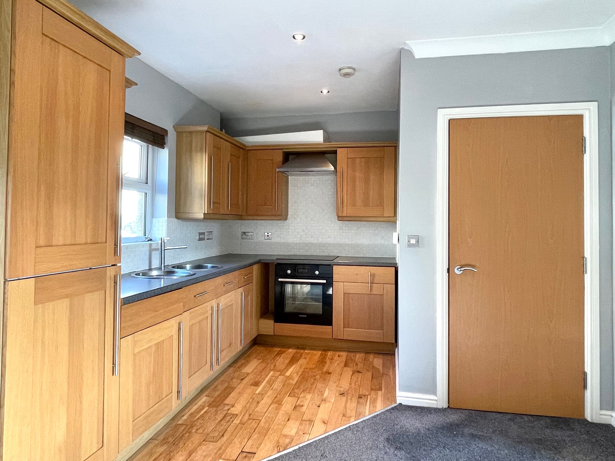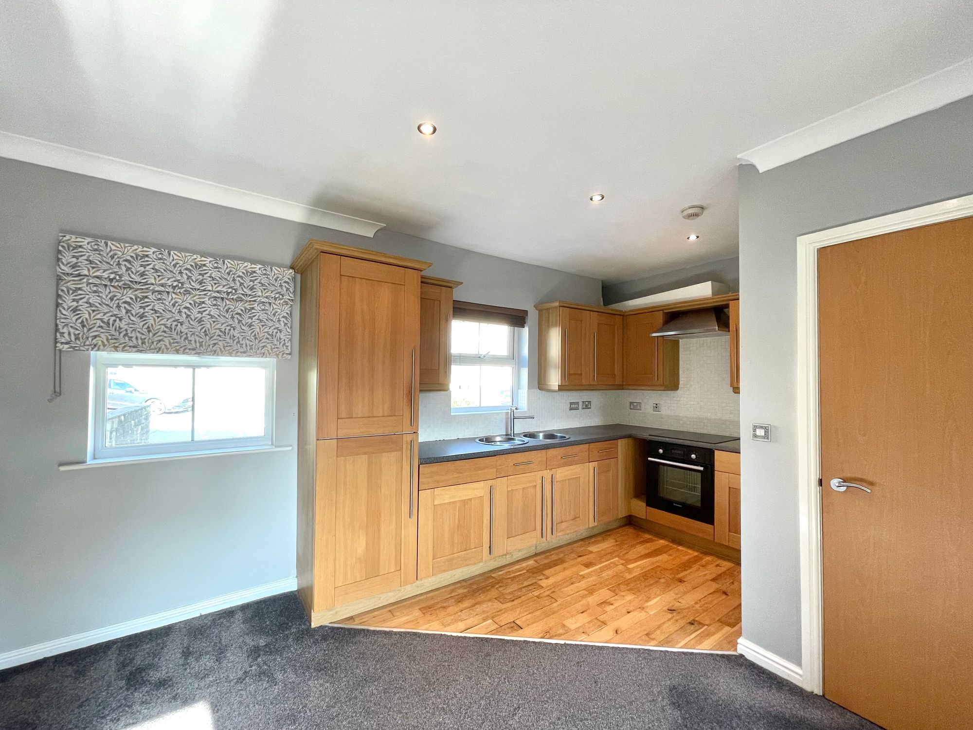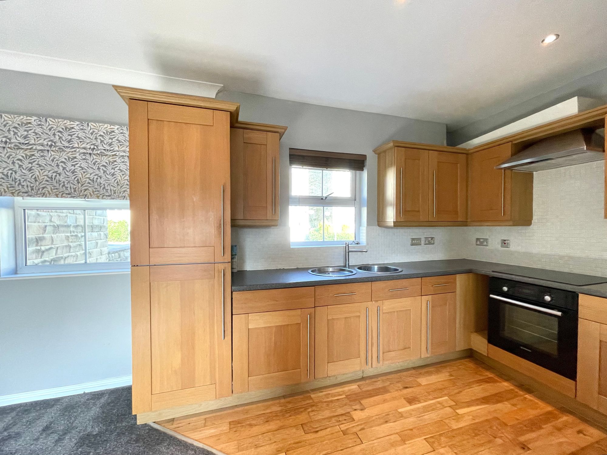 This is open plan to the living area and has a uPVC double glazed window, inset ceiling downlighters, oak flooring and fitted with a range of shaker style base and wall cupboards, drawers, contrasting overlying worktops with tiled splashbacks, inset circular stainless steel sink with circular drainer and chrome monobloc tap, four ring halogen hob with electric oven beneath, integrated fridge, integrated freezer, integrated dishwasher and integrated washer/drier.