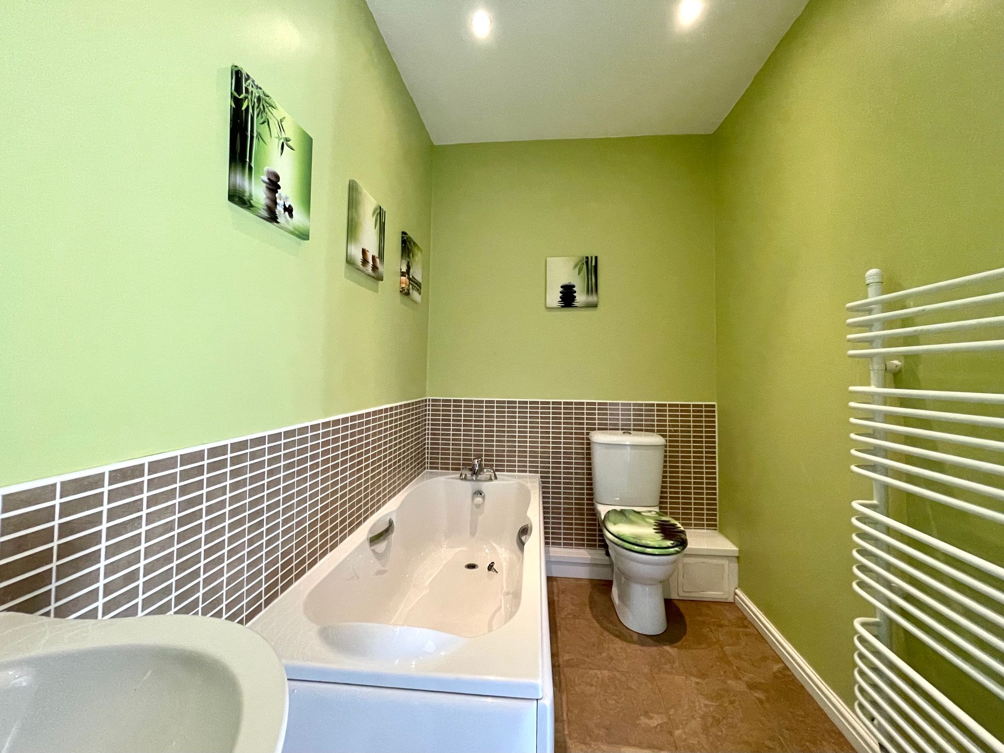 With inset ceiling downlighters, extractor fan, part tiled walls, tiled floor, ladder style heated towel rail, shaver socket and fitted with a suite comprising panelled bath, pedestal wash basin and low flush w.c.