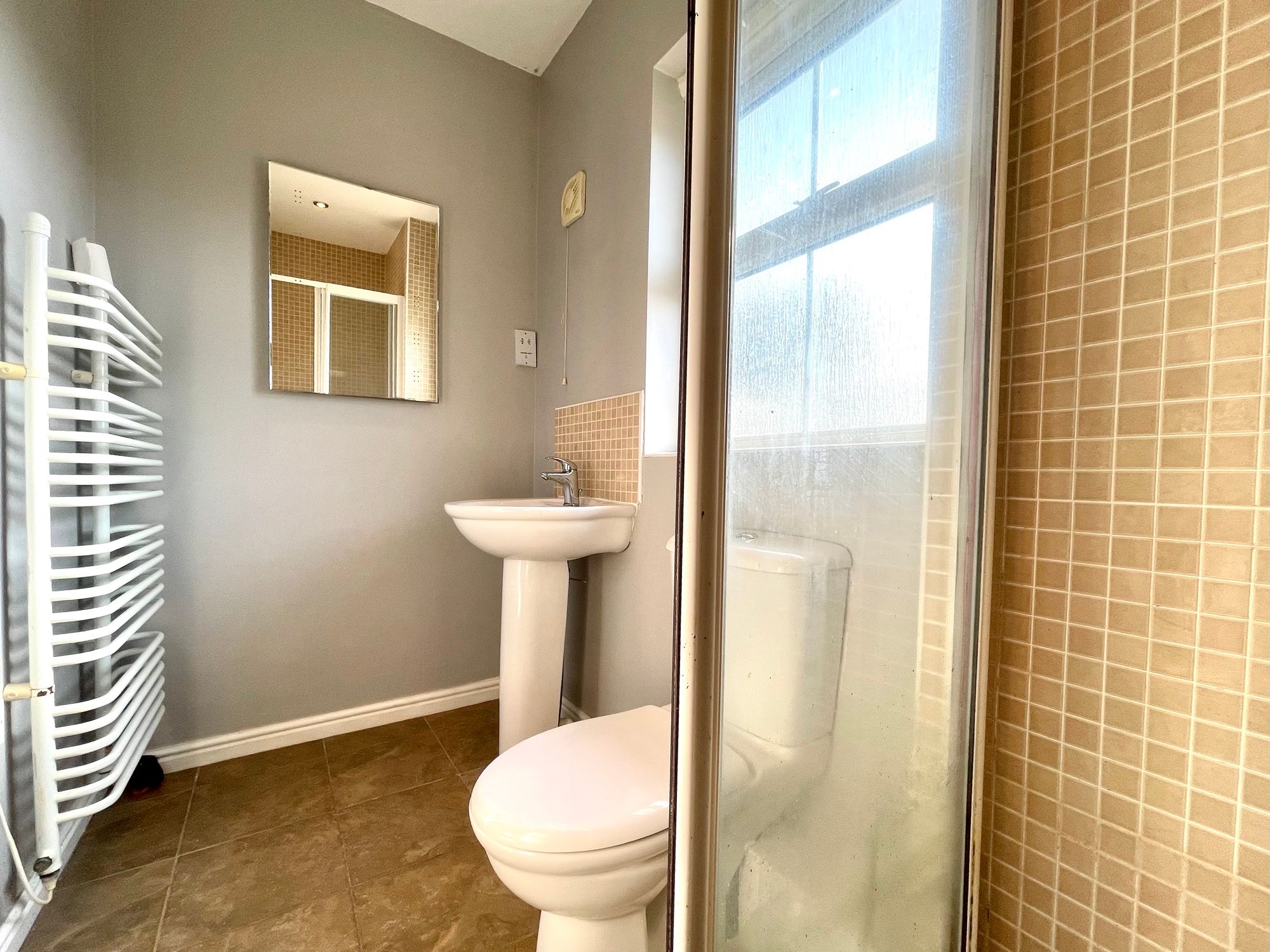 With a frosted uPVC double glazed window, inset ceiling downlighters, extractor fan, shaver socket, ladder style heated towel rail and fitted with a suite comprising pedestal wash basin with chrome monobloc tap and tiled splashback, low flush w.c. and shower cubicle with sliding door and electric shower fitting.