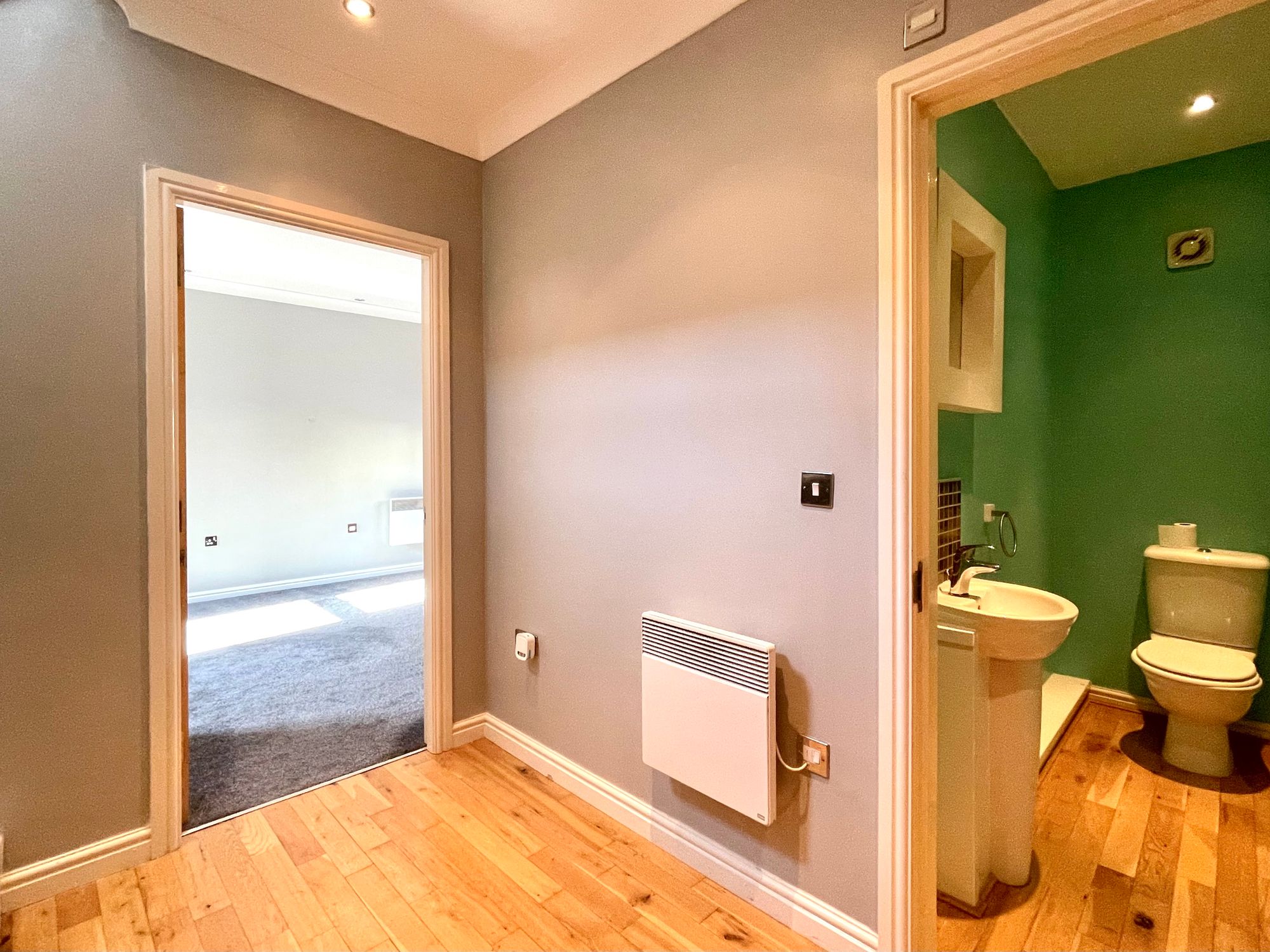 With inset ceiling downlighters, extractor fan, oak flooring, electric wall heater and fitted with a suite comprising pedestal wash basin with chrome monobloc tap, tiled splashback and low flush w.c.