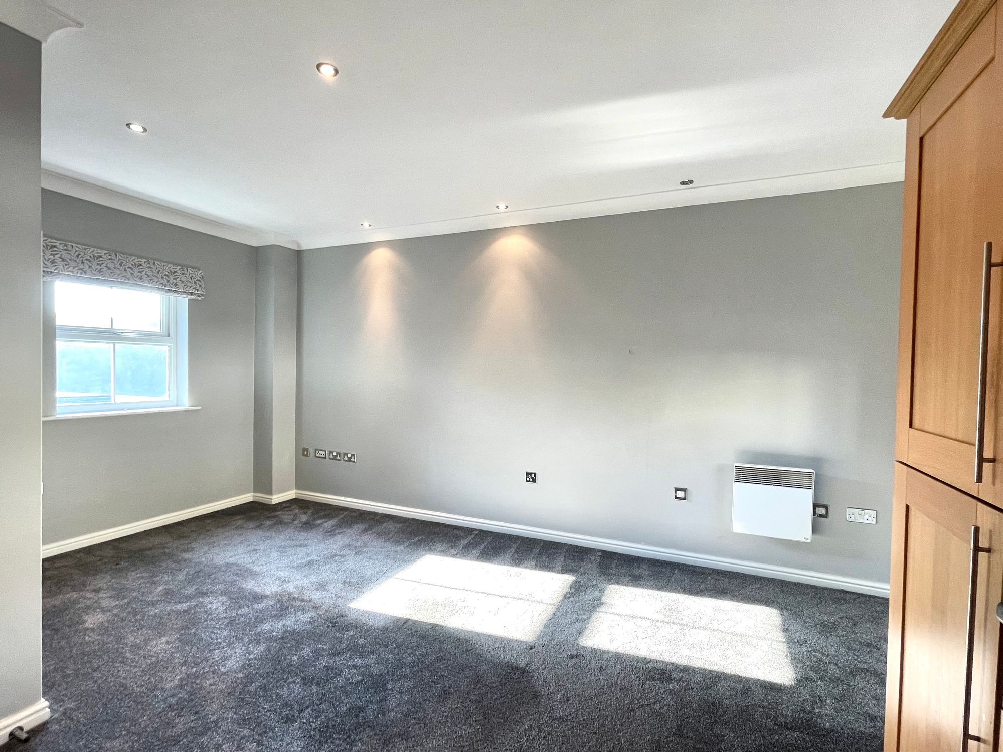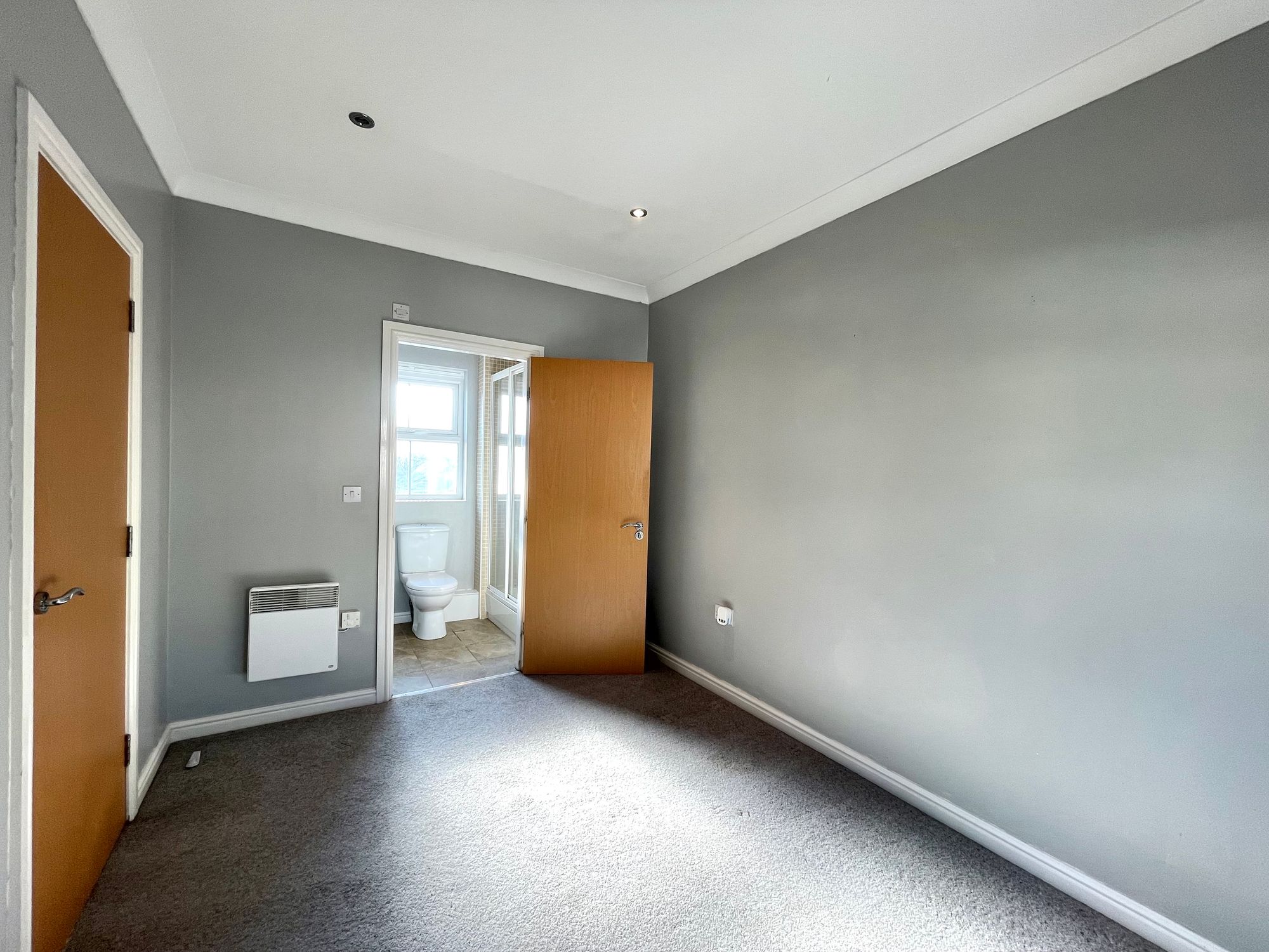 With uPVC double glazed window, inset ceiling downlighters, ceiling coving, electric wall heater and door giving access to an en-suite shower room.