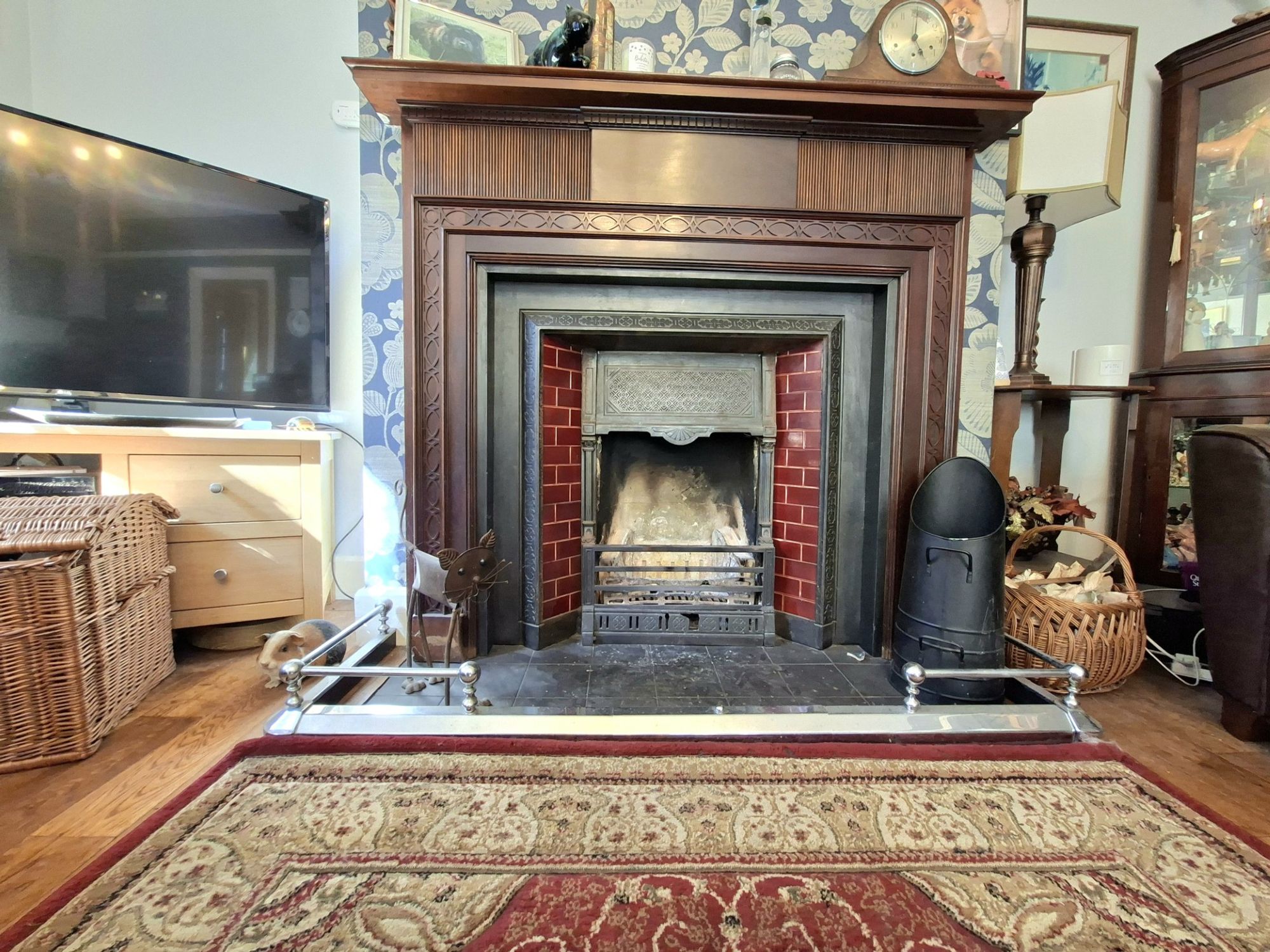 A stunning character-filled living room with windows on two aspects and an incredible feature open fire place as well as wood flooring.
