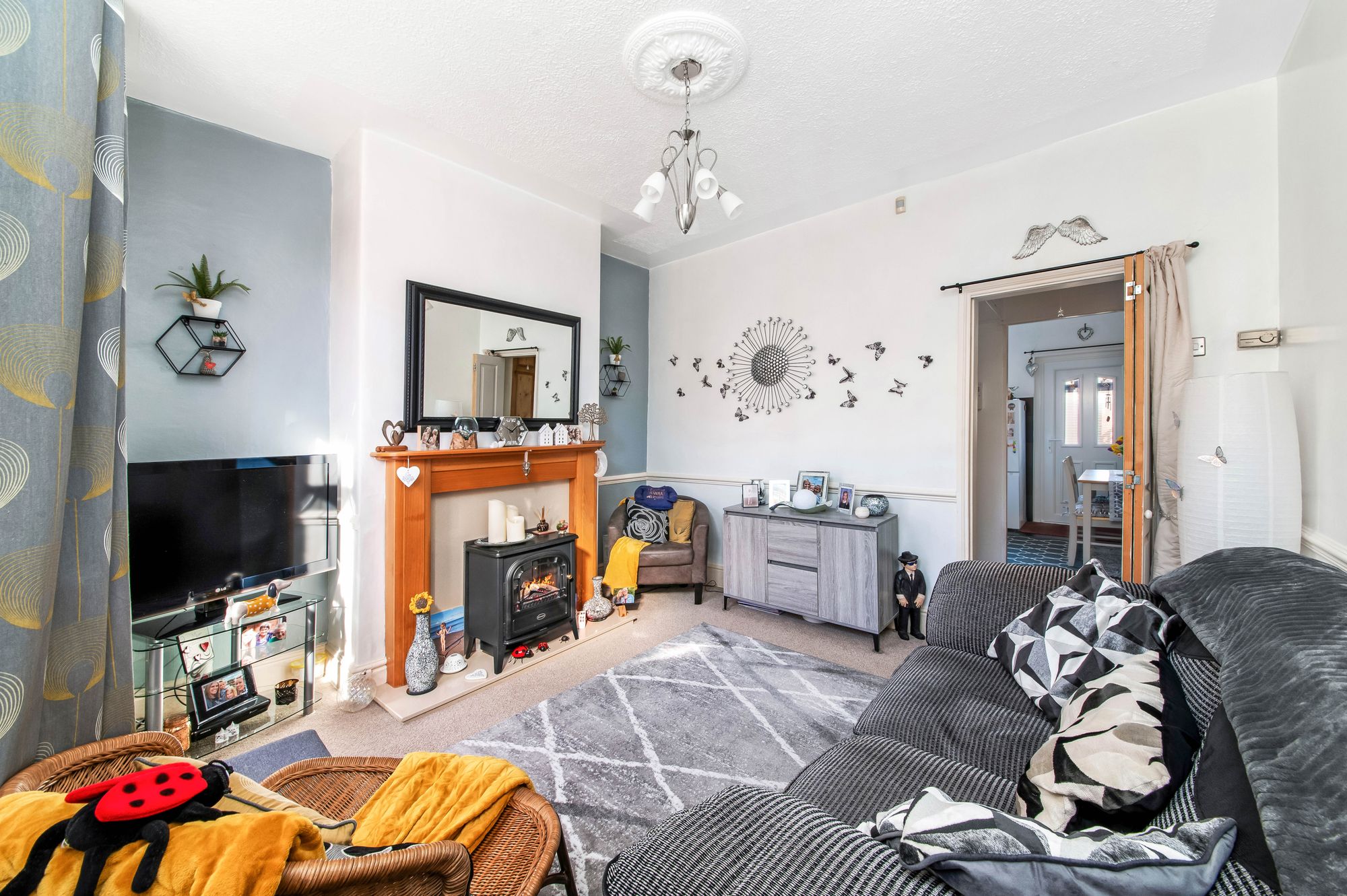 LIVING ROOMA front facing reception space with ceiling light with ceiling rose, central heating radiator and uPVC double glazed window to front. The main focal point is a electric fire with decorative surround. Door opens to inner hall which in turns connects to basement and dining kitchen.