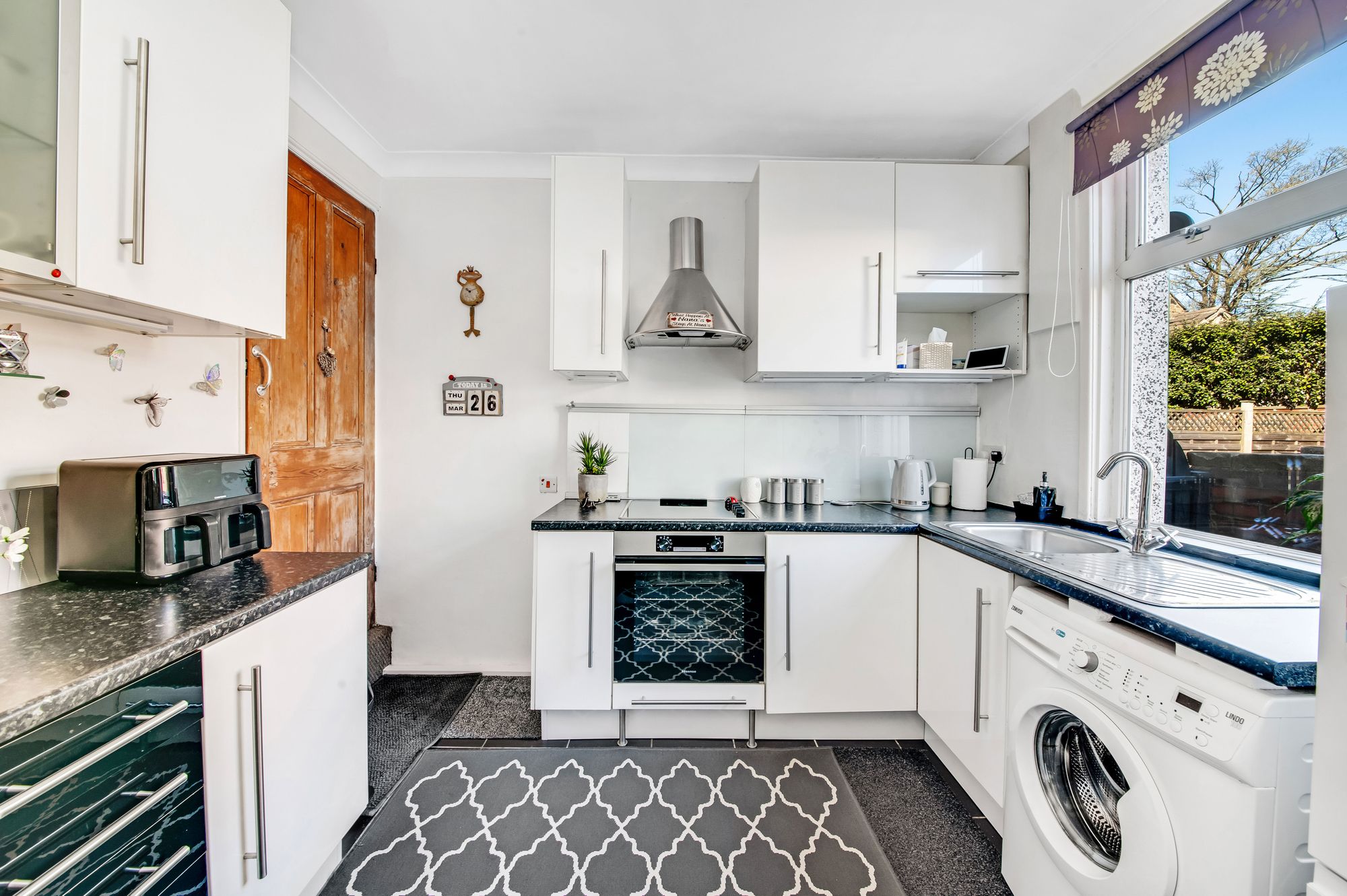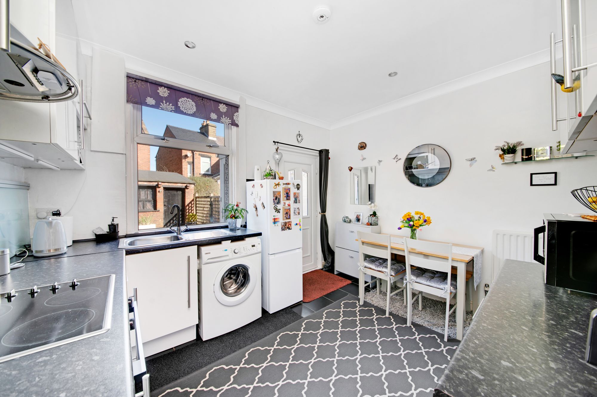 DINING KITCHENAn excellently proportioned space with room for table and chairs if so desired. The kitchen has a range of wall and base units in a white high gloss shaker style with contrasting laminate worktops, glass splash backs and tiled flooring. There is an electric oven with matching four burner electric hob with chimney style extractor fan over, there is a stainless steel one bowl sink with chrome mixer tap over and plumbing for a washing machine. There are inset ceiling spotlights, central heating radiator, uPVC double glazed window to rear and uPVC and double-glazed door giving access to rear porch. From dining kitchen door opens to staircase which ascends to the first-floor landing.