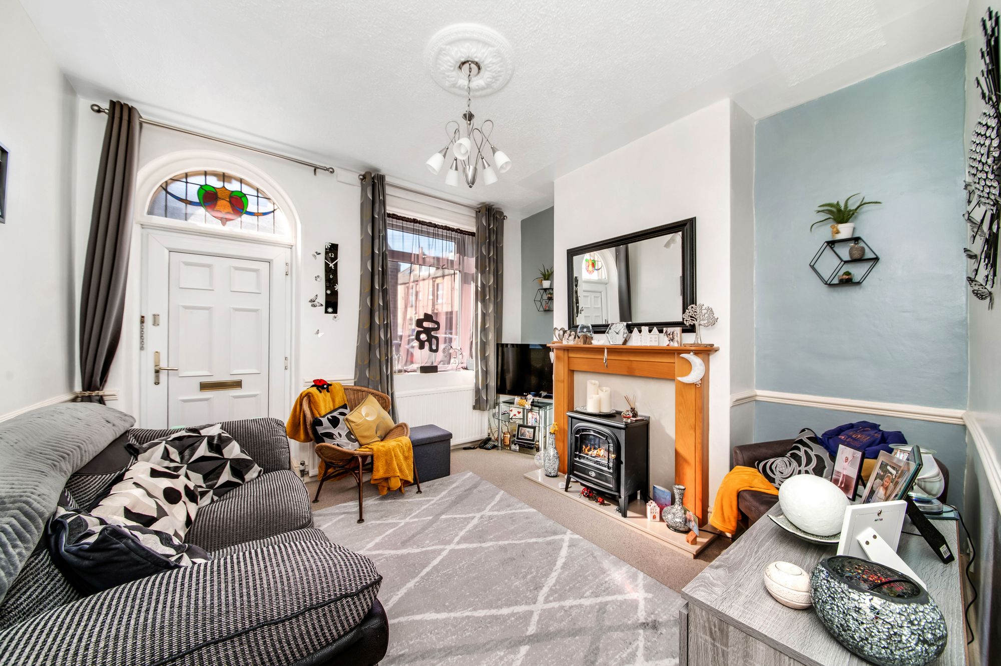 Entrance gained via uPVC door with a decorative vitraux window above, into living room.