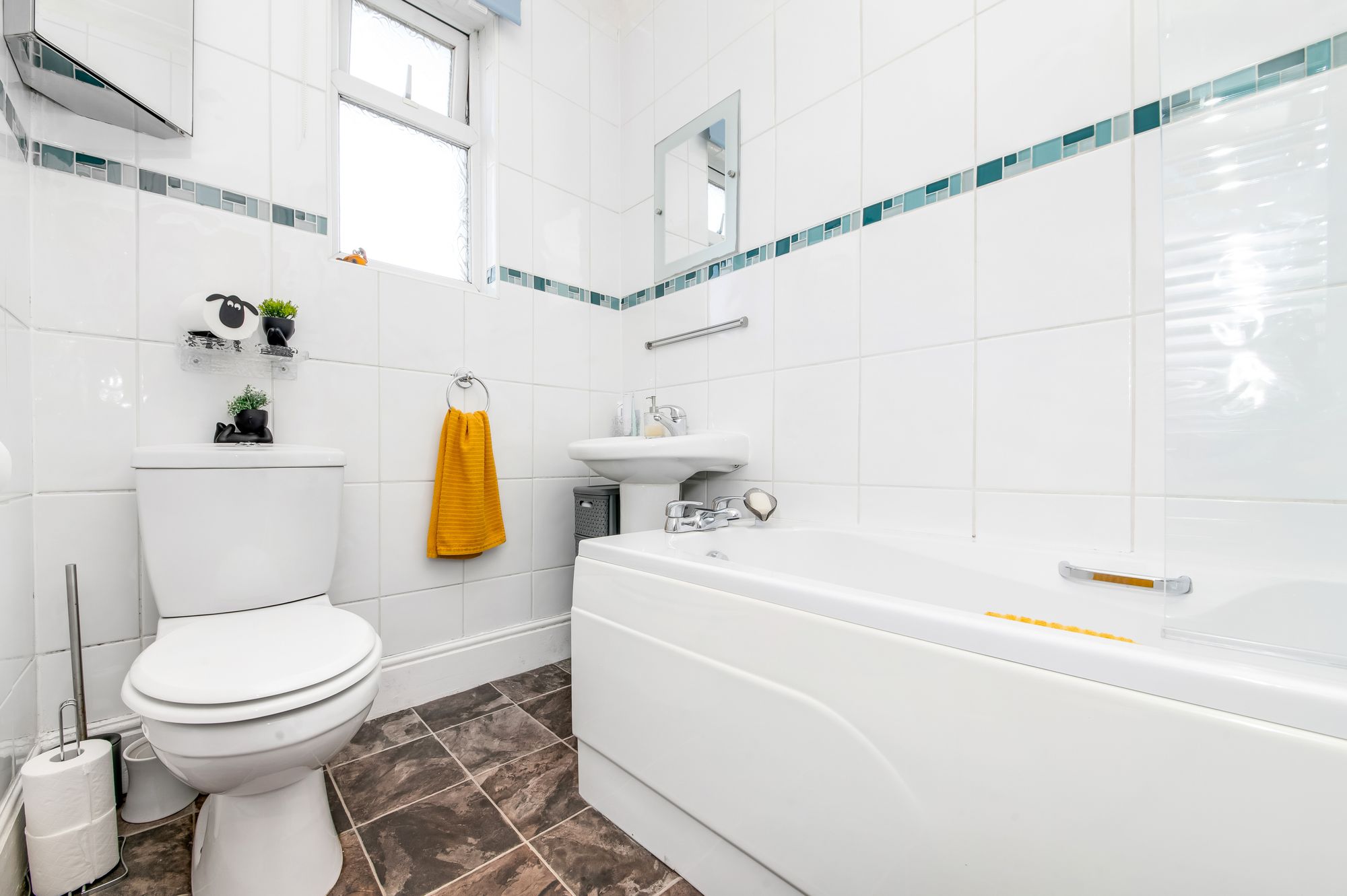 BATHROOMComprising a three-piece white suite in the form of close coupled w/c, pedestal basin with chrome mixer tap over and bath with chrome taps and separate electric Triton shower over with shower attachment and glazed shower screen. There are inset ceiling spotlights, full tiling to walls and laminate flooring chrome towel rail/radiator and obscure uPVC double glazed window.