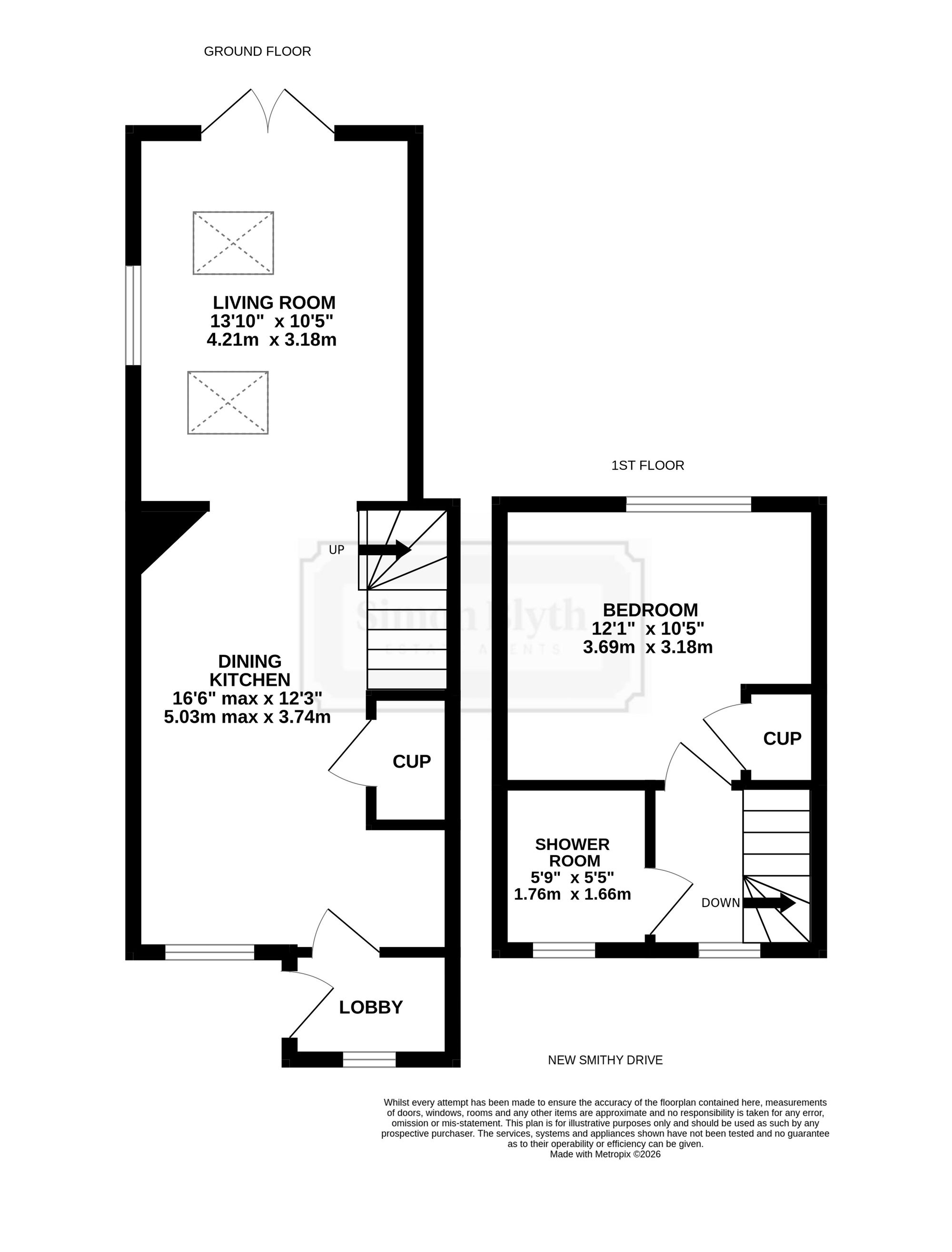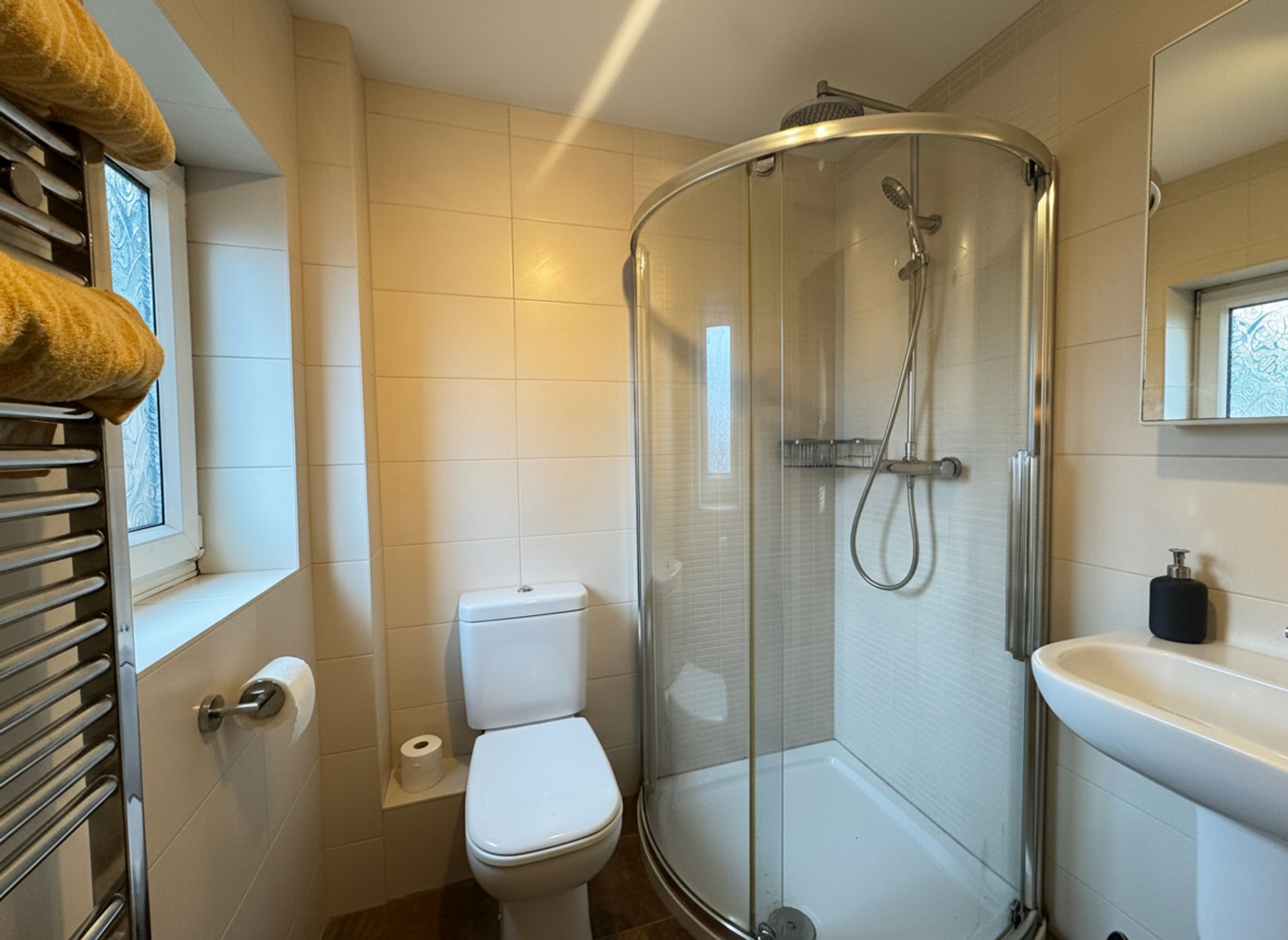 SHOWER ROOMComprising a two-piece white suite in the form of a close-coupled W.C. and pedestal basin with chrome mixer taps, together with a separate shower enclosure fitted with a mains-fed shower and shower attachment. The room also benefits from a ceiling light, chrome heated towel rail/central heating radiator, tiling to the walls and floor, and a uPVC obscure double-glazed window to the front elevation.