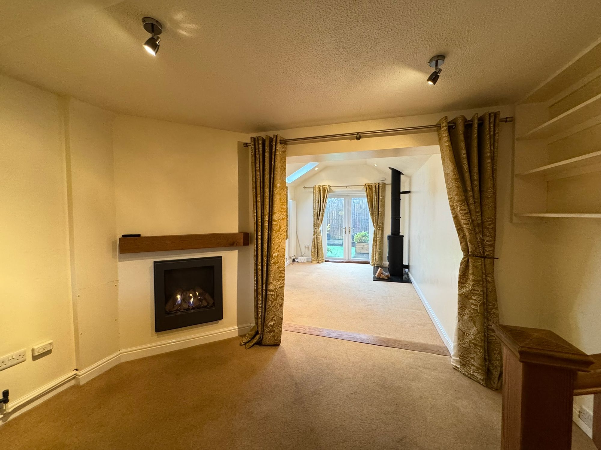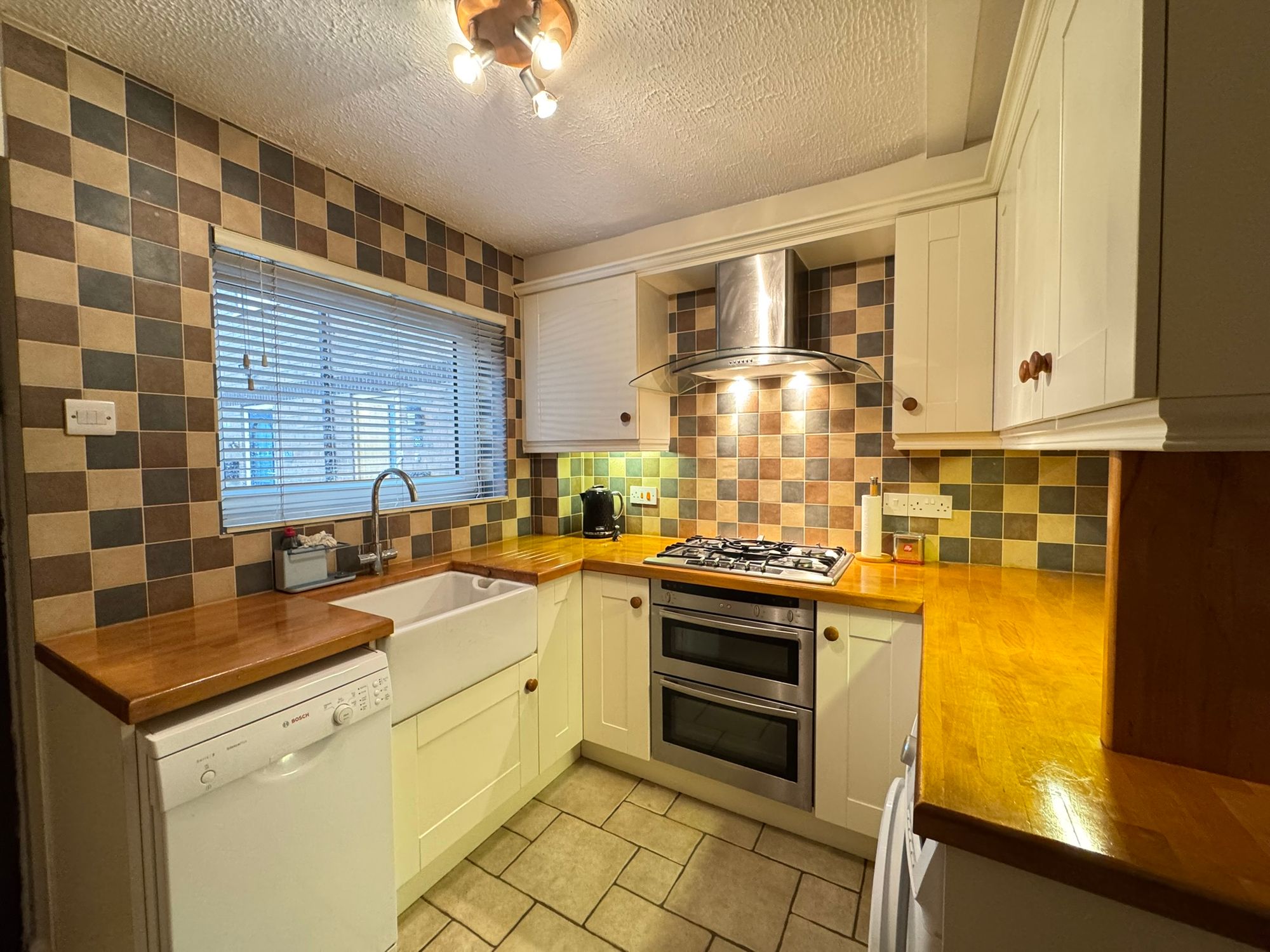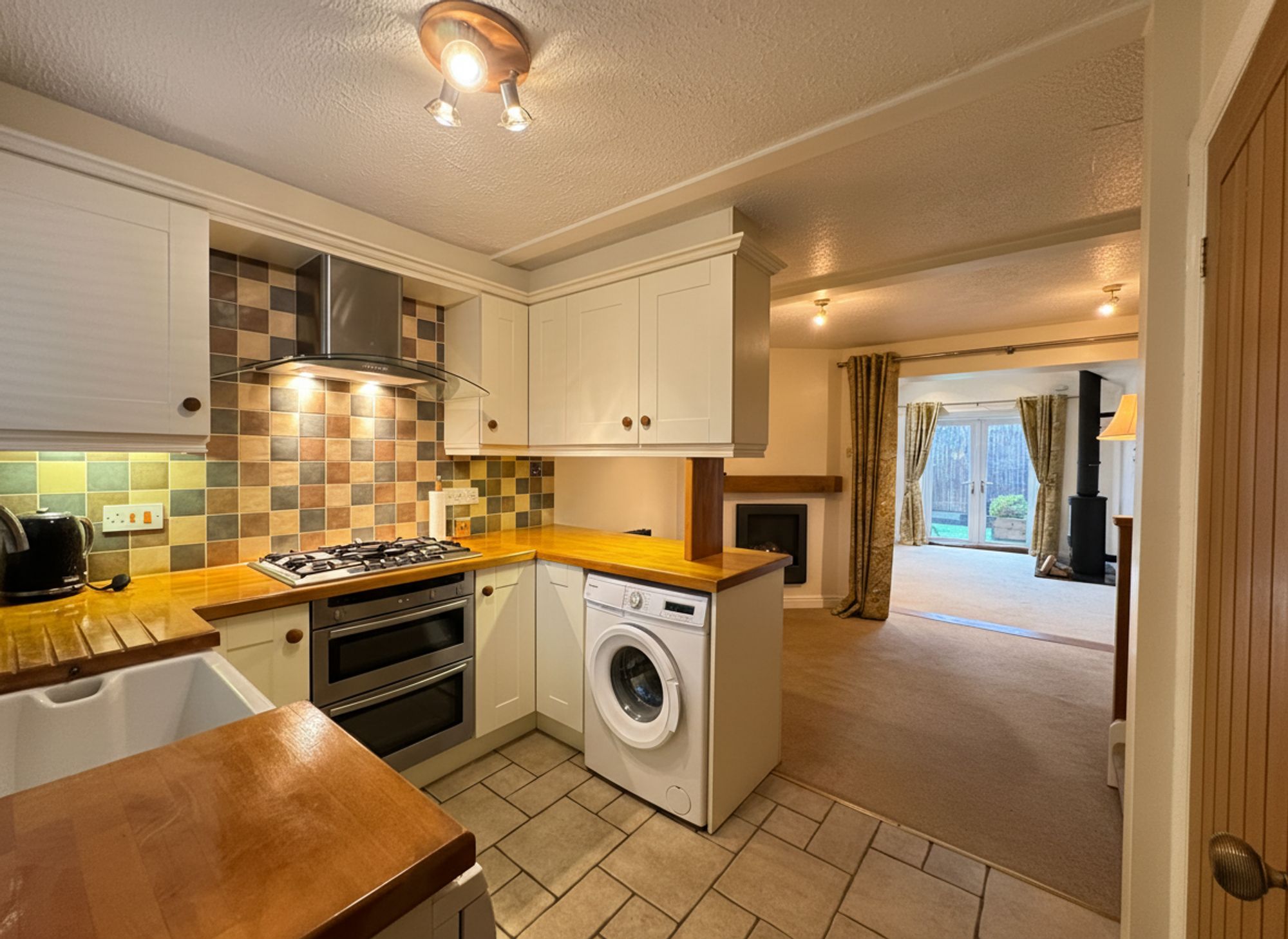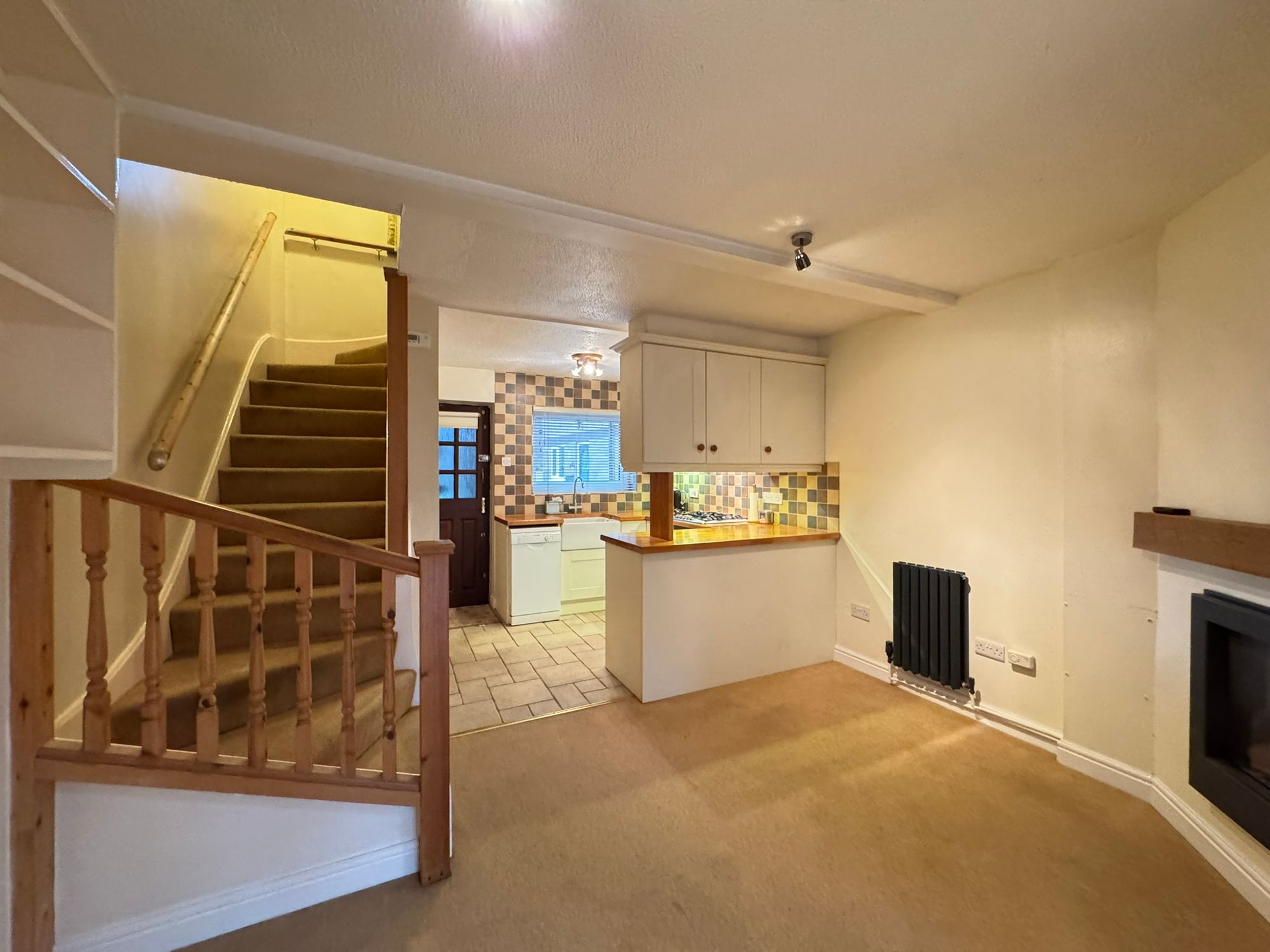 OPEN PLAN DINING KITCHENA spacious open-plan dining kitchen, thoughtfully divided into two distinct areas. The kitchen is fitted with a range of white wood shaker-style wall and base units, complemented by solid wood worktops and tiled splashbacks. There is space for a cooker with extractor fan over, space for a fridge, plumbing for a washing machine and dishwasher, and a Belfast-style sink with chrome mixer tap set beneath a uPVC double-glazed window to the front. The kitchen area benefits from a ceiling light, tiled flooring, and a door opening to an understairs cupboard providing useful storage. The room then opens into the dining area, which features a ceiling light, central heating radiator, and as its main focal point, a living flame gas fire with control operation, giving the space a cosy feel. A staircase with spindle balustrade rises and turns to the first-floor landing, while a further opening leads through to the lounge.