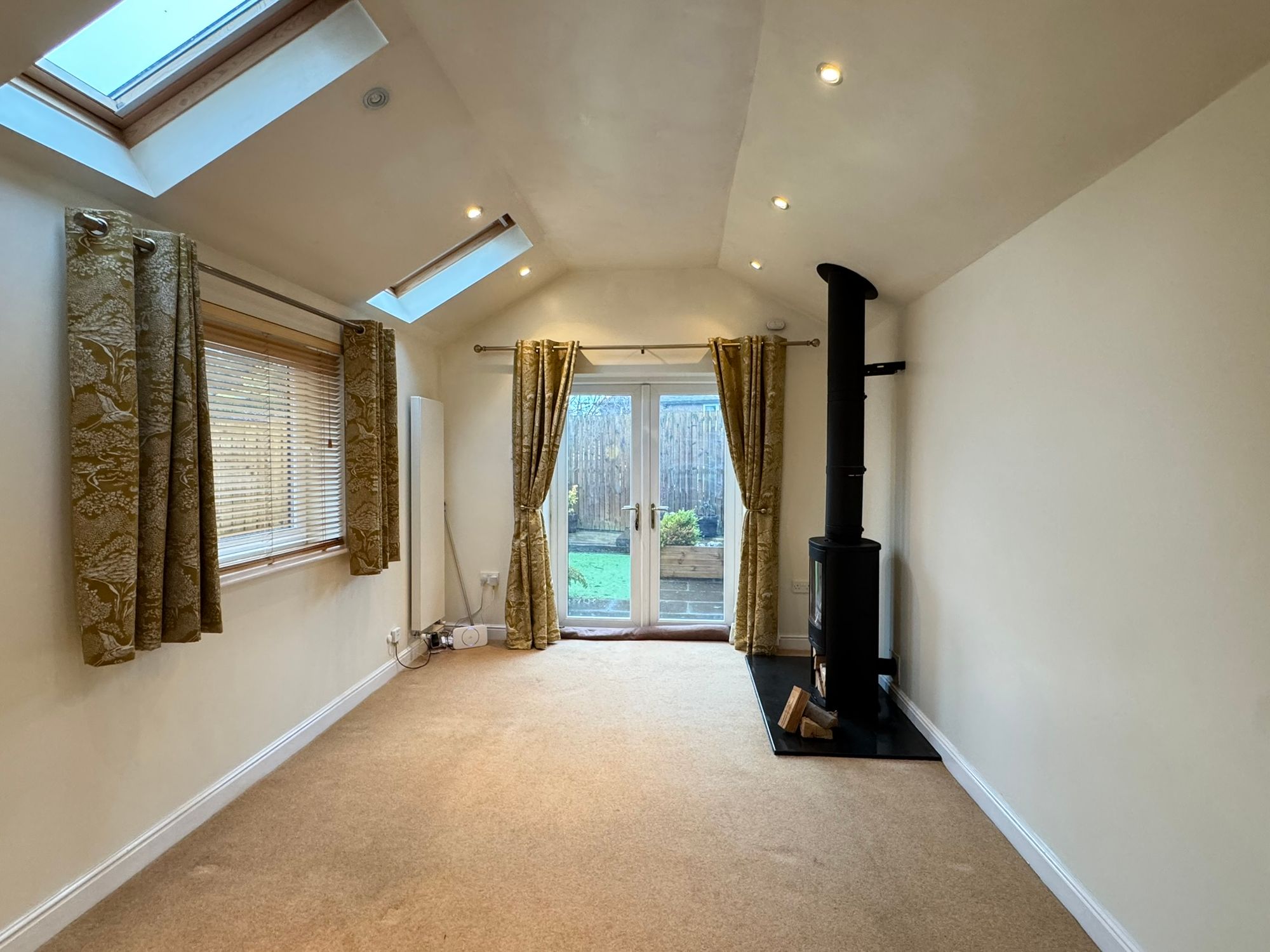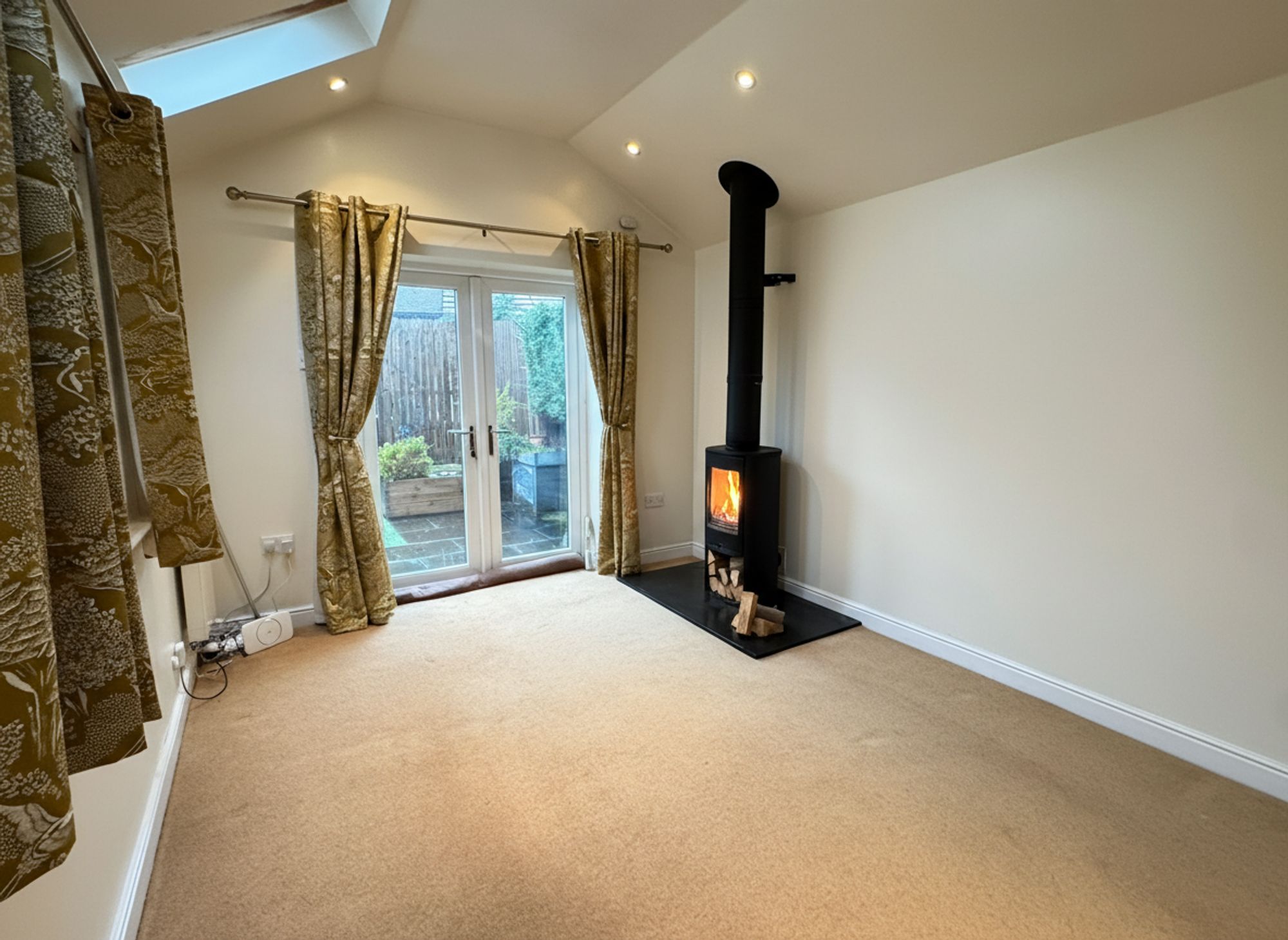 LOUNGEForming part of the property’s extension, this is a further spacious rear-facing reception room, with the main focal point being a Contura fireplace. An abundance of natural light is provided via uPVC twin French doors giving access to the private rear garden, a uPVC double-glazed window to the side, and two Velux roof windows. The room also benefits from inset ceiling spotlights and two contemporary central heating radiators.