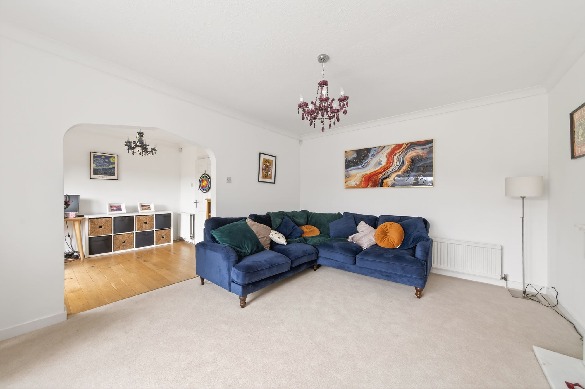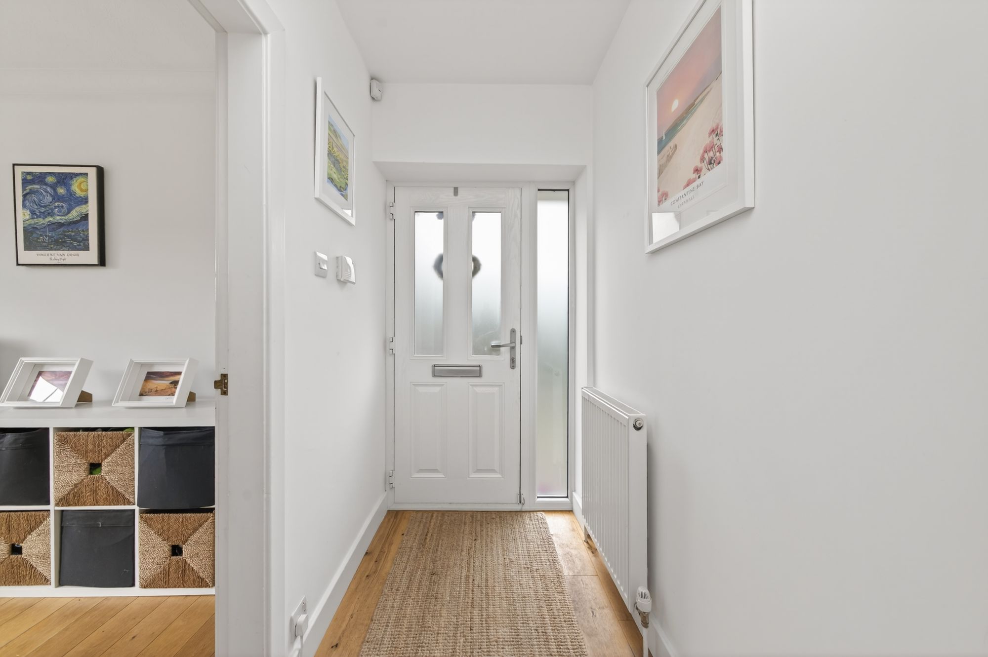 Enter into the property through a double-glazed, composite door with obscure glazed inserts and an adjoining double-glazed window with obscure glass. The entrance hall features hardwood flooring, a ceiling light point, a radiator, multi-panel doors providing access to the open-plan dining kitchen and the home office which is open plan to the living room, and a carpeted staircase with wooden banister proceeding to the first floor.