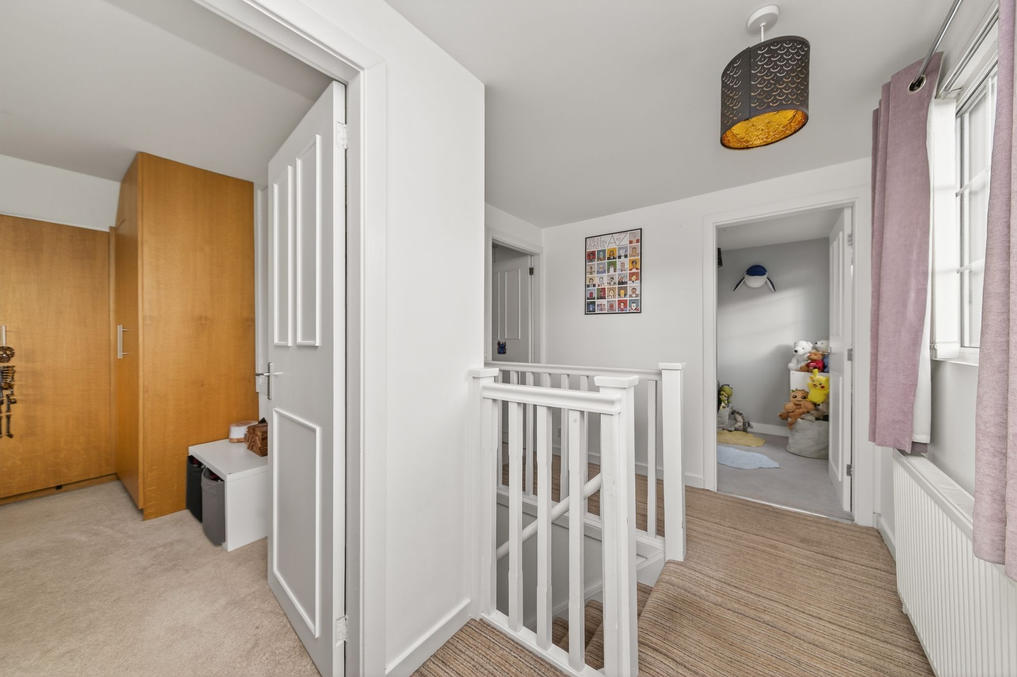 FIRST FLOOR LANDINGTaking the staircase from the entrance hall, you reach the first floor landing, which features a bank of double-glazed windows to the side elevation, a ceiling light point, a radiator, a wooden banister with chamfered spindle balustrade over the stairwell head, and multi-panel doors providing access to three bedrooms and the house bathroom.