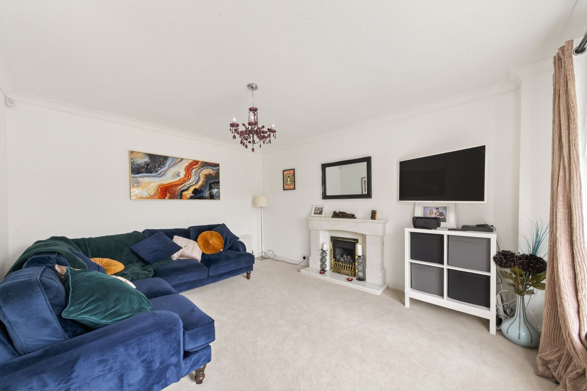 The lounge is a generously proportioned, light and airy reception room which features a double-glazed bay window to the rear elevation, taking advantage of fabulous, open-aspect views. There is decorative coving to the ceiling, a central ceiling light point, a radiator, and the focal point of the room is the living flame effect gas fireplace with marble inset and hearth.
