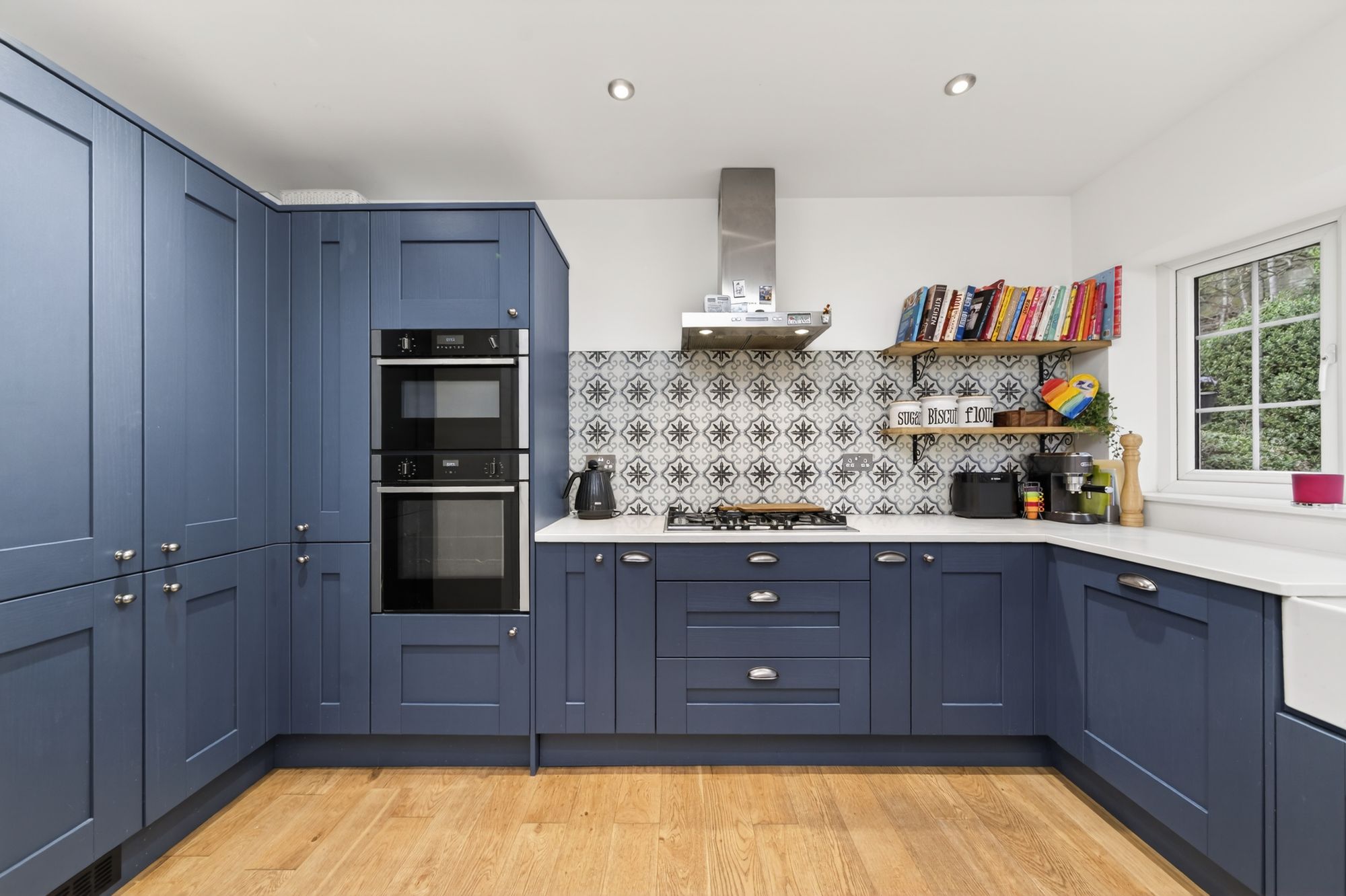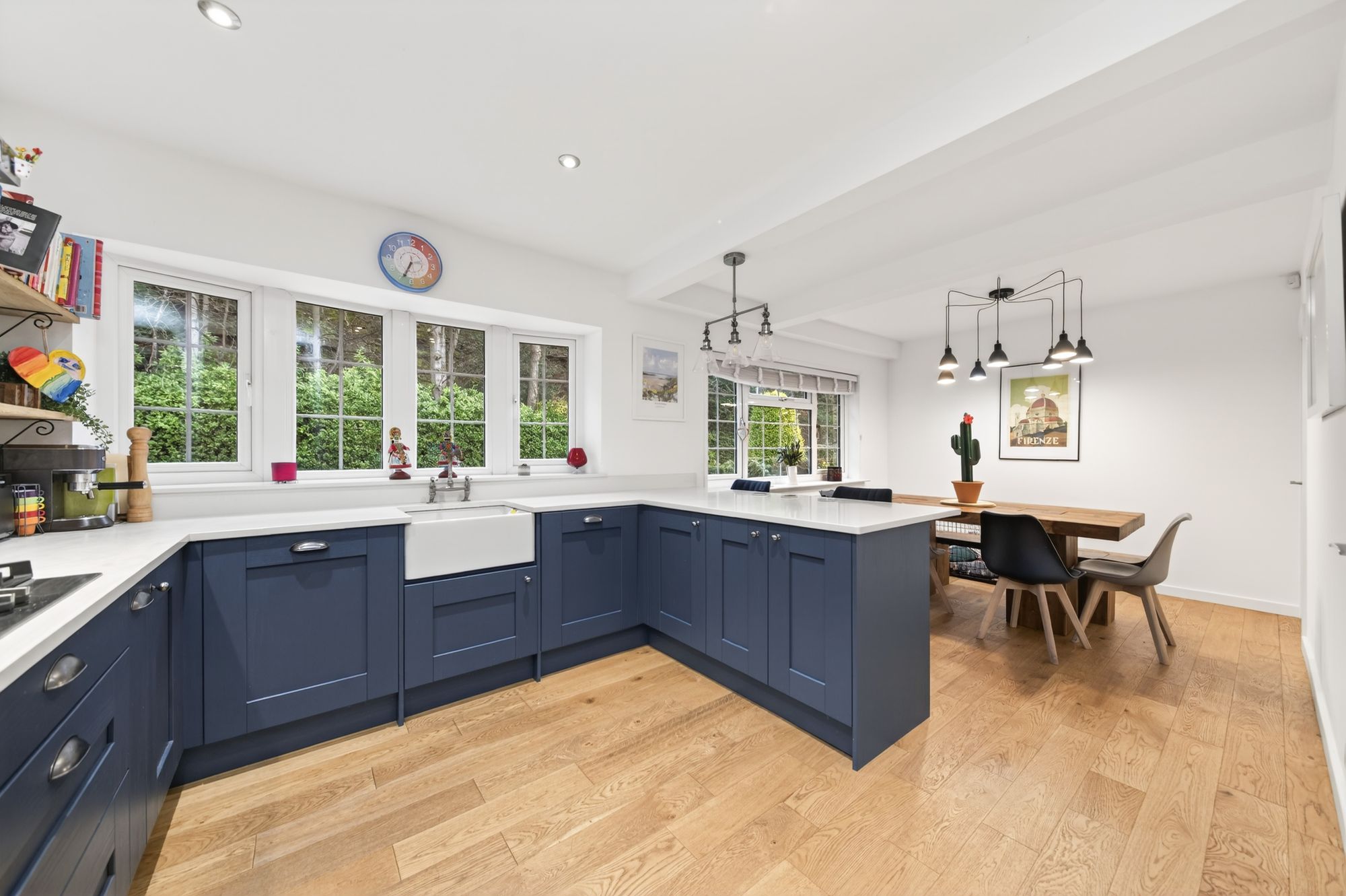 The kitchen area features a range of fitted wall and base units with shaker-style cupboard fronts and complementary quartz work surfaces over, which incorporate a Belfast ceramic sink unit with brushed chrome mixer tap. There are built-in appliances, including a five-ring gas hob with Hotpoint cooker hood over, a waist-level NEFF oven, a shoulder-level microwave oven, a fridge freezer unit, a dishwasher, and a pull-out bin drawer. There are soft-closing doors and drawers, a breakfast peninsula with cupboards beneath and space for informal dining, attractive tiling to the splash areas with matching quartz upstand and sill, pull-out spice drawers, and corner carousel units. The dining area enjoys views across the property's front gardens and of the tree-lined outlook.