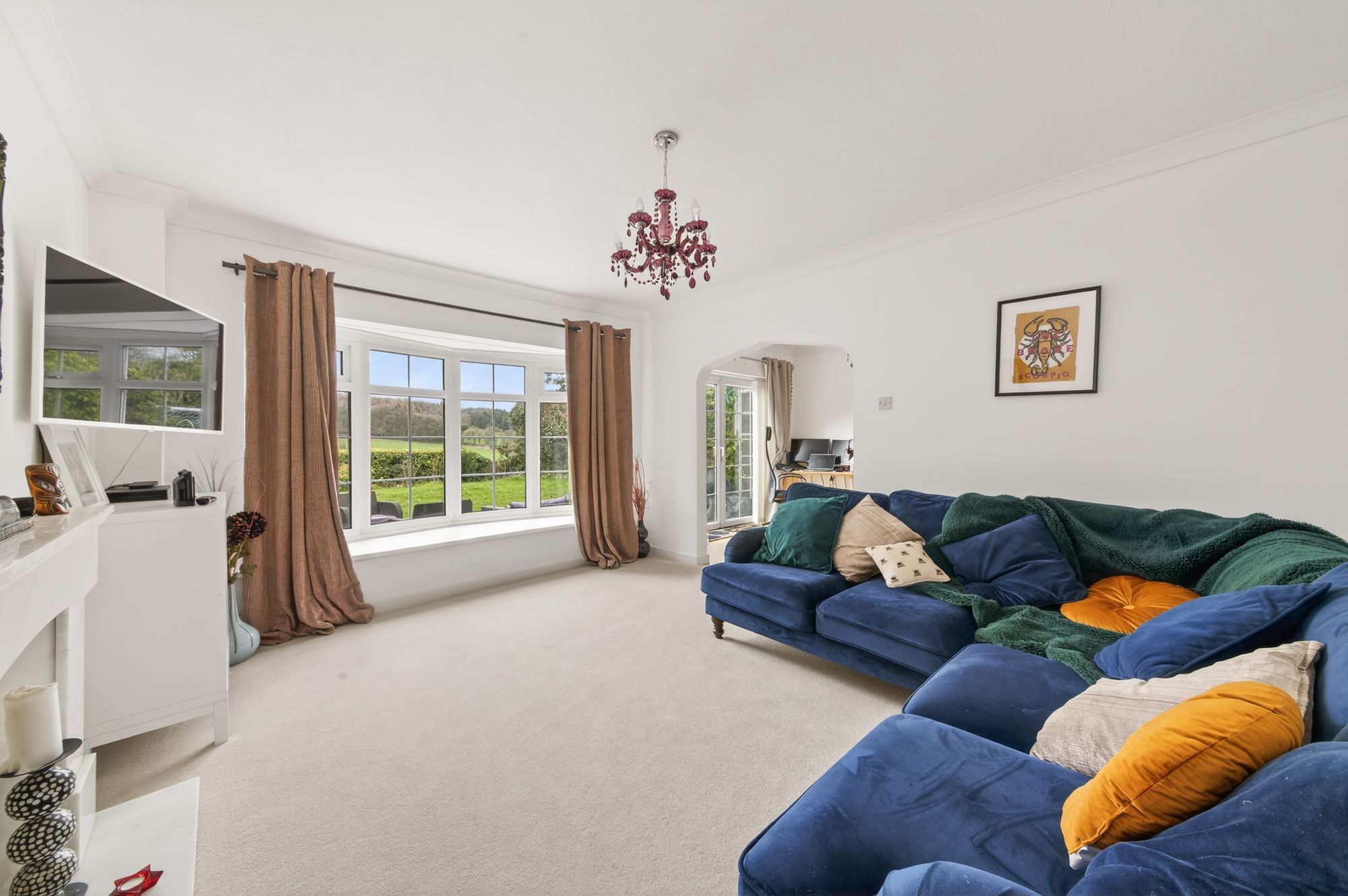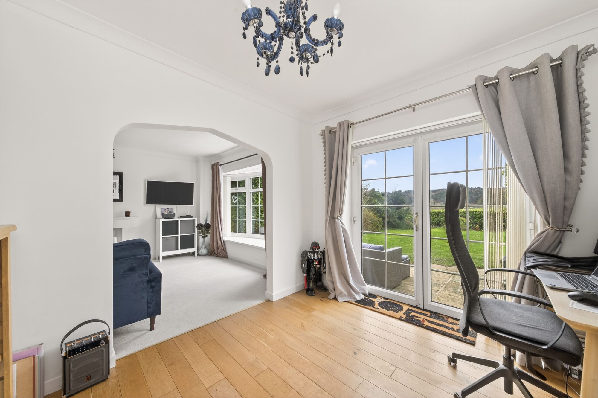 HOME OFFICEThe home office is a versatile space which features attractive hardwood flooring, decorative coving to the ceiling, a radiator, a ceiling light point, and a bank of double-glazed French doors to the rear elevation which provide seamless access to the gardens and pleasant, open-aspect views. A double arched doorway then leads into the lounge.
